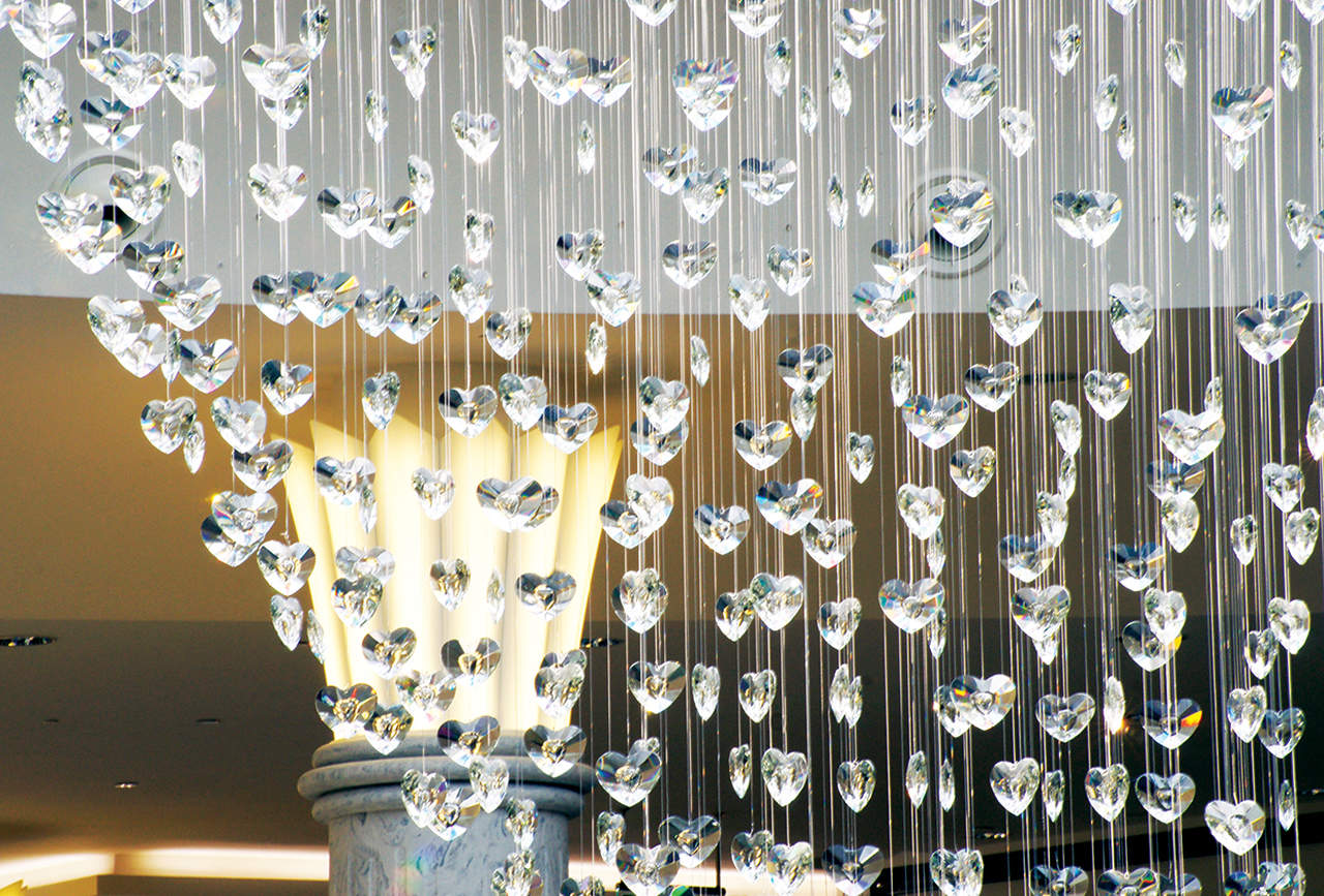 Another key feature is a breathtaking heart-shaped chandelier, meticulously crafted from 1,600 crystal-cut glass hearts, each suspended on fine stainless steel wires. Adjustable angled spotlights within the ceiling plate illuminate the glass, ensuring an enchanting display from every viewpoint.