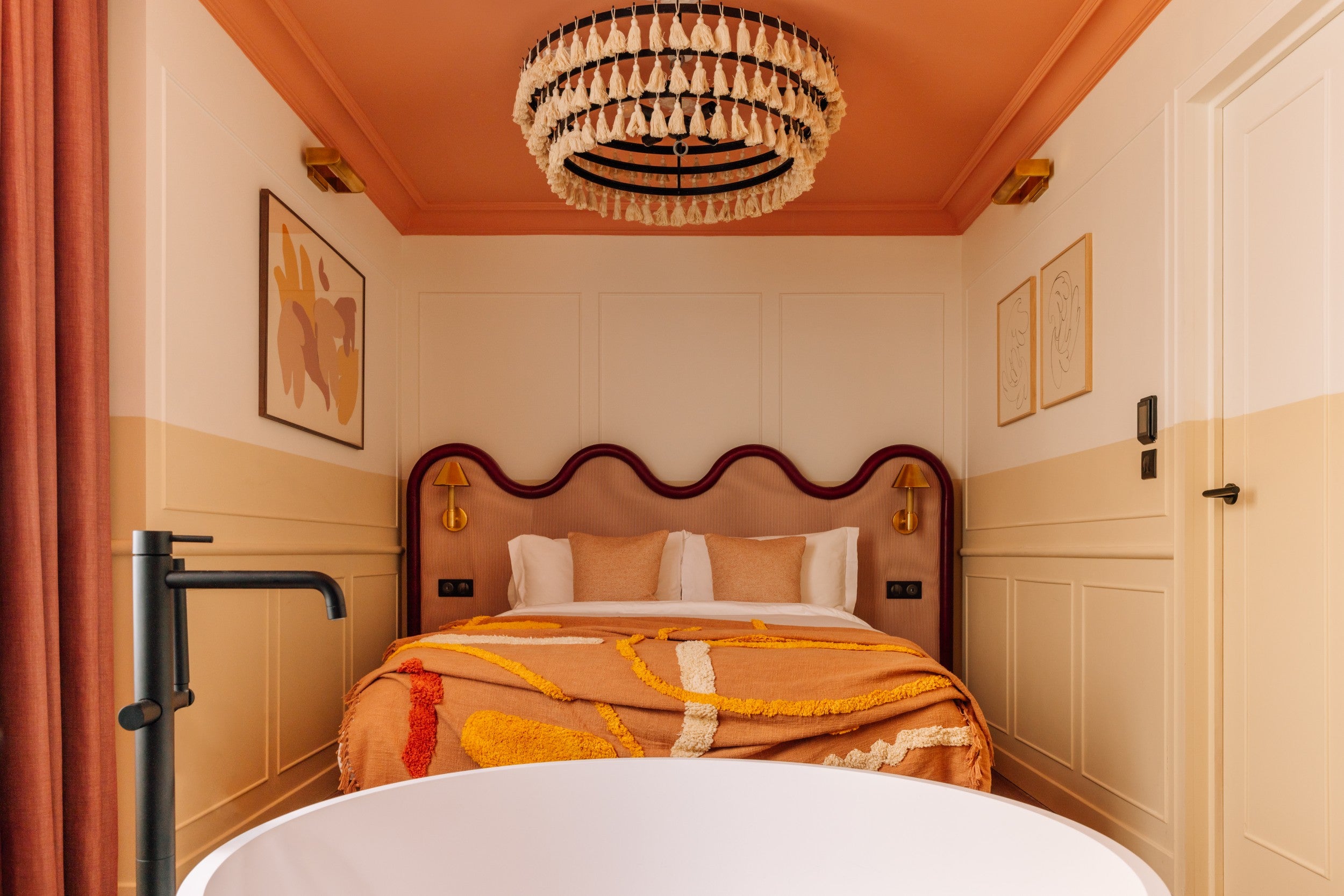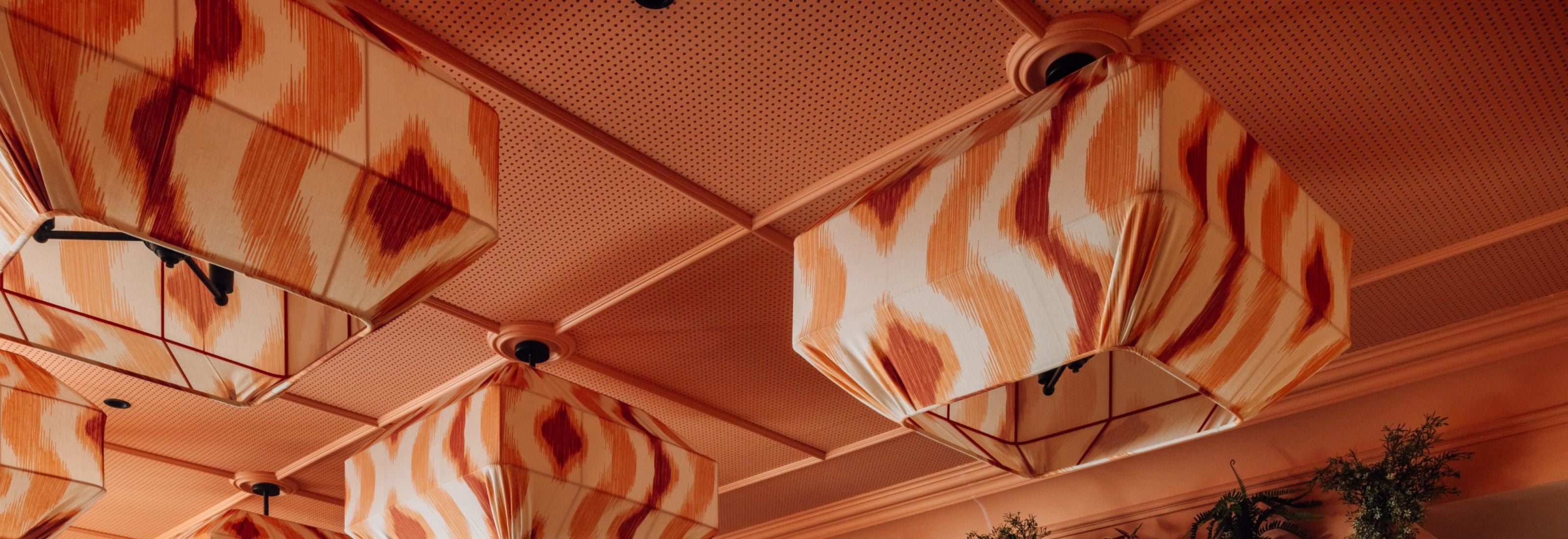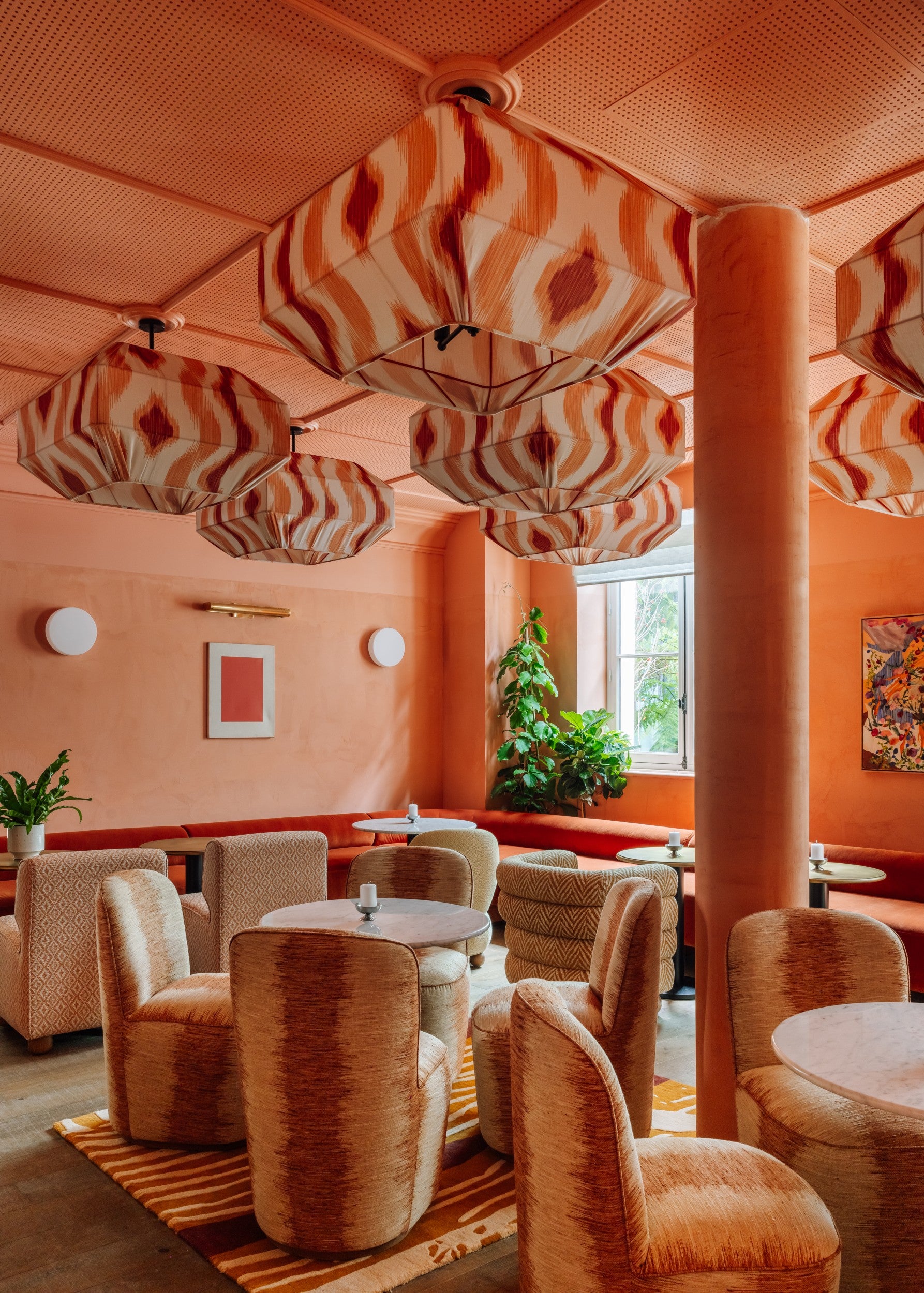 Suspended in dynamic arrangements across the bar and public spaces, oversized 80cm-wide fabric pendants bring warmth and playfulness to the design. These statement pieces feature gathered fabric at the tapered ends and smooth central sections, adding a gentle, organic aesthetic that enhances the relaxed atmosphere. The combination of orange and white tones creates a striking yet inviting contrast, setting the mood and inviting guests to unwind throughout the public spaces.