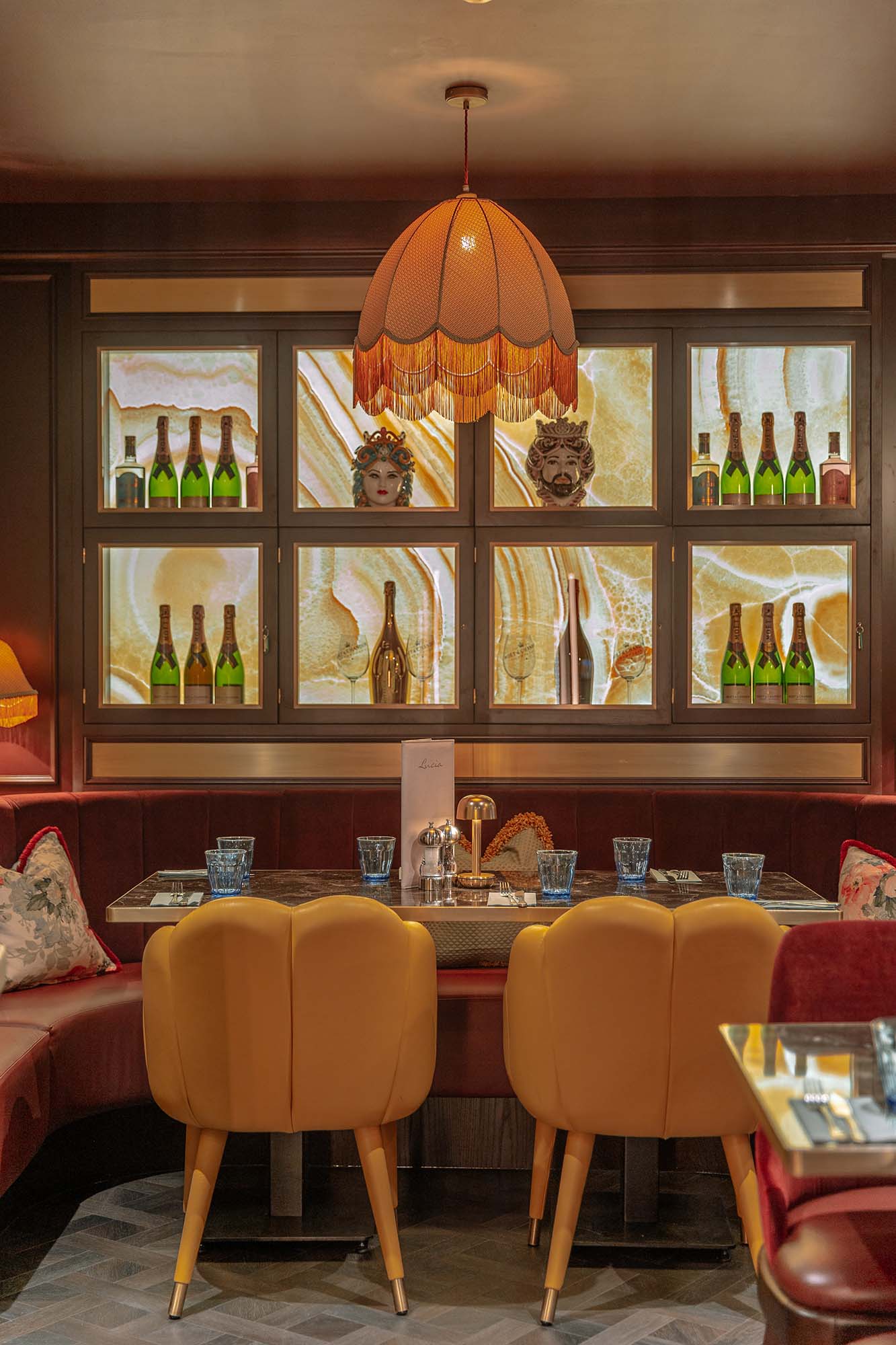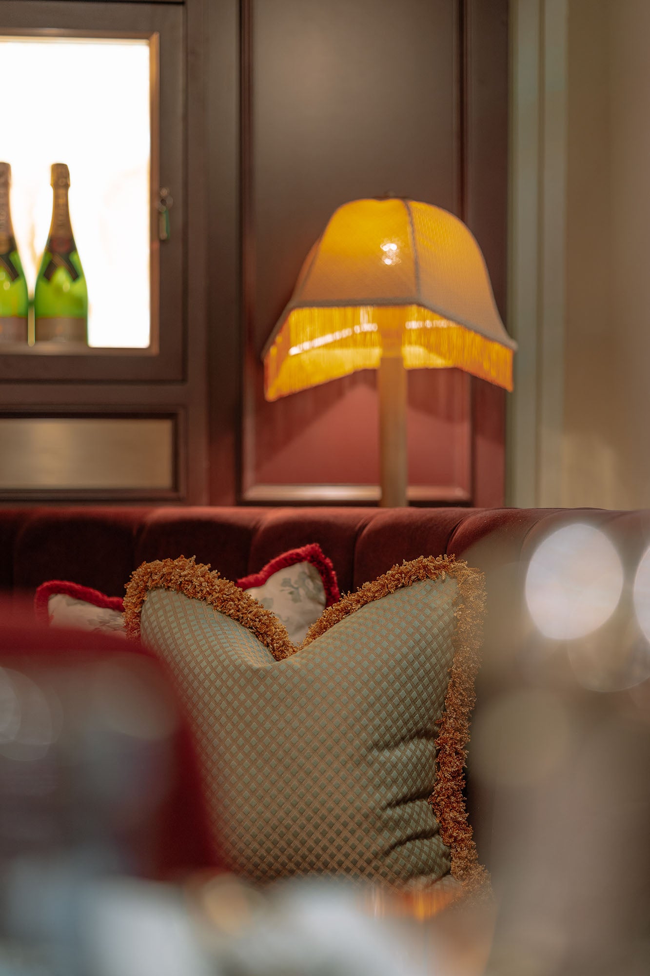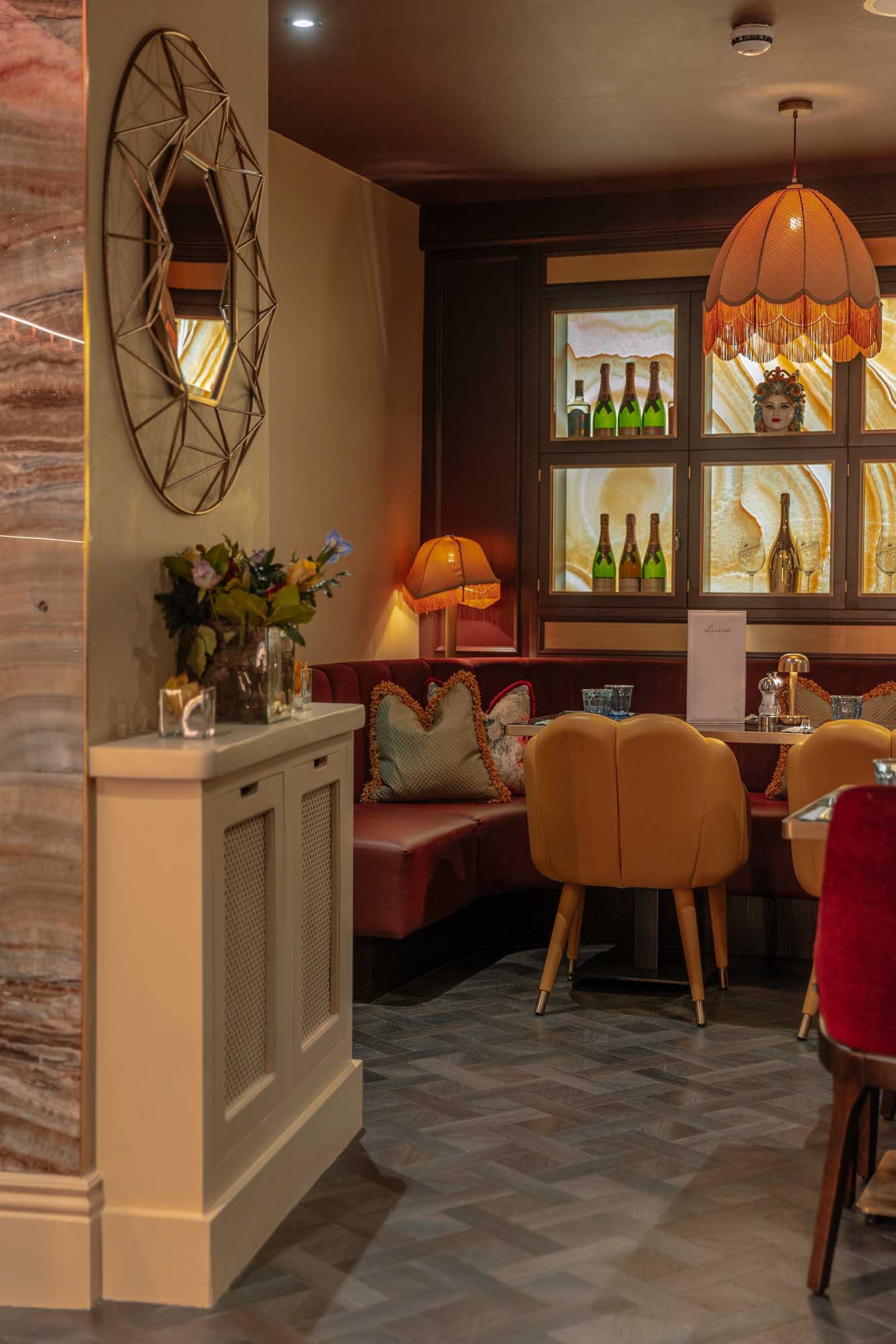 Within the restaurant, the booth seating areas are built into wooden cladding that houses our fixed light brass table lamps. Gorgeous hand-cut sloped shades are kept in place by elegant brass finials. Decorative tassels emphasise the semi-transparent gamboge Lelievre shades, intended to provide guests with a homely sense.