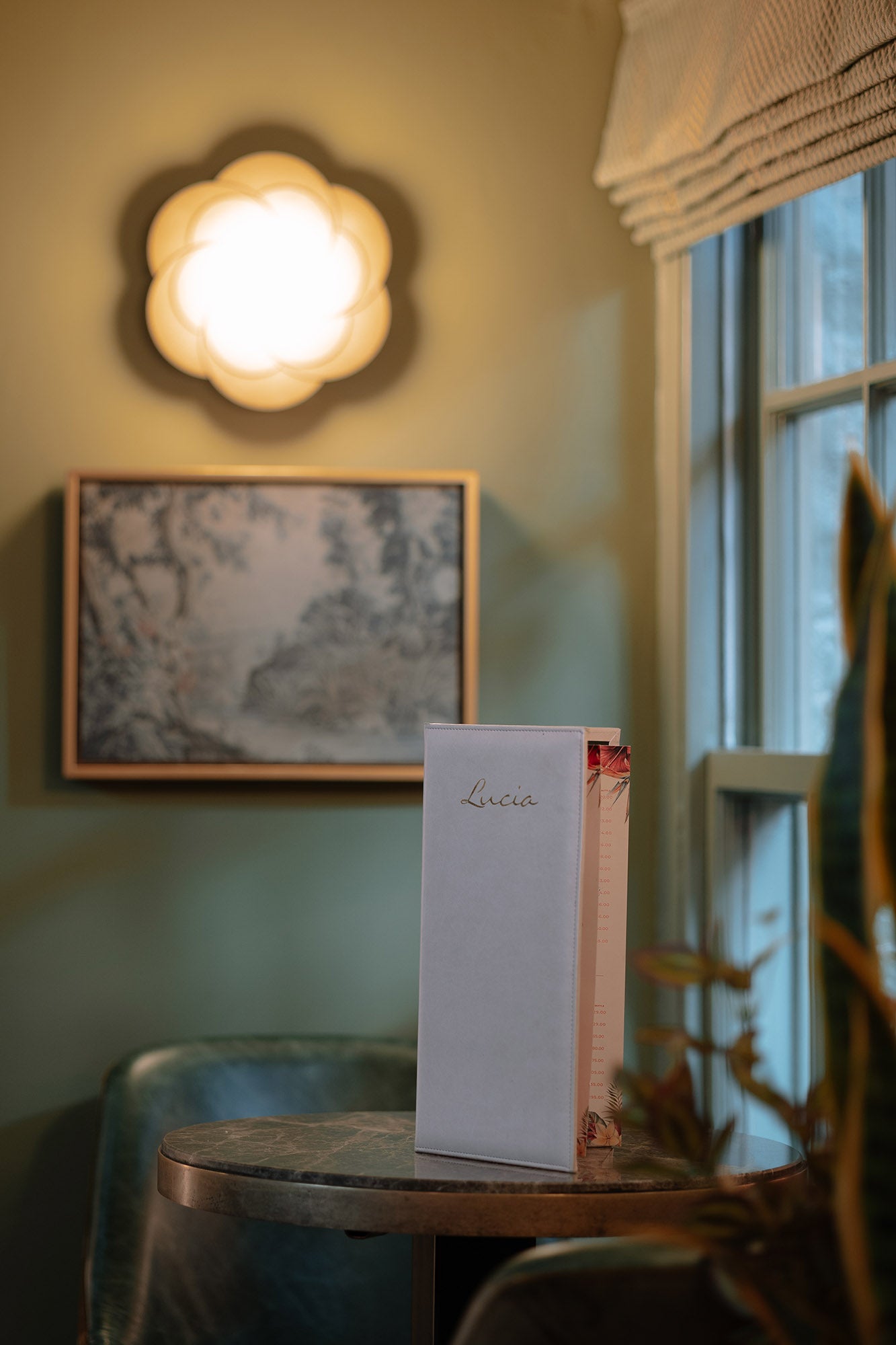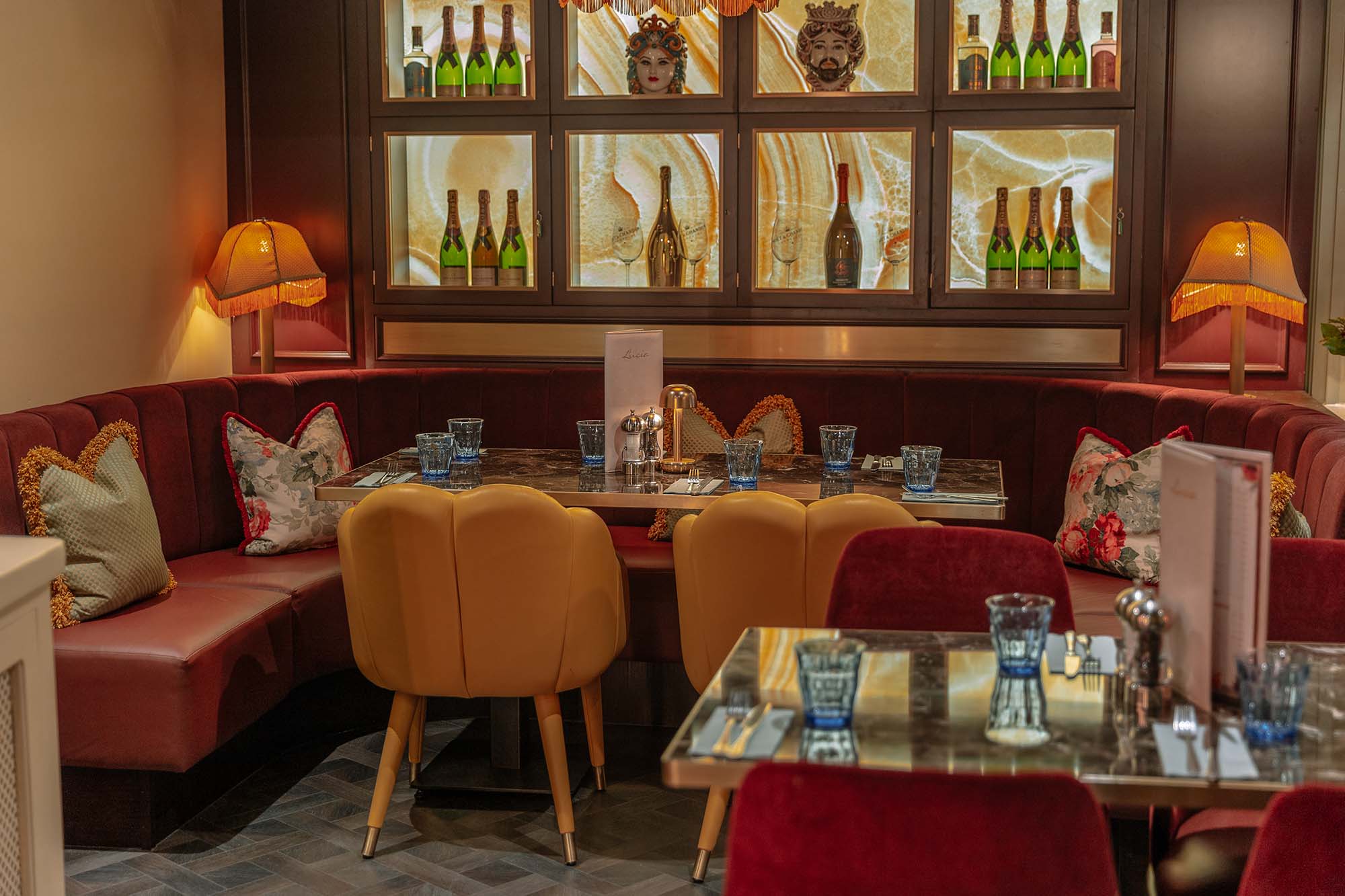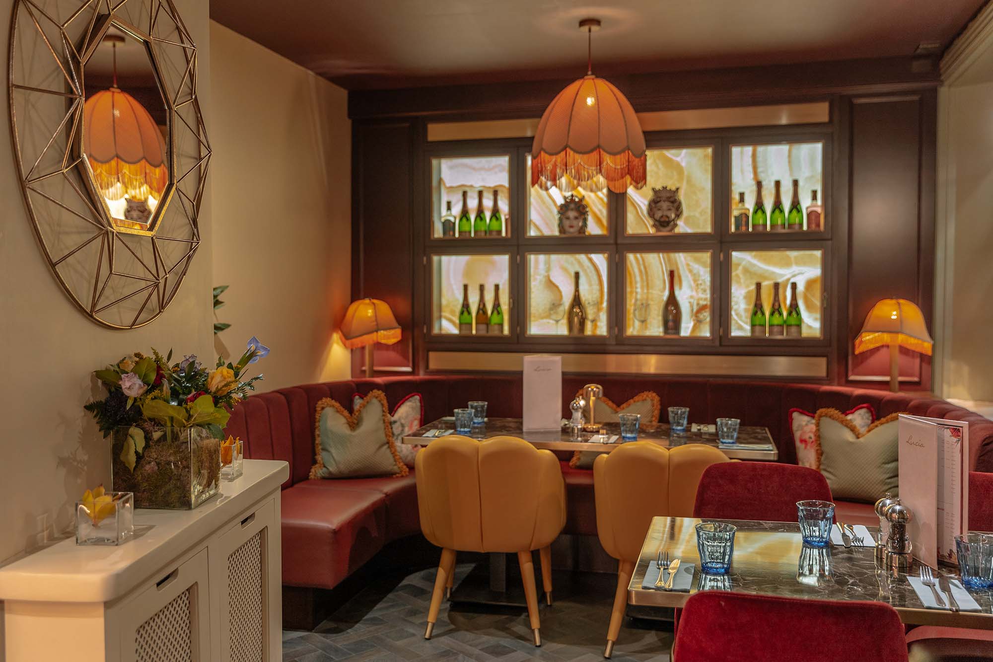 Within the restaurant, the booth seating areas are built into wooden cladding that houses our fixed light brass table lamps. Gorgeous hand-cut sloped shades are kept in place by elegant brass finials. Decorative tassels emphasise the semi-transparent gamboge Lelievre shades, intended to provide guests with a homely sense.