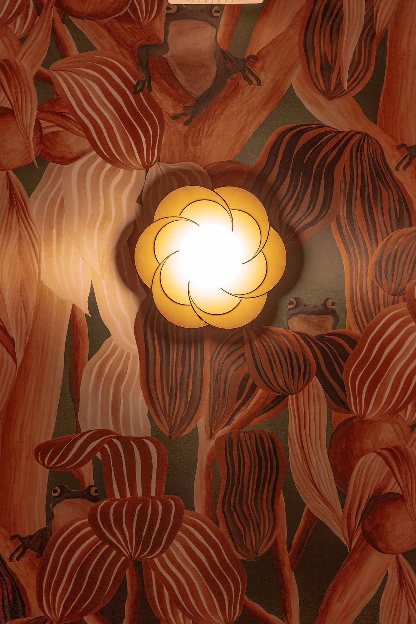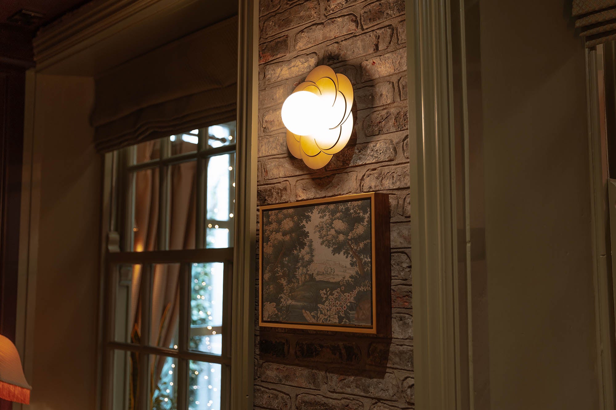 Finally, we pay homage to the botanical theme running throughout the venue with our flower-inspired wall sconce. The 3D-elevated laser-cut fixture comprises stacked, light antique brass plates that house a threaded glass globe.