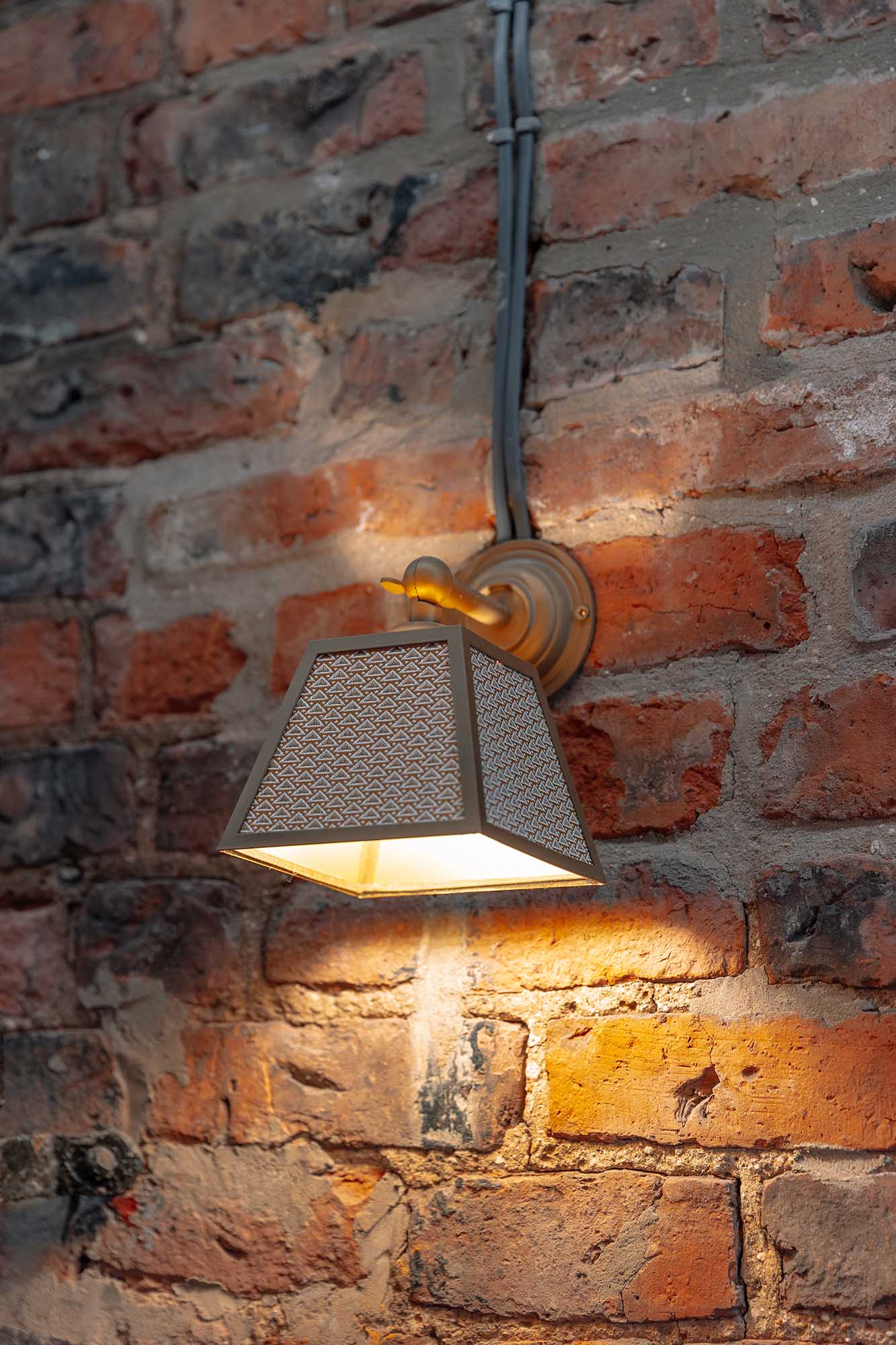 Rustic exposed brick walls are adorned with our lacquered light antique brass wall lamps, enhanced by hand-applied fabric panel inlays that bear intriguing geometric patterns. The gorgeously laser-cut fabricated brass shade is accentuated by the glow emitted from within. The shade is connected to a handcrafted elbow joint to allow flexibility of the lamp's intended direction.