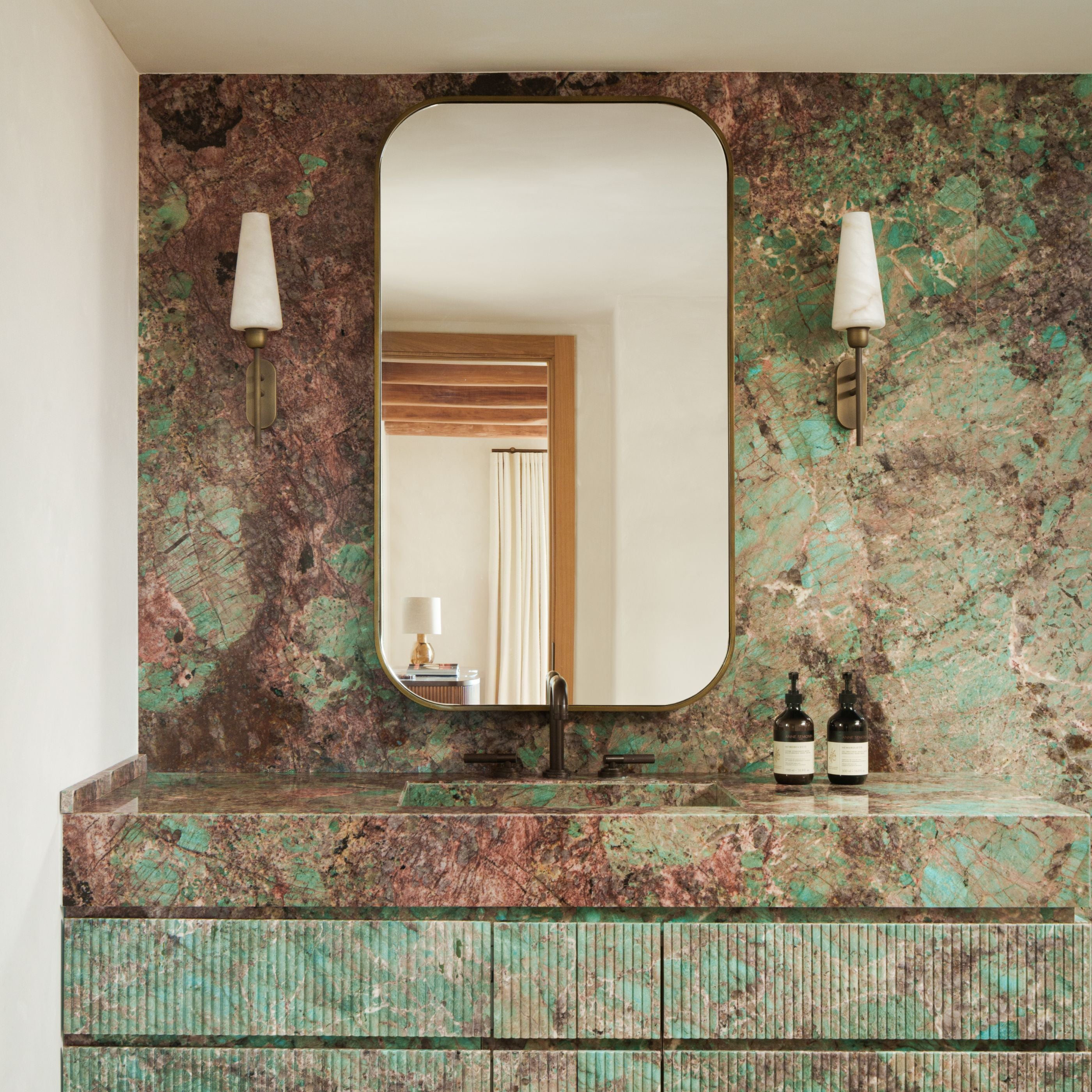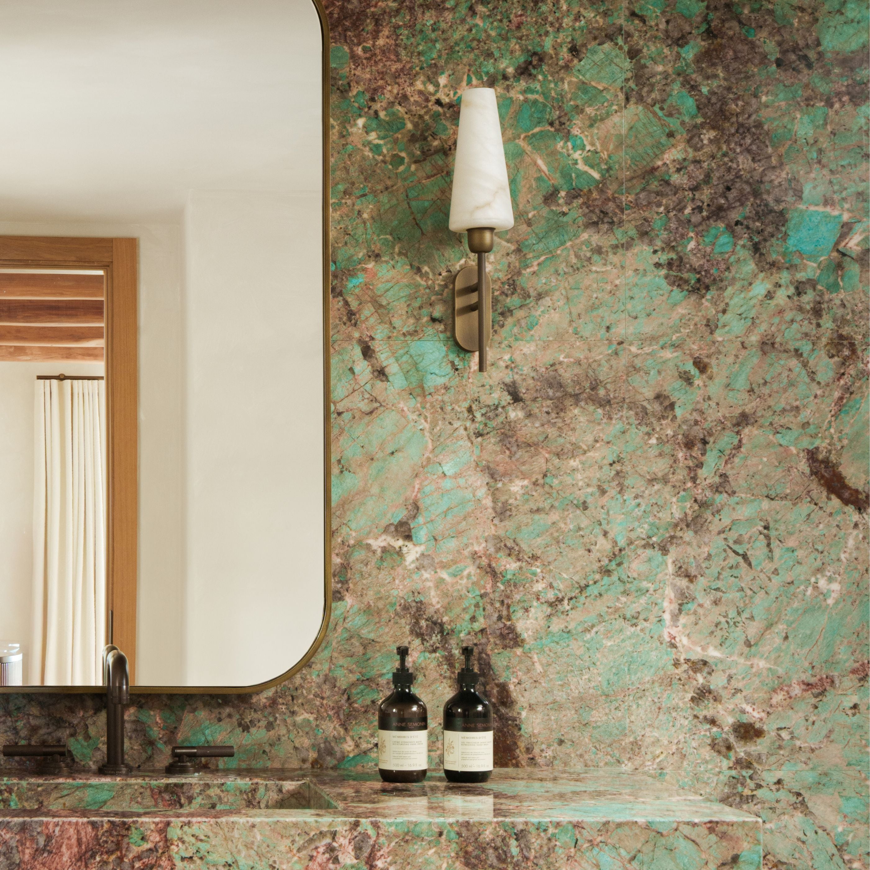 In the bathroom, our Lucian wall lights create a serene sanctuary. A vintage brass lozenge houses a turned alabaster conical shade, illuminating a space finished in vibrant turquoisenite stone. The effect is intimate and luxurious - the natural alabaster stone harmonises with the surfaces, demonstrating how thoughtfully designed lighting can elevate even the most functional spaces into moments of quiet indulgence.