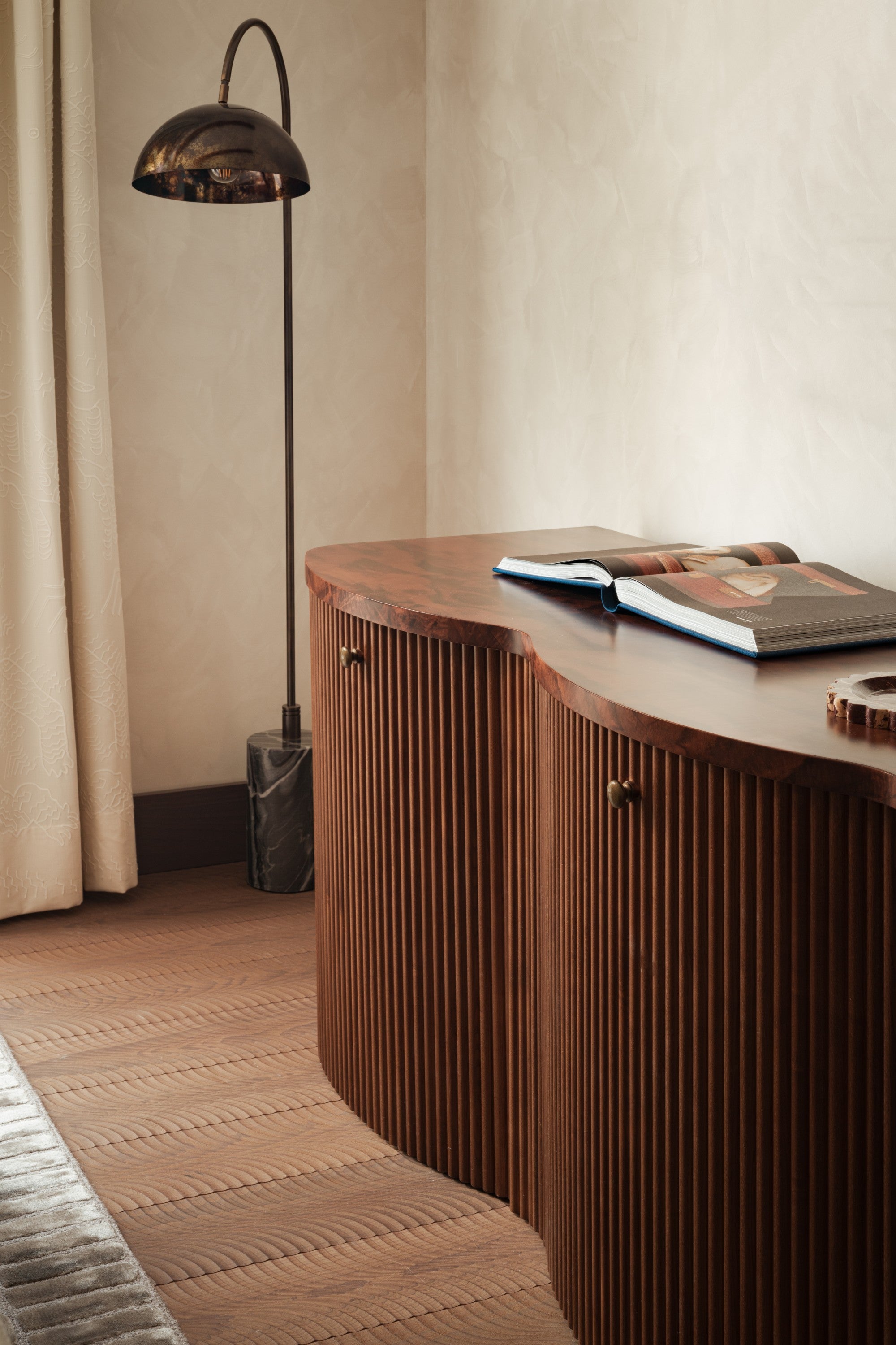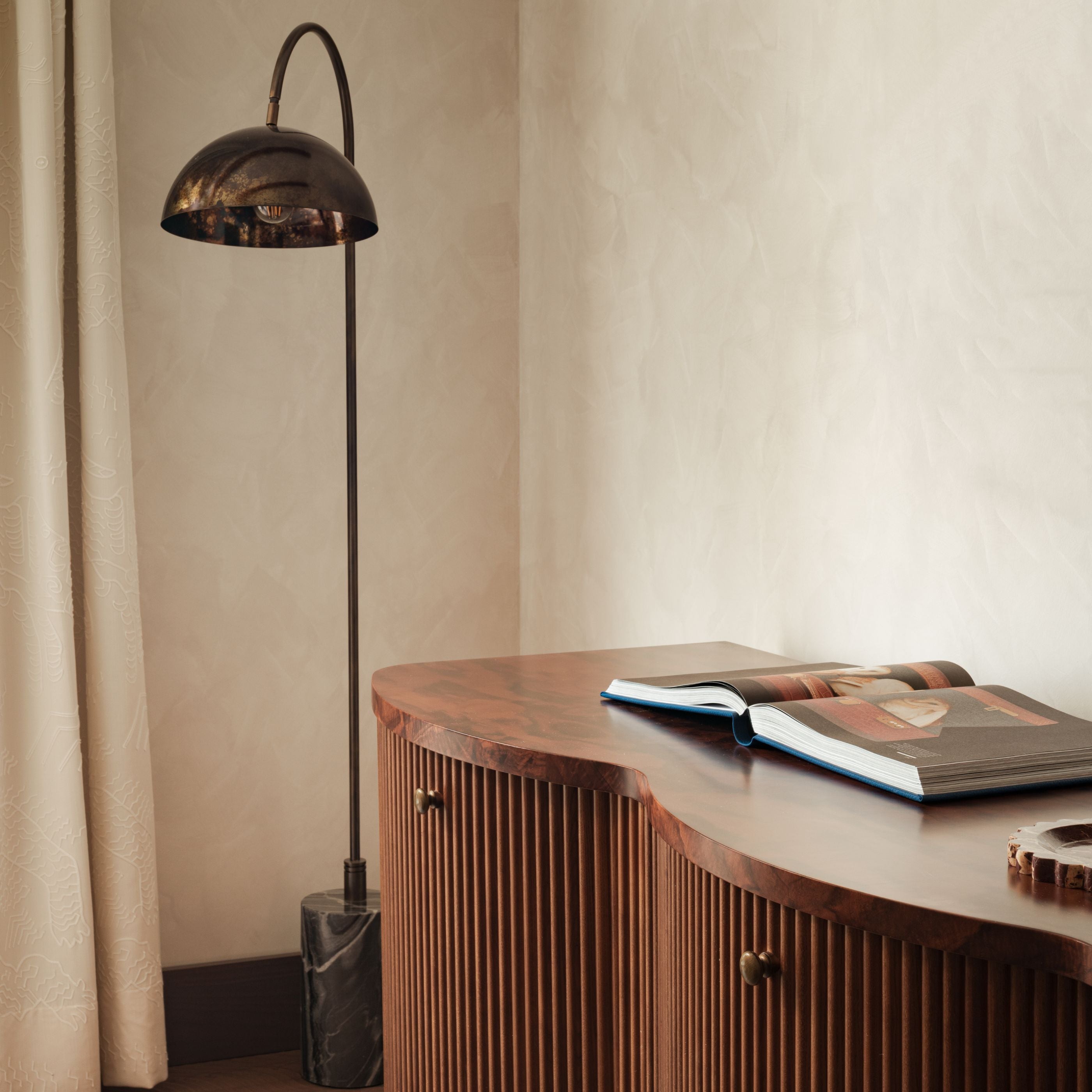 The master bedroom features the sculptural Rossen floor lamp from our Signature Collection, with a grey marble base, curved stem, and swivel metal dome head completed with one of our rich, specialist finishes. Set alongside pink accents and a fluted wood dresser, it reinforces a sense of calm, island-inspired sophistication.