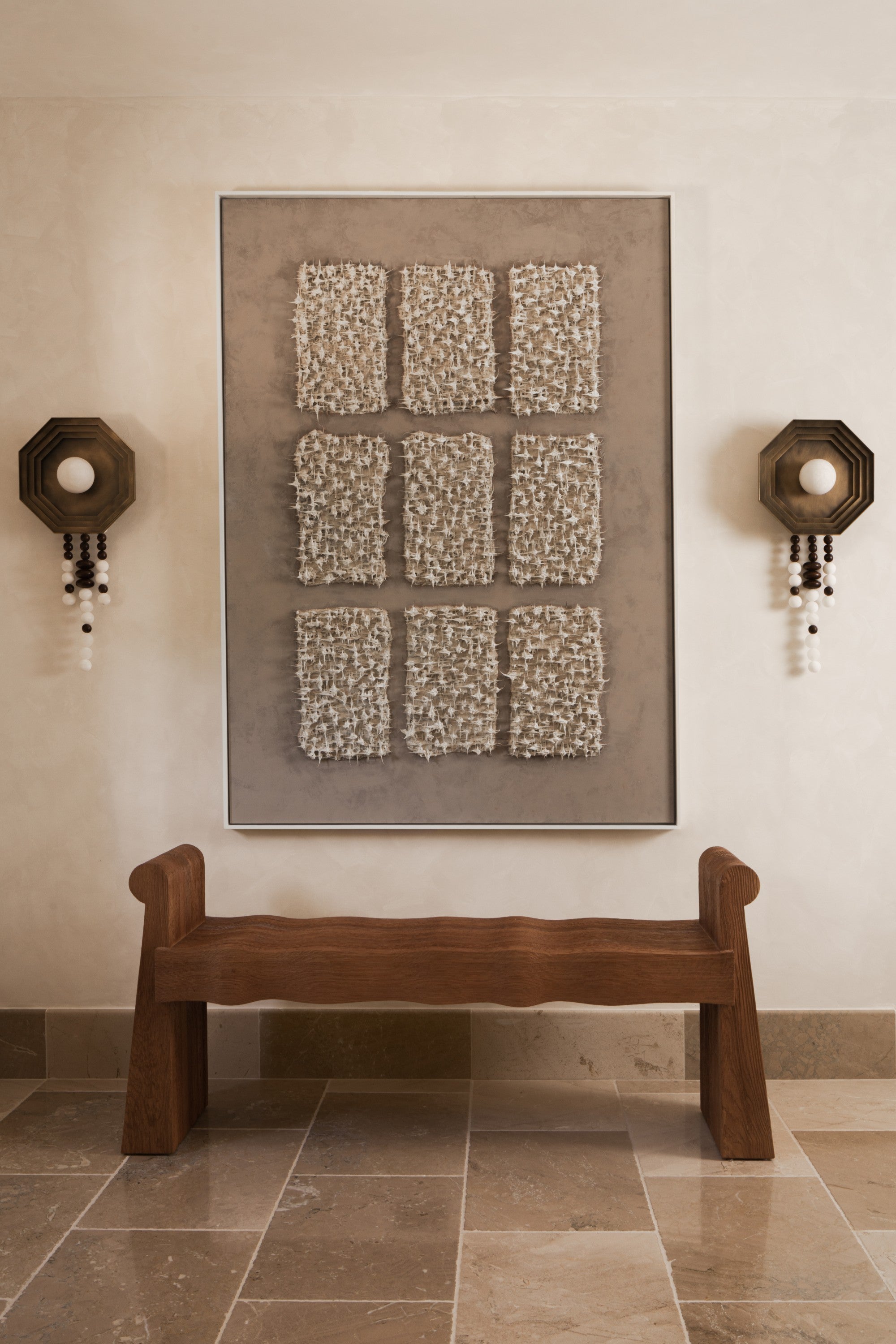 Bespoke wall lights bring material layering and fluidity to focus. Four layers of hexagonal brass form the base, centred by a white alabaster globe that softly diffuses light. Cascading strands of alabaster and oak-stained wood beads introduce movement and warmth, echoing the island’s natural charm while complementing the residence’s curated, textural interiors.