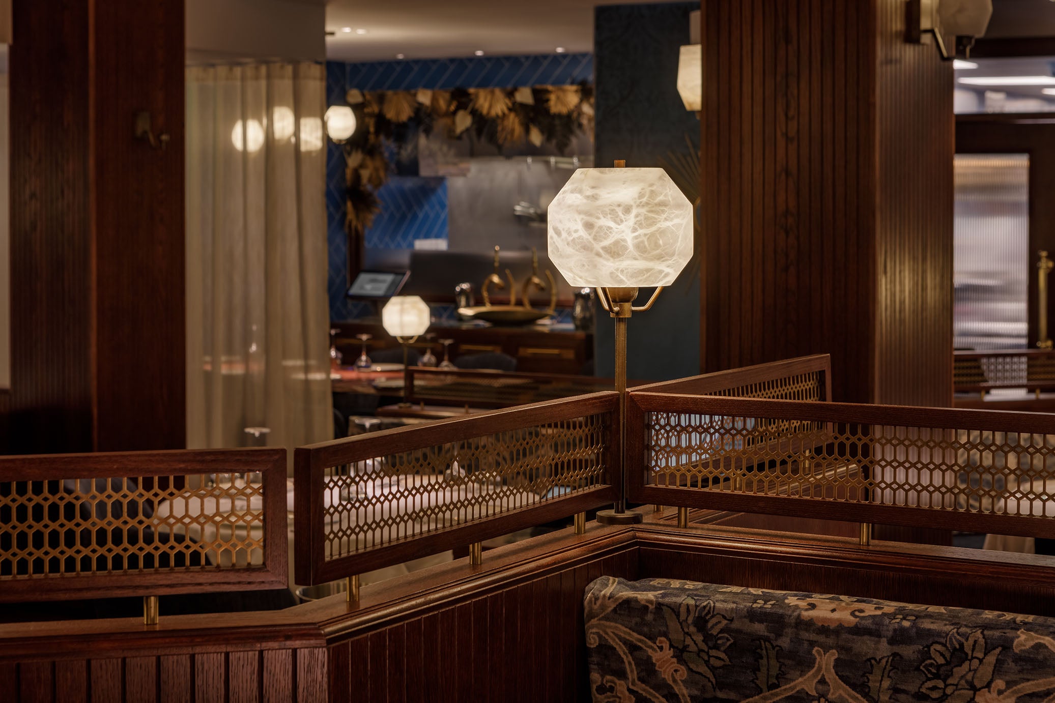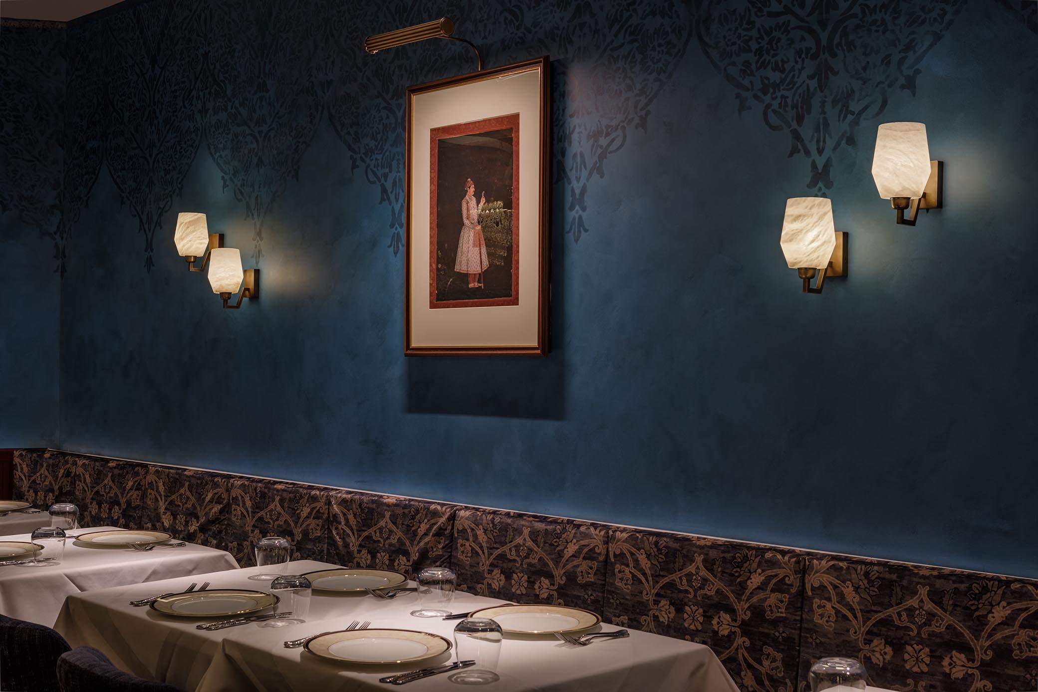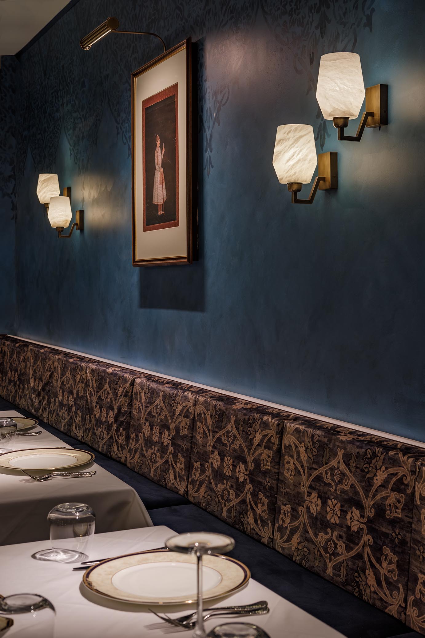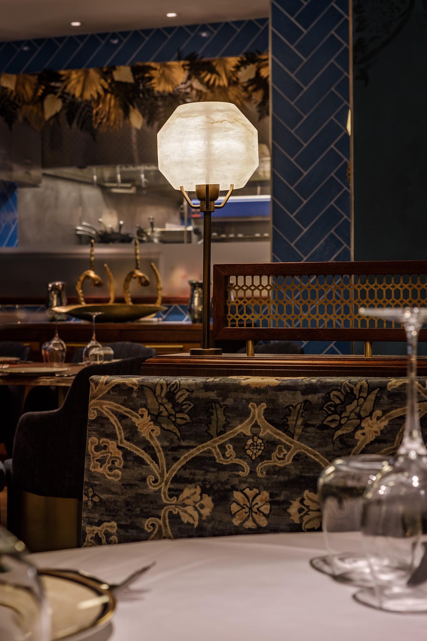The restaurant's walls are traditionally decorated with deep-blue wallpapers that have been etched with Henna-like patterns. The walls are delicately illuminated by several of our well-renowned Bresson wall lamps. The marvellously crafted alabaster shades are paired with backplates and support arms, both finished in old English brass. The wall sconces can be pointed vertically in either direction, making them one of the most versatile fixtures in our Signature Collection.
