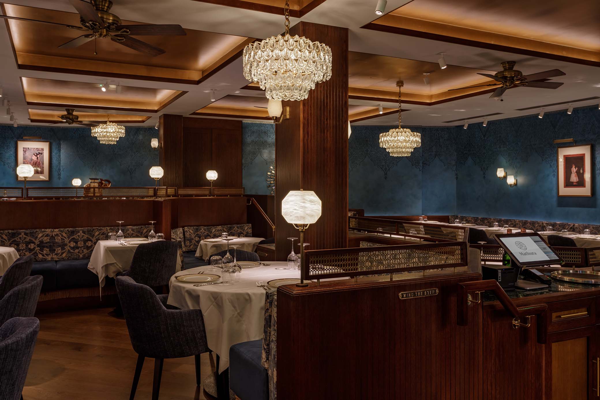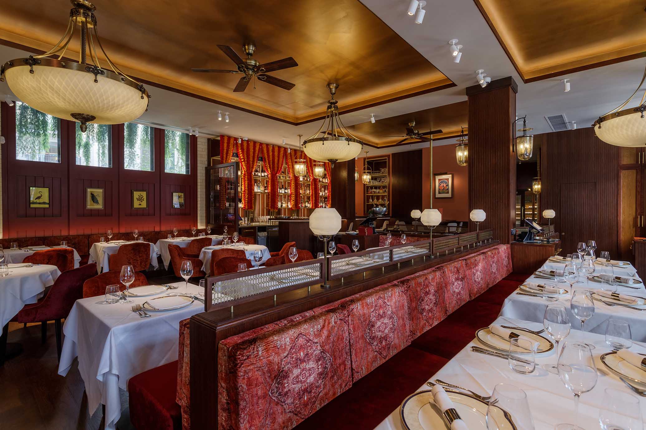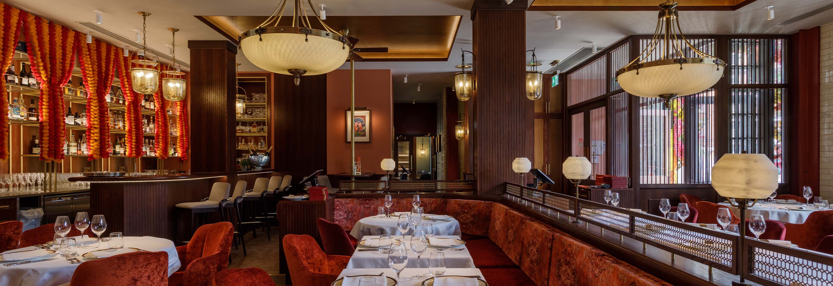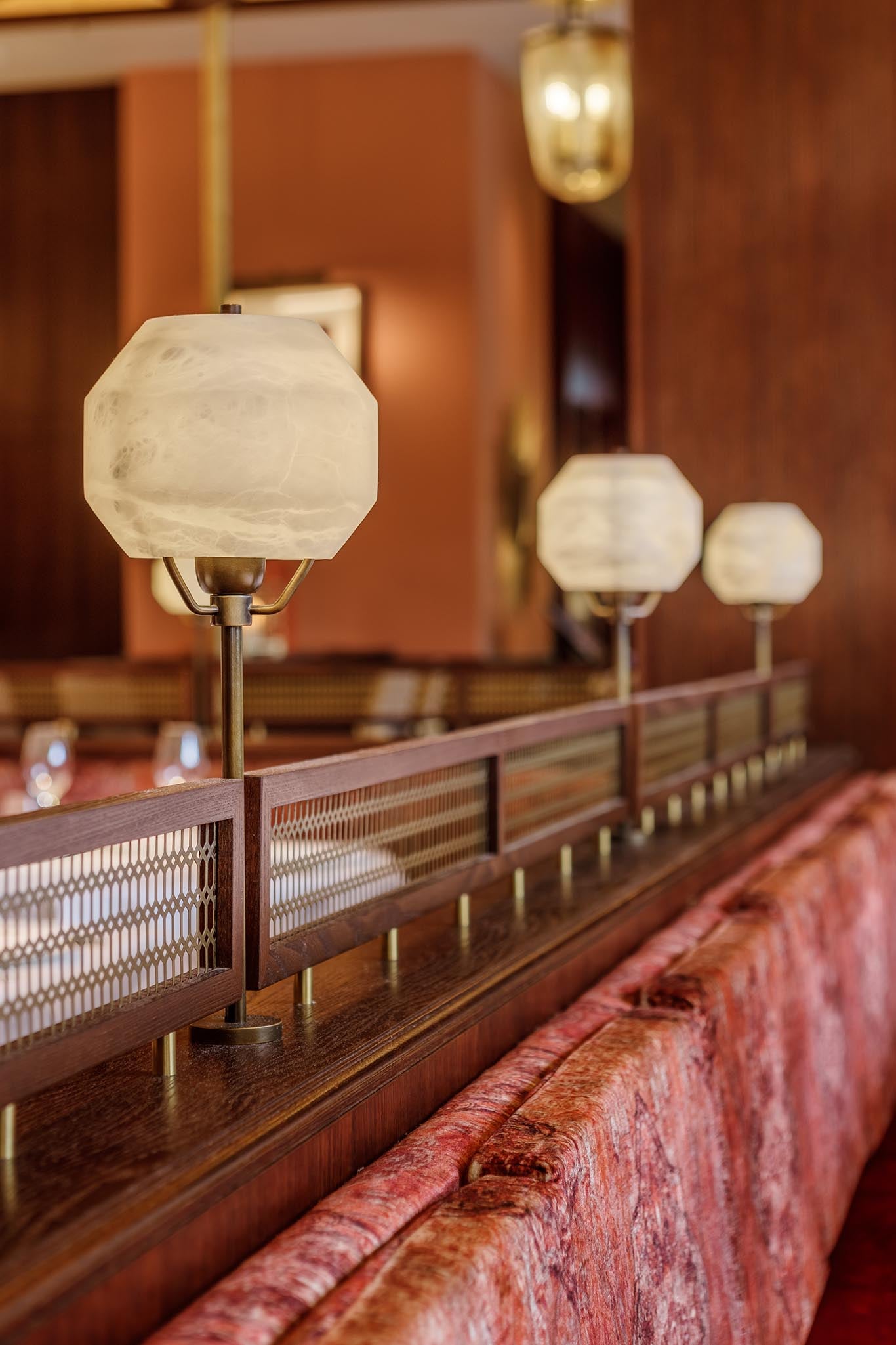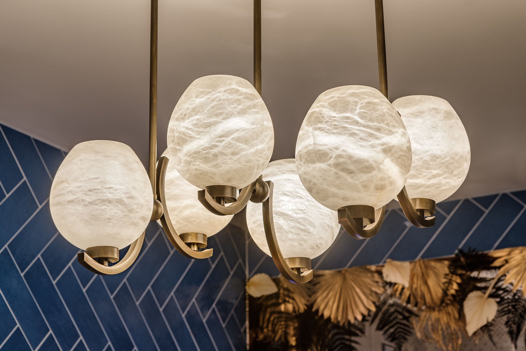 The restaurant's walls are traditionally decorated with deep-blue wallpapers that have been etched with Henna-like patterns. The walls are delicately illuminated by several of our well-renowned Bresson wall lamps. The marvellously crafted alabaster shades are paired with backplates and support arms, both finished in old English brass. The wall sconces can be pointed vertically in either direction, making them one of the most versatile fixtures in our Signature Collection.