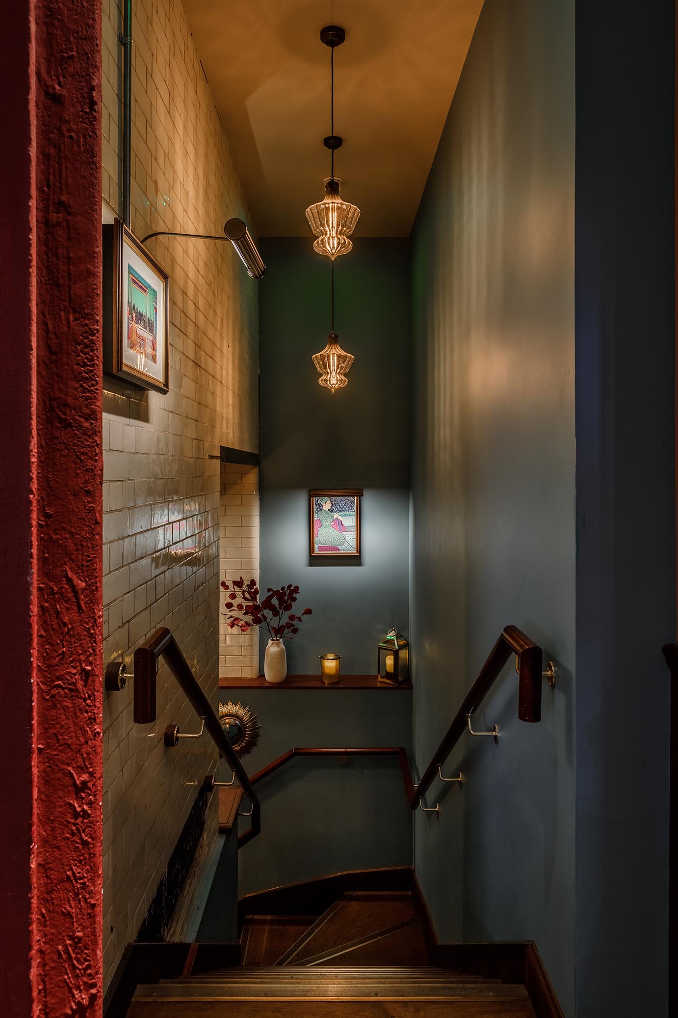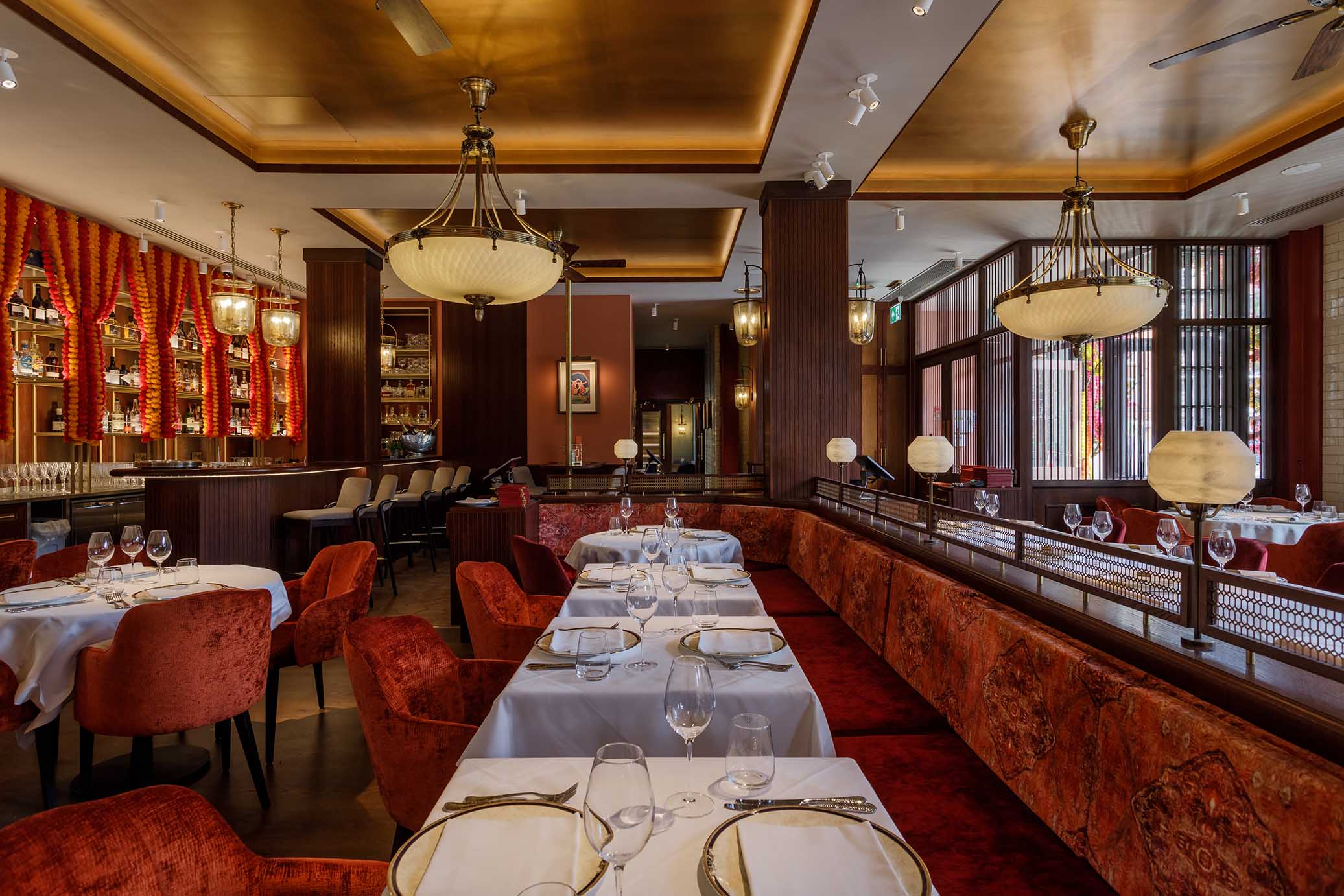 The restaurant stretches across 5,000 square feet and two floors, consisting of a spacious dining area for 60 people, an open kitchen, a destination bar, two private dining rooms, and a chef's table. It also contains a few nods to its former life, retaining the building's original tiling and firefighter's pole. London-based multidisciplined designers Rosendale Design took on the responsibility of envisioning a traditional setting for Mathura.