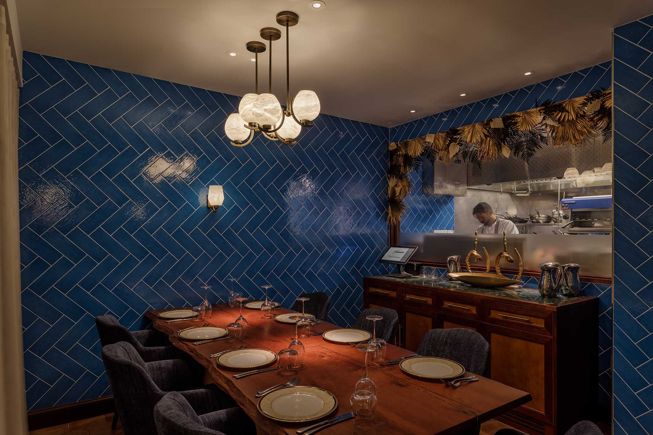 At the inviting chef's table area, a private banquet table with seating for up to seven diners is haloed by a trio of our iconic Maldere pendants. Our skilled artisans have taken advantage of this material's extraordinary translucency to create bespoke shades for this hugely popular design. As a result of its natural formation, each piece contains a unique patterning of mineral veins creating variation in the light that passes through it. The trio of pendants further adds to the running theme of beautifully combined rich bronzes with alabaster shades.