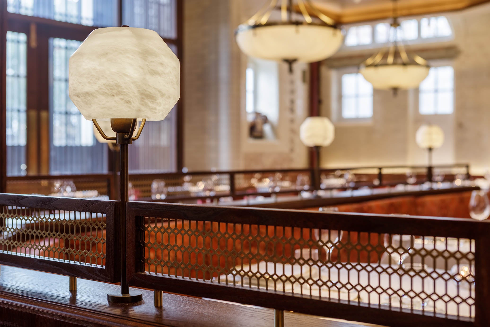The flexibility of our Signature Range means that amendments can be made to lamps that allow them to take on new functions, such as table lamps that can instead be fixed to surfaces using amended base designs. This was the case for our striking Caldera table lamps, all of which have been fixed to the sumptuous walnut separation panels throughout the restaurant. Comprised of a rich bronze stem and an opulent ivory alabaster shade, our Caldera table lamps are real statement pieces that radiate organic elegance. The alabaster is naturally translucent, emitting a diffused light when illuminated. Mathura uses both medium and large variations of our Caldera lamps.