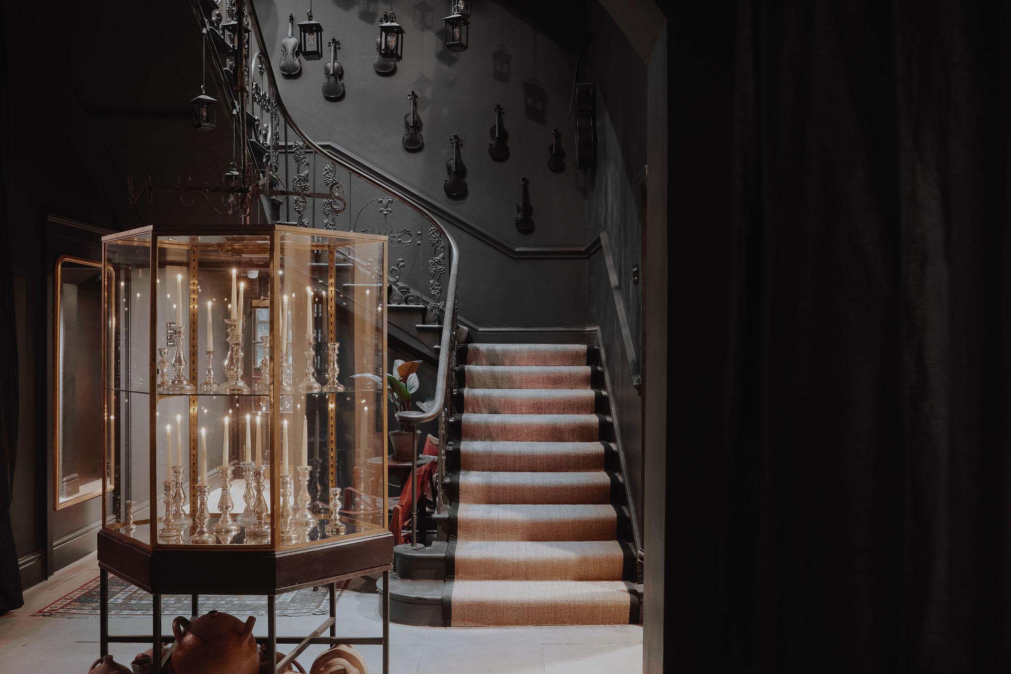 Finally, a series of blackened steel lantern pendants adorn the staircase and the spa area. The uniquely designed staircase pays homage to York's Gothic history, with a series of black-painted violins ascending the jet-black staircase from bottom to top. The lanterns hang beneath the staircase and provide a warming glow in the darkest space of the hotel. The same lanterns are displayed in the cocooning arches that make up the spa area and match the atmospheric scheme Jay Grierson and his team have created.