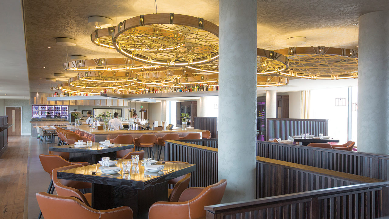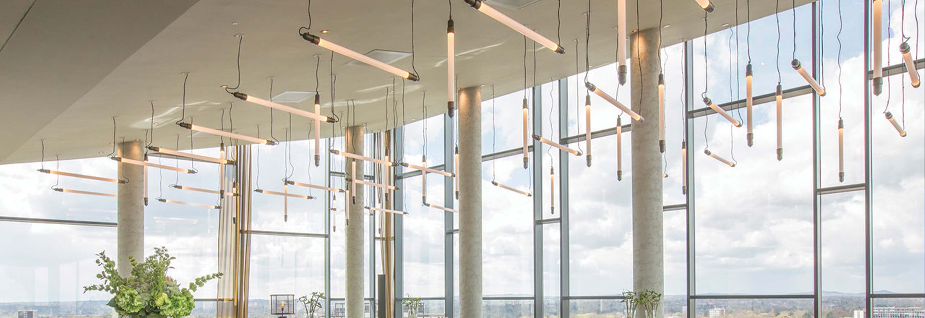 On the top floor is the Rofuto Restaurant, a modern Japanese Izakaya-style dining concept. Its highlight is a group of more than sixty bespoke tube pendants accentuating the stunning views across Birmingham City Centre. The minimalist style reflects the sleek and straightforward Japanese aesthetic with metal caps hand-finished to match the other bespoke furniture. These impressive features can be seen from the ground floor at night and act as a magnet to visitors to the city.