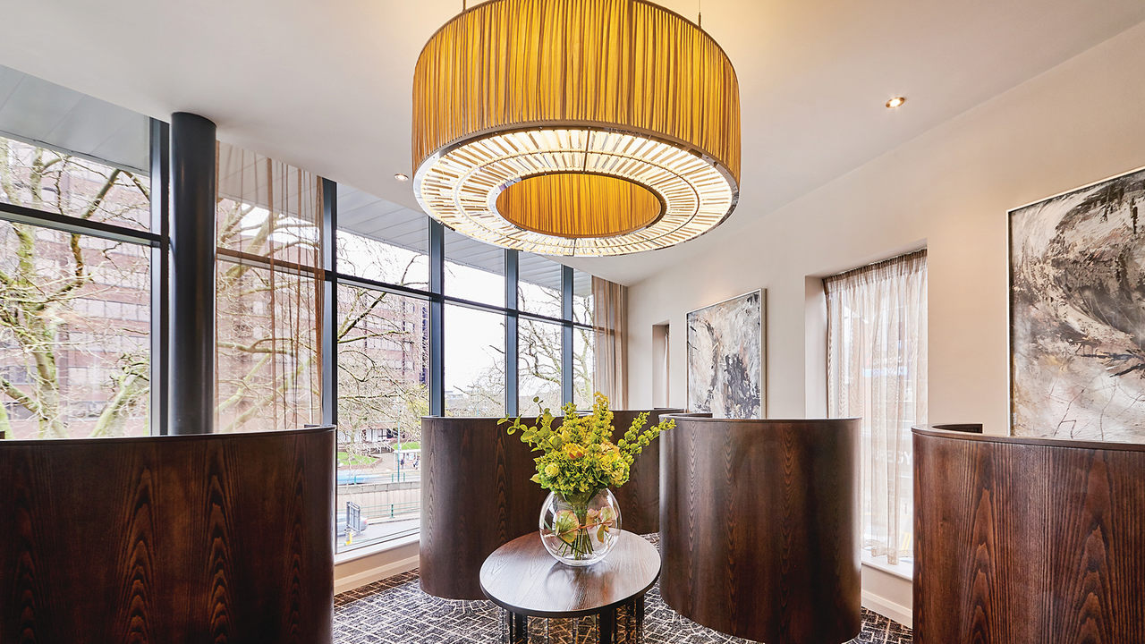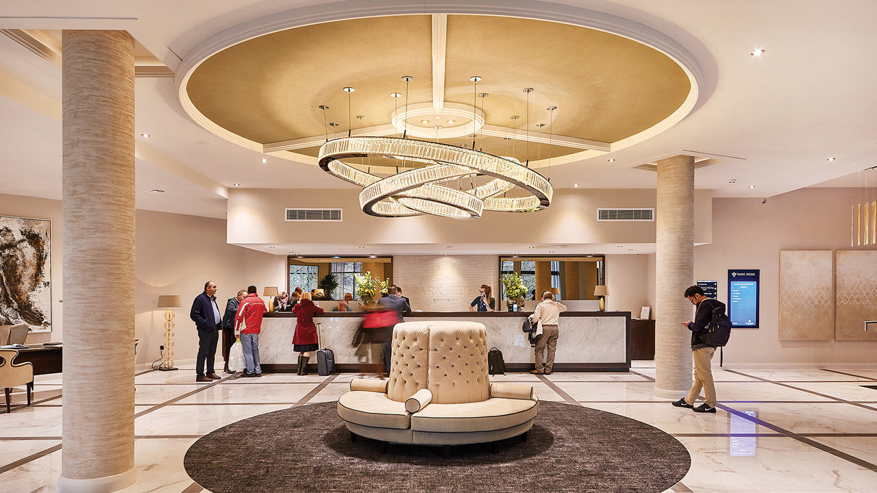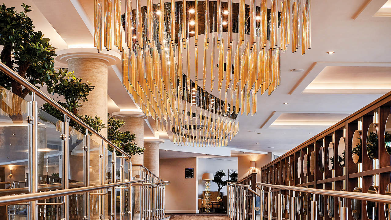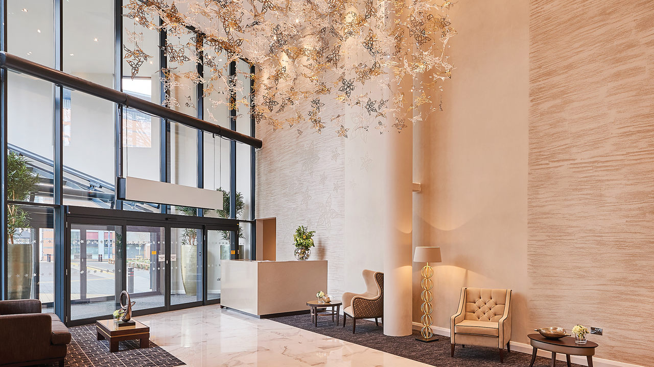 A stunning bespoke chandelier welcomes guests to the hotel, greeting them with a gentle twinkle from the moment they arrive. The seemingly never-ending drop features more than 500 delicate laser-cut metal flowers complemented by individual crystal details.