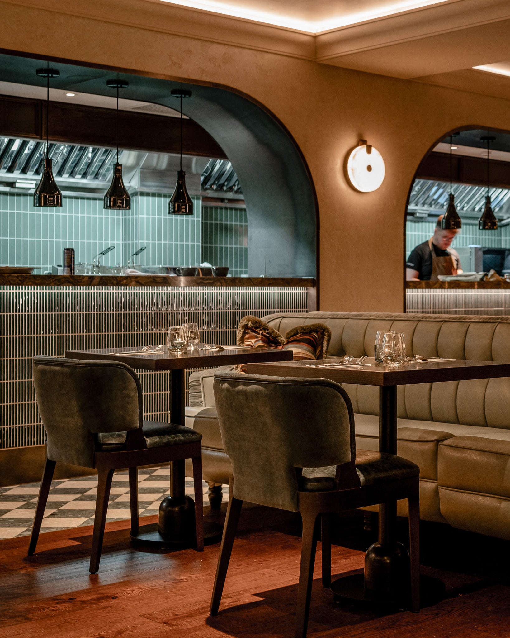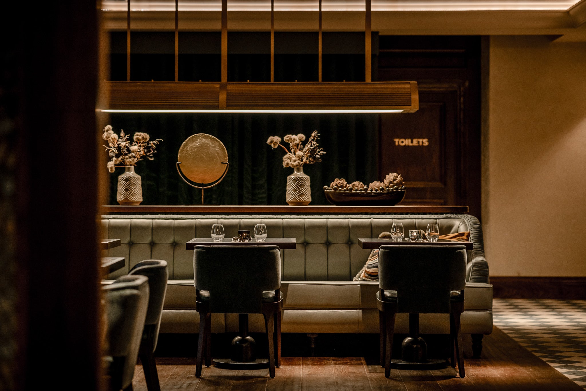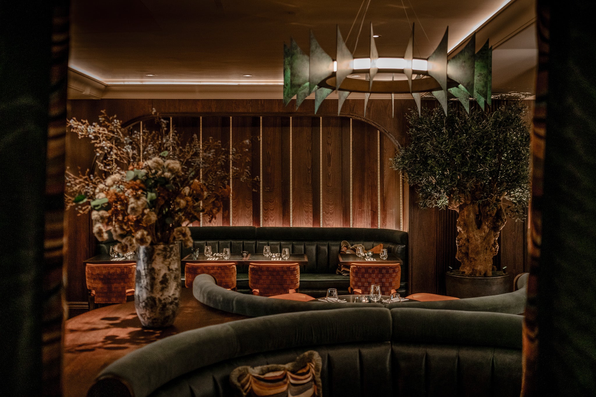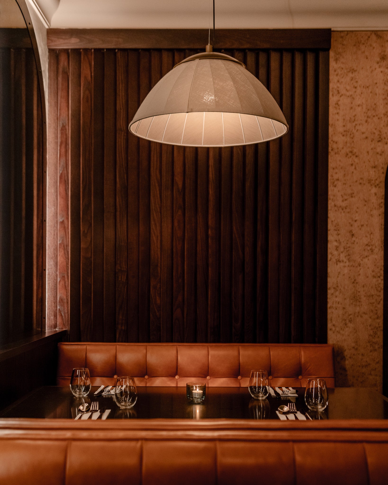 The bespoke designs were paired with our Ophelia wall lights, with organic alabaster veining and gentle light diffusion for the perfect mood lighting addition to the dining area.