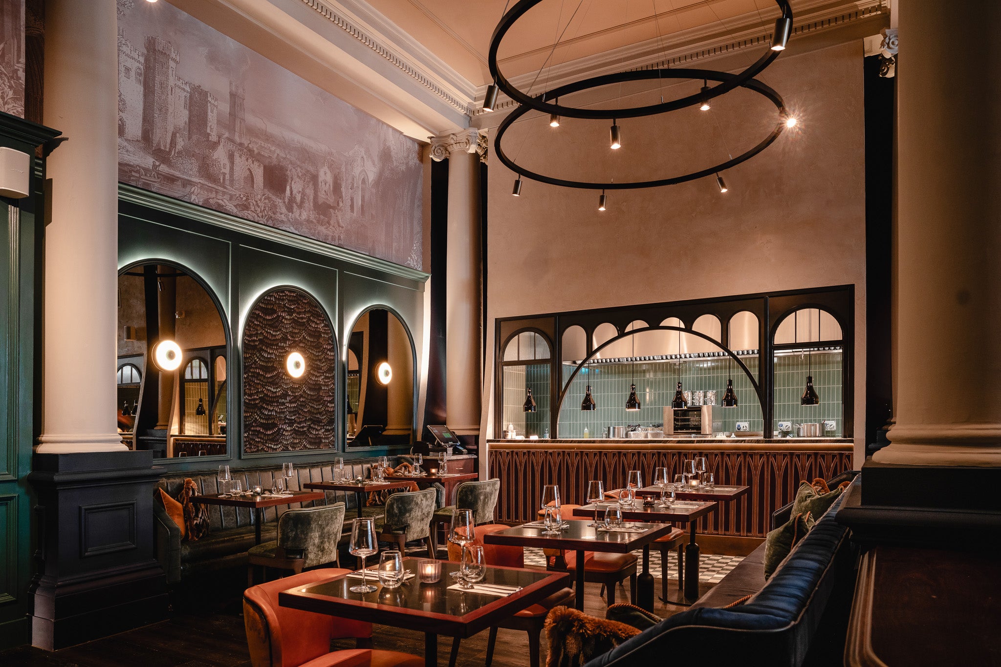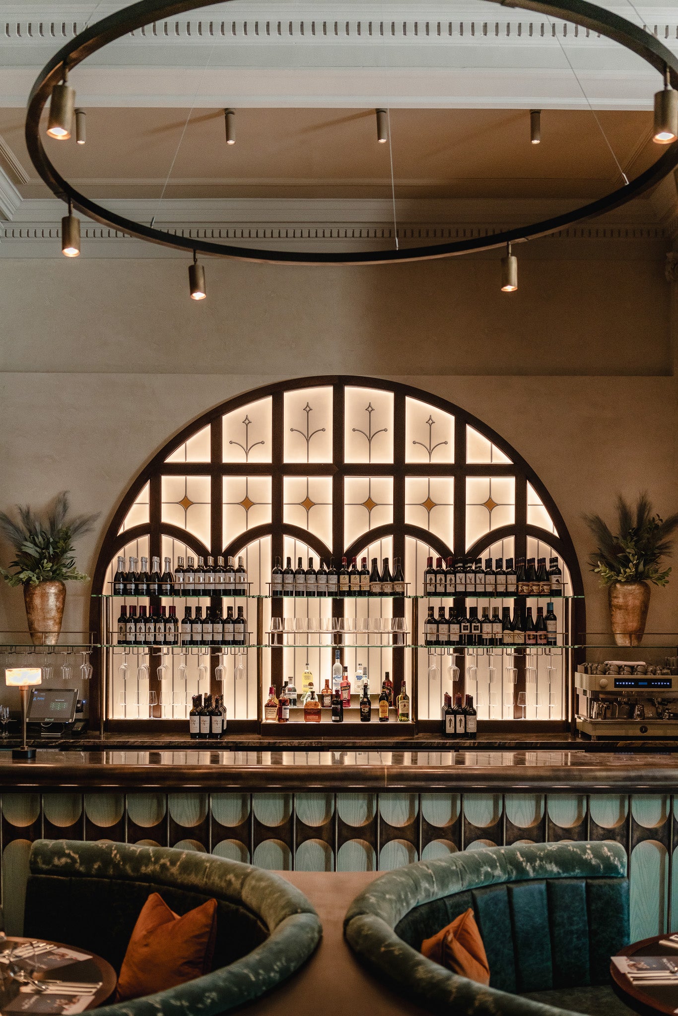 The restaurant's interior, influenced by the city’s medieval and Victorian Gothic architecture, combines modern elements with decadent gold accents. The joinery features gothic arched details and stained-glass screening, while rich-toned timbers and antique brass hardware enhance the decor.