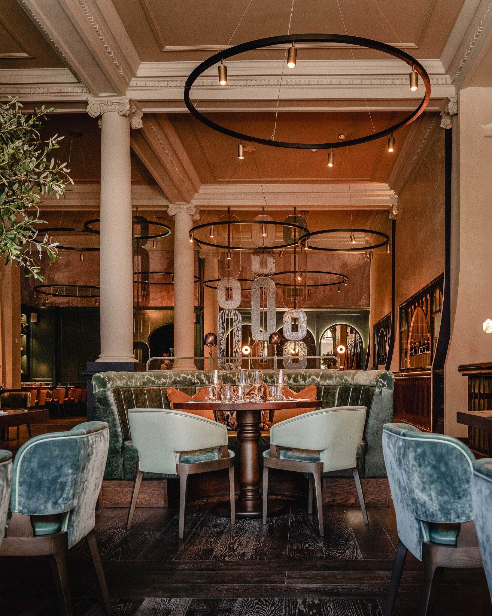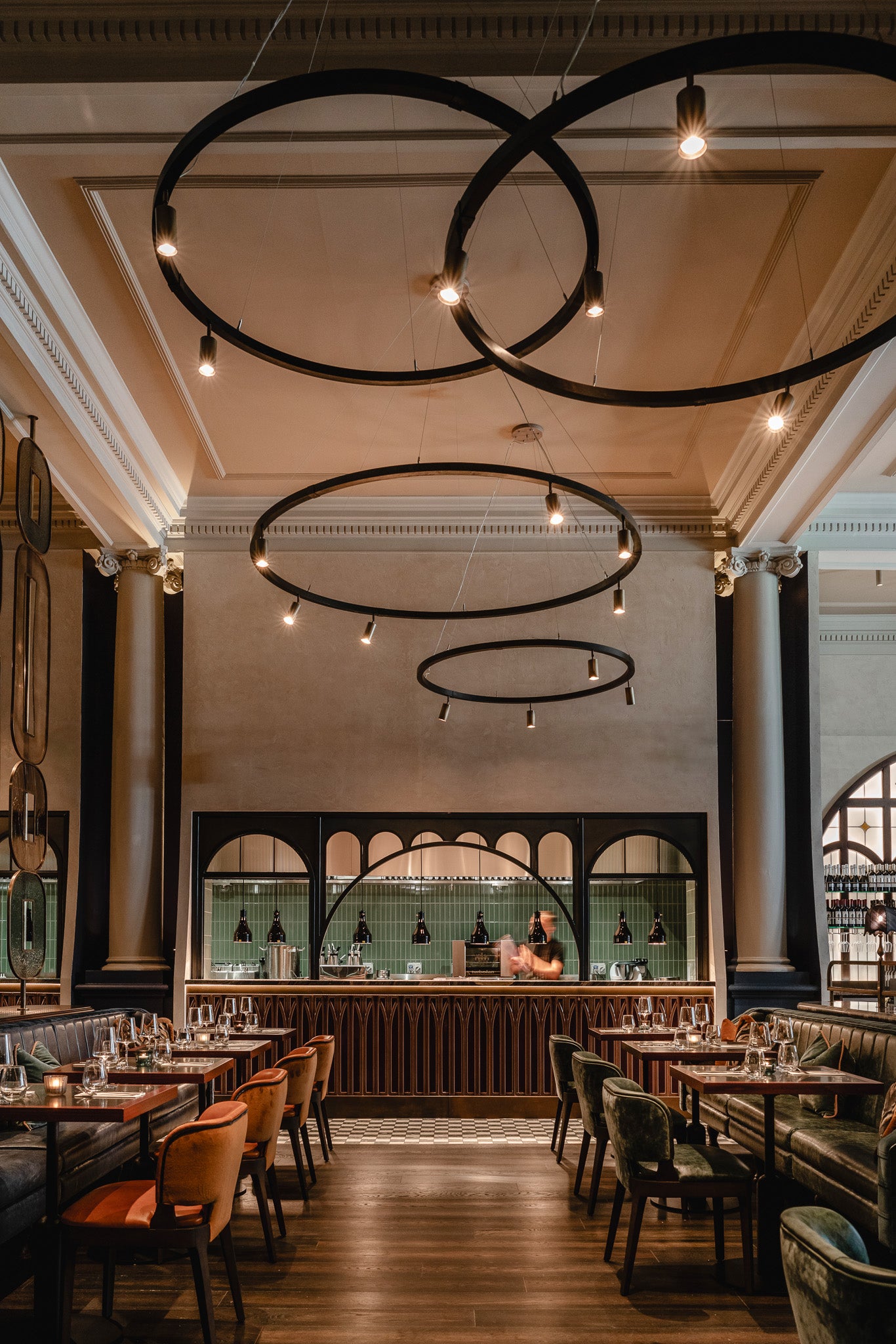 Huge industrial ring pendants finished in blackened steel suspend from the ceilings in different arrangements, creating a layered illusion from different viewpoints within the restaurant. Old English brass light finish features on the rim’s spotlights, with each ring displaying different arrangements and quantities. The same finish is utilised on the long stem pendants, with three clear glass globes extending upwards from curved arms offering a sense of decadence. Faux alabaster wall lights are topped with contrasting enamel green powder coated domes, perfectly positioned to create additional layers of light in darker corners of the space.