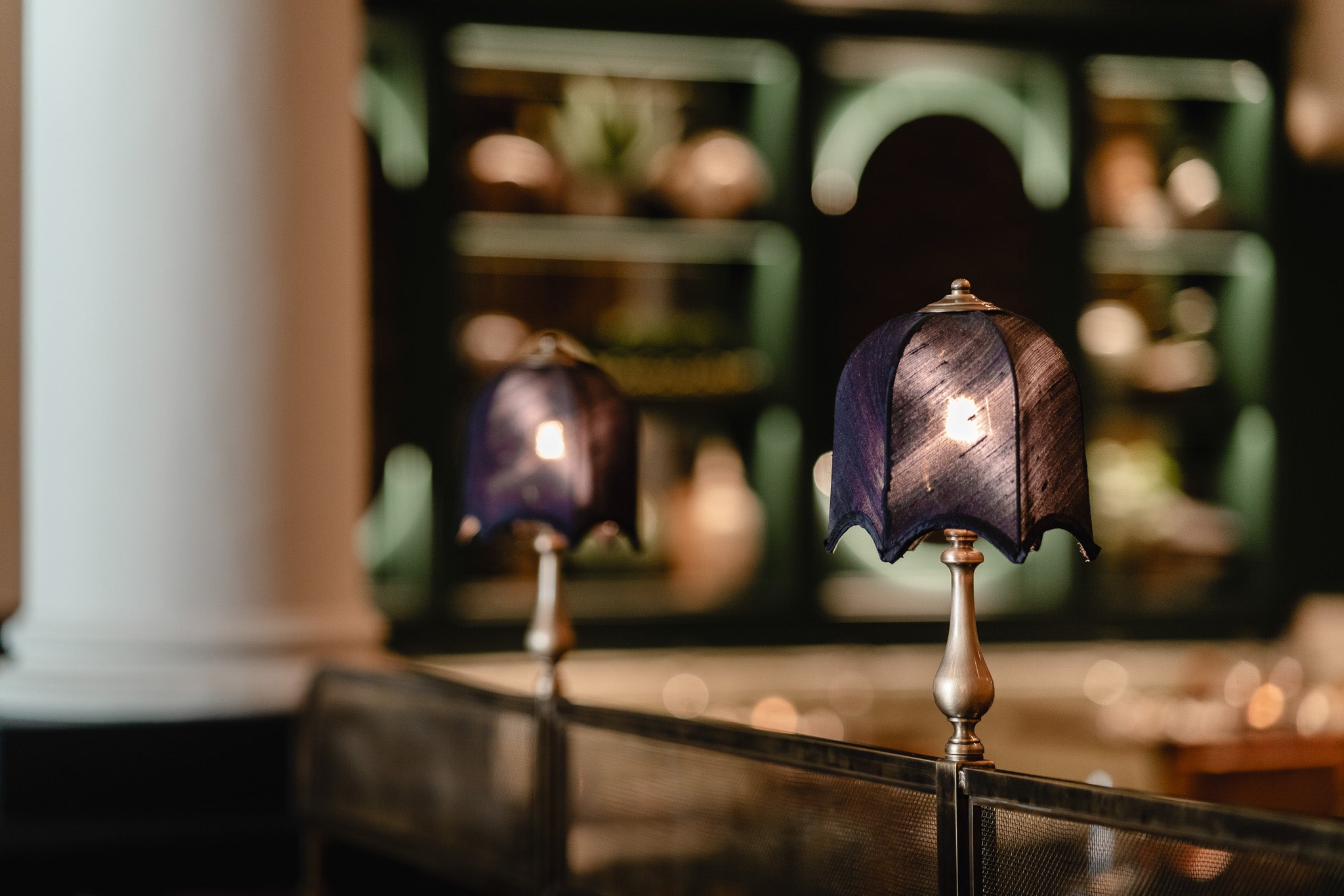 The bespoke restaurant lighting we crafted for this project is complemented by items from our Signature Collection. Large Colven table lamps with organic alabaster veining are dotted around the venue, tying in with the wall light designs. Our Heslop floor lamp with old English brass body and marble disc base feature soft tailored shades with a cloche-inspired design in pearl linen fabric.