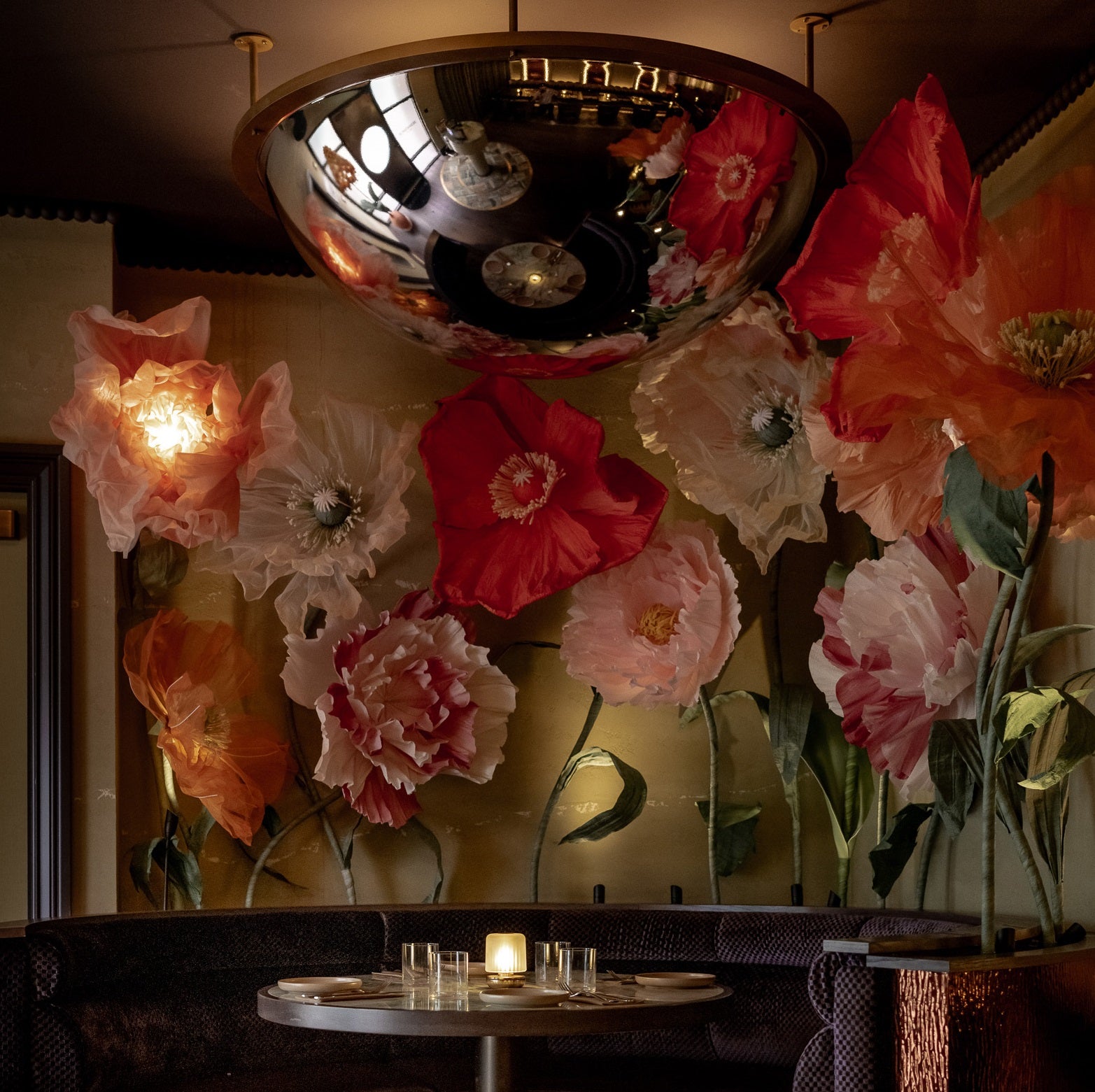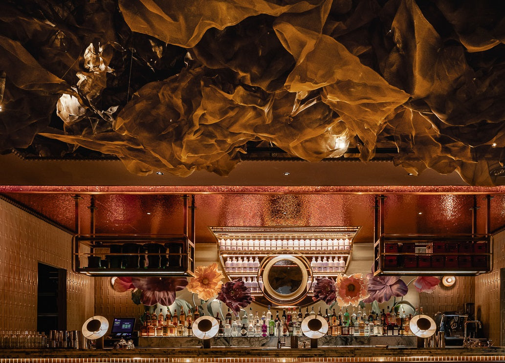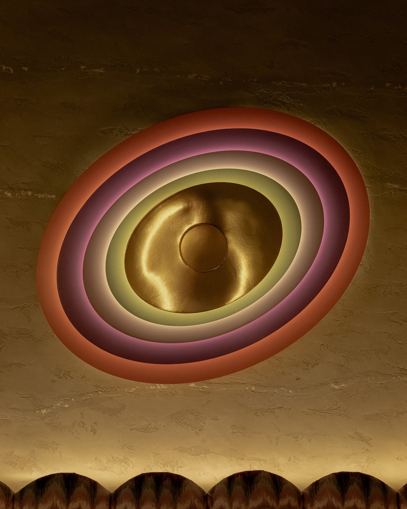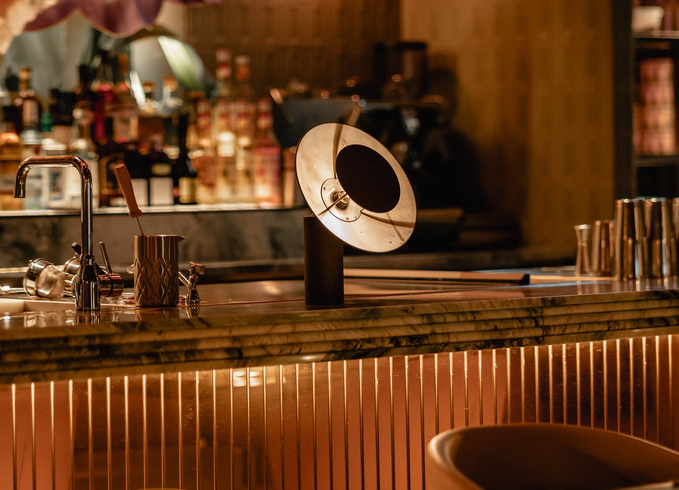 On the bar itself, fixed brass table lamps - reminiscent of vintage circus footlights - were treated with two unique finishes, applied by hand to achieve the desired look.