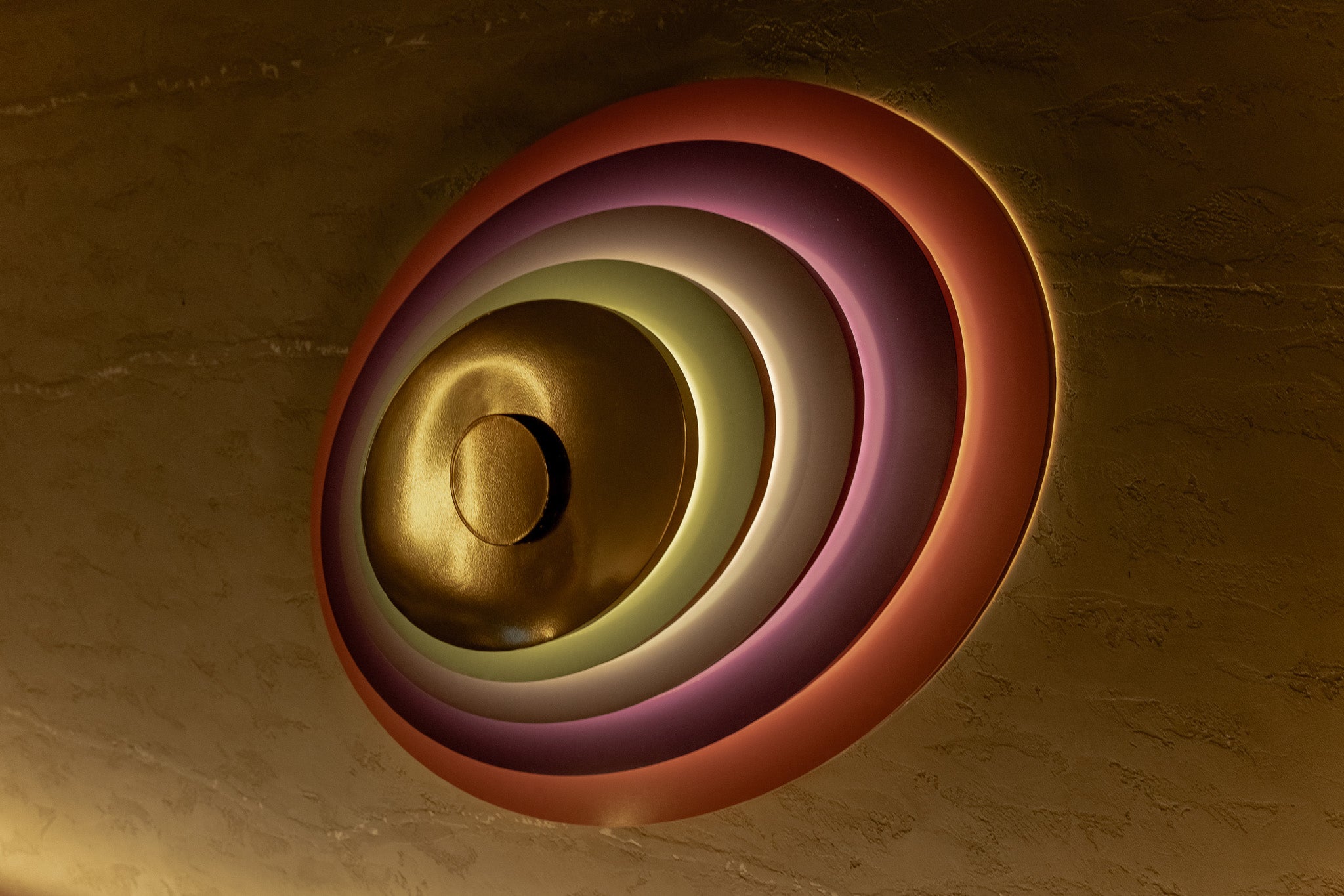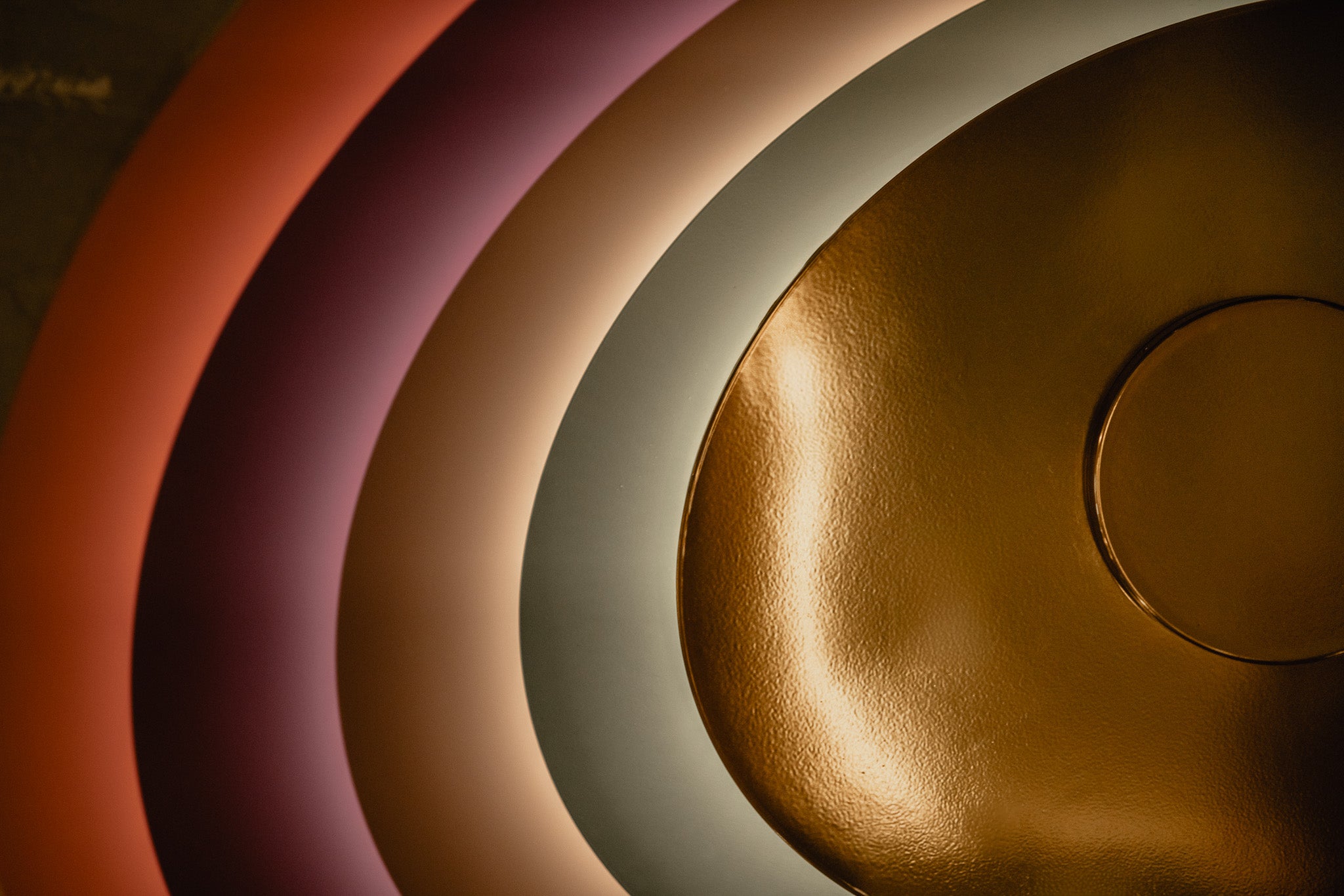 Powder coat colours are accented with brass in the oval shaped metal layers. LED strip lighting to each layer adds depth and tactility to create an interplay between light, colour and shadow.
