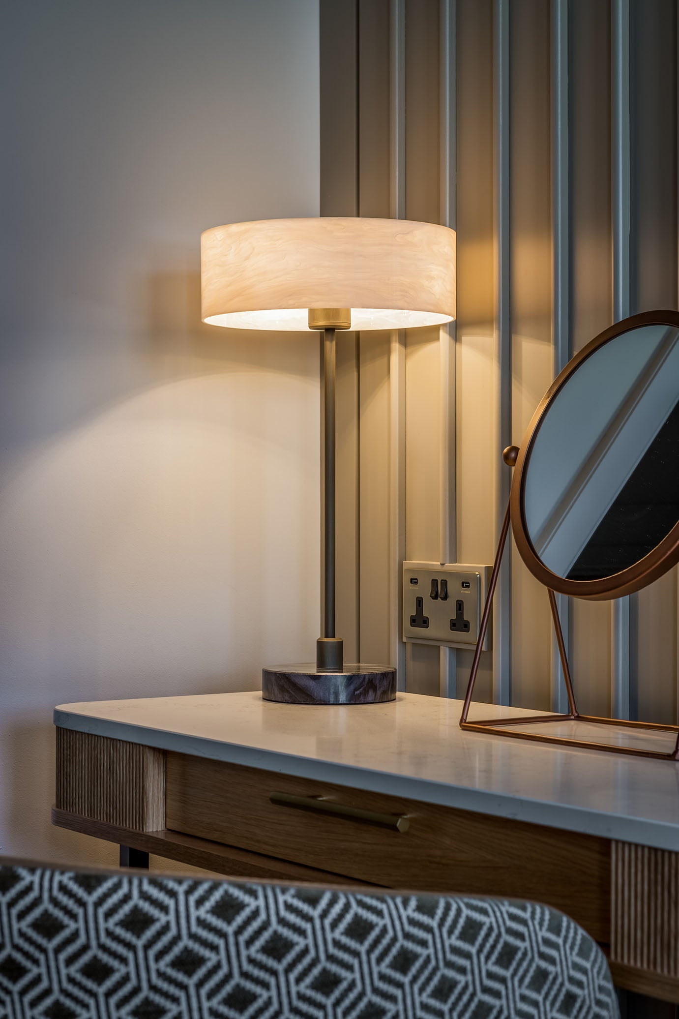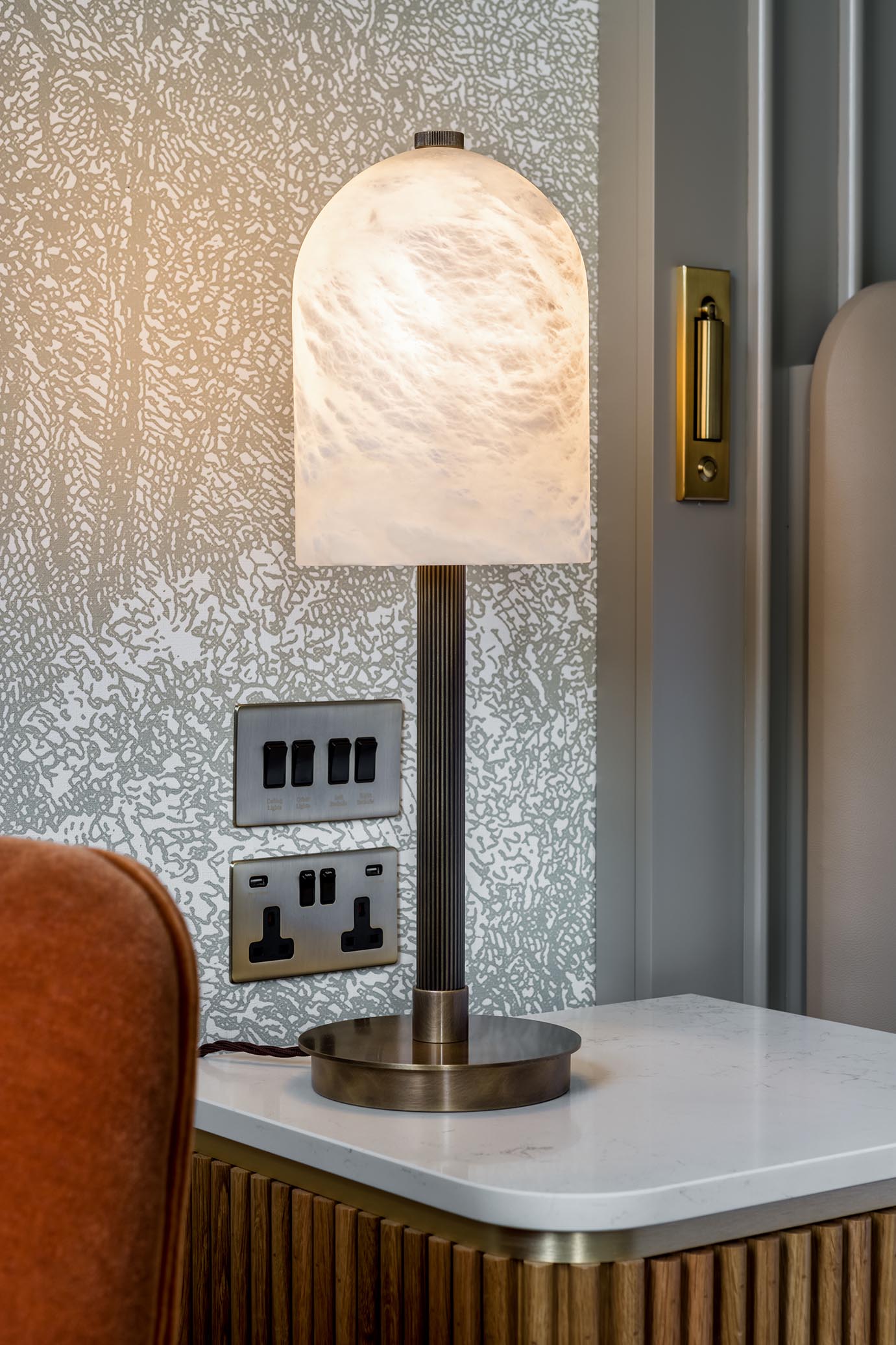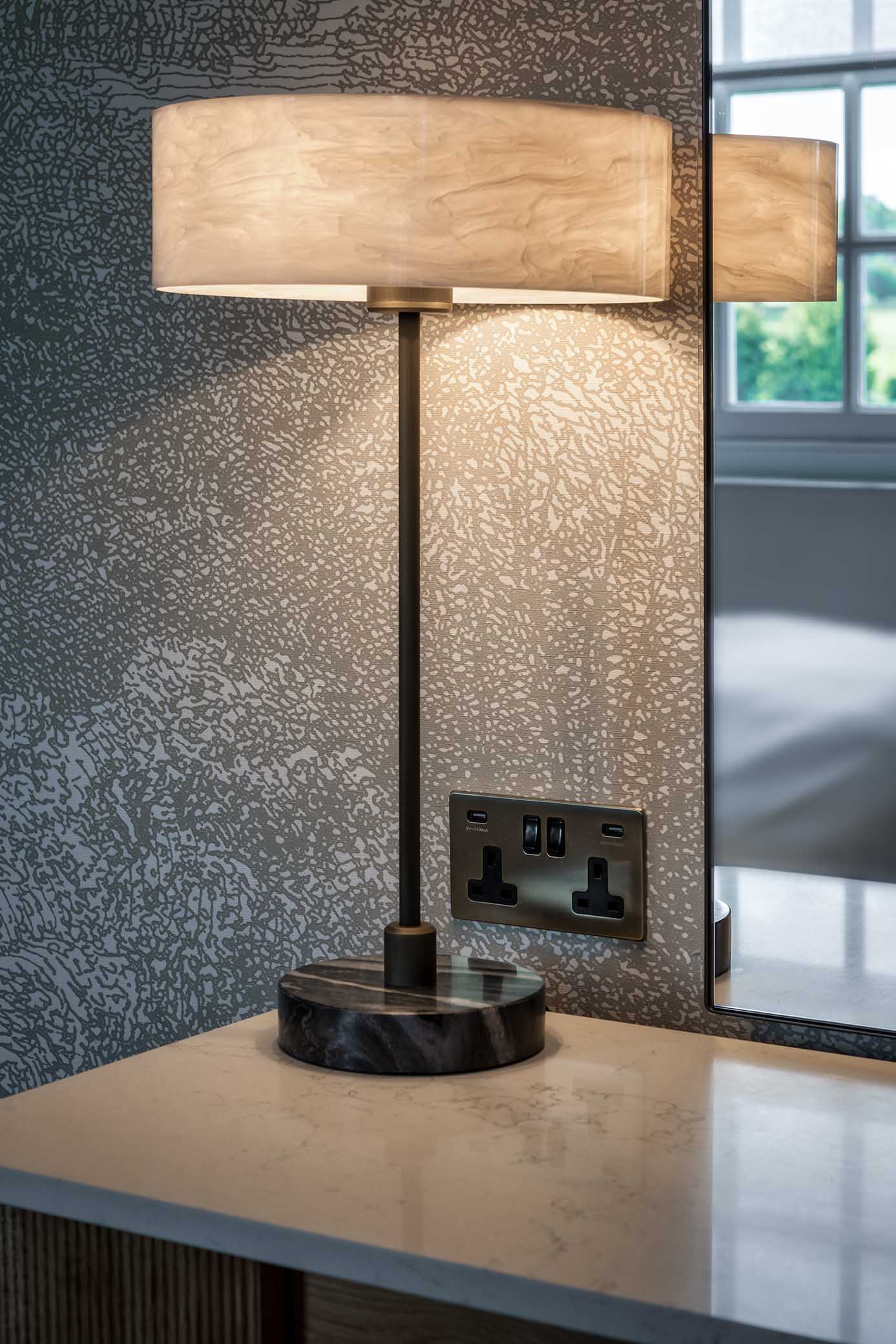 Elsewhere on the dressing table, our bespoke light brass and faux alabaster desk lamps bring vivid illumination to a key area of the bedroom. Comprising a base of sumptuous grey marble, hand-finished light brass metalwork and a detailed translucent faux alabaster shade, this contemporary desk lamp has been positioned to maximise the glow in the proximity of the bespoke arched mirror.