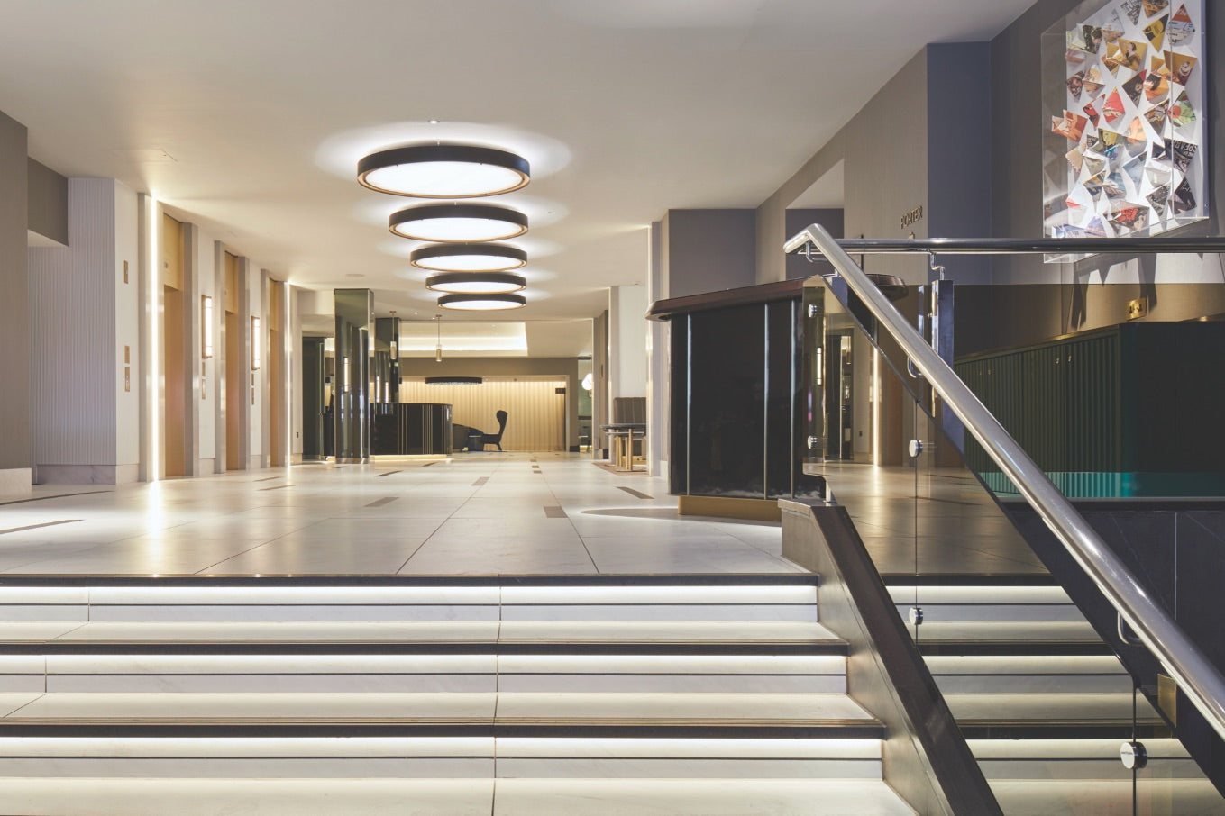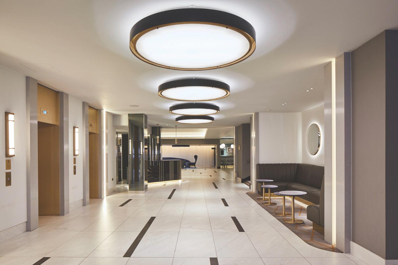 The concourse features a line of five feature pendants – flush rings finished in matt black and brass – again evoking the Art Deco feel of the space. An acrylic diffuser softens the effect of the LED lights installed to work with the Dali dimming system the designs to the public area pendants required.