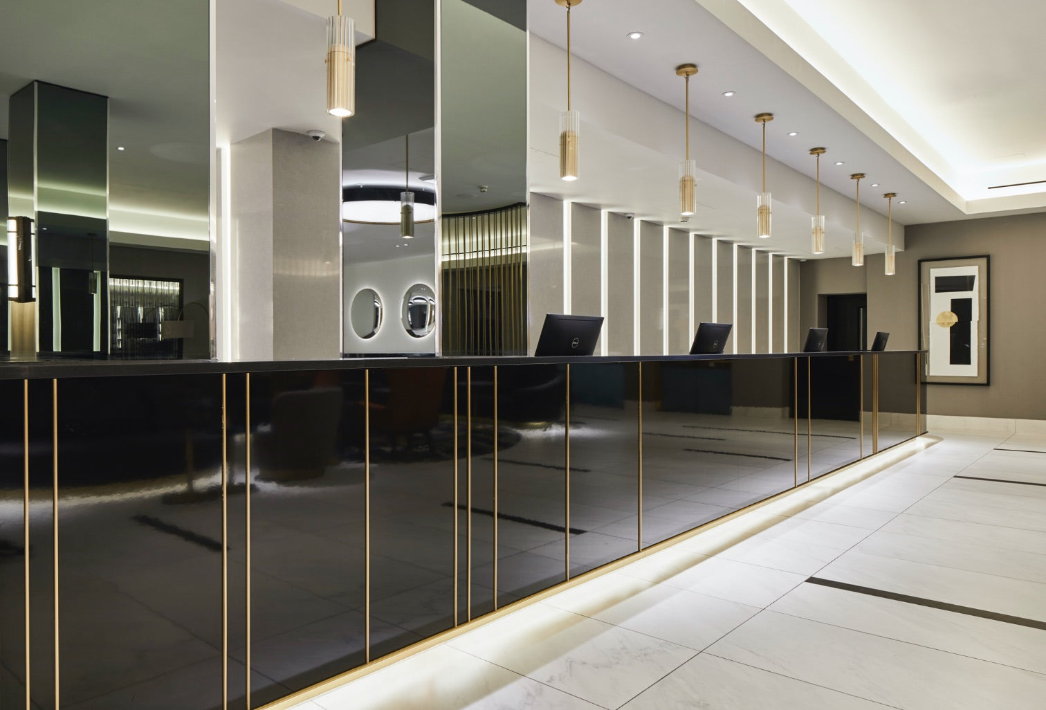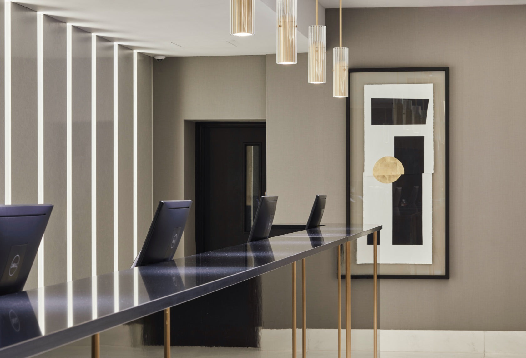 The reception pendants were supplied with reeded clear glass tubes, fixed with decorative gallery screws to an inner domed satin brass tube housing a GU10 spotlight. These were suspended on matching brass drop rods from the ceiling to create a focus over the reception area.