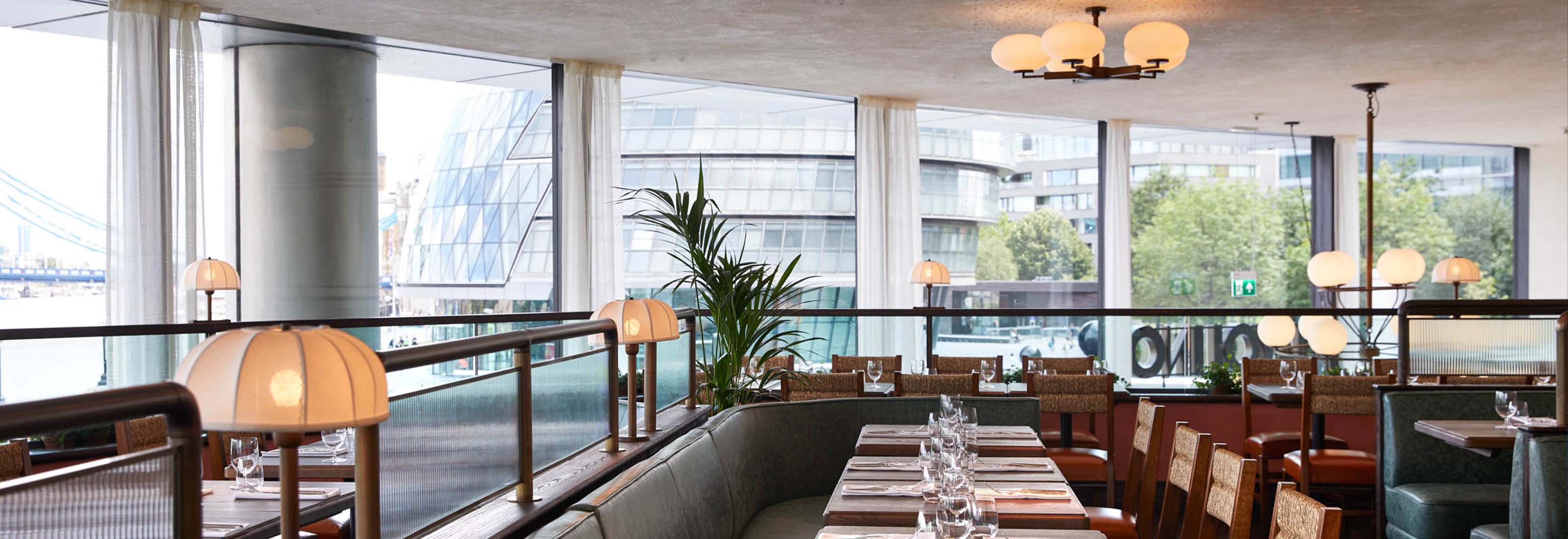 Elsewhere, bespoke banquette seating upholstered in an aged green leather wrap around the perimeter of the ground and mezzanine spaces complimented by booth seating and rope-backed dining chairs in tan leather. Our bidirectional antique wall lights bring even more personality to these spaces by offering a very personal lighting source. The lamp holders are contained within beautifully hand-finished reeded globes to finish these powerfully designed feature lights perfectly.