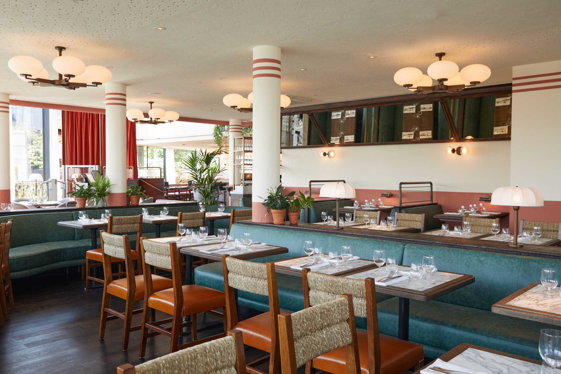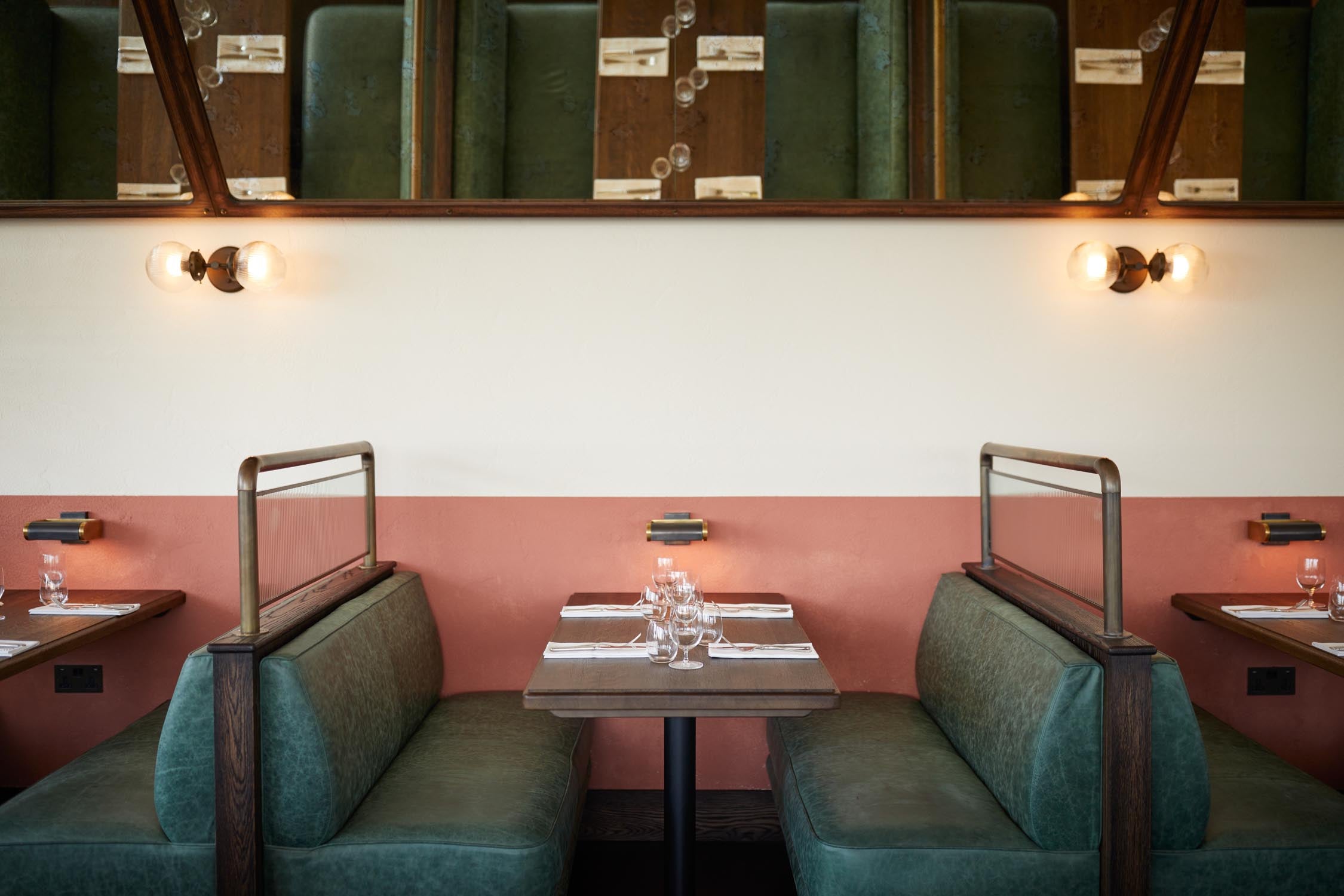 Hanging above this space are several impressive bespoke multi-arm pendants complete with matt opal diffusers. The well-considered antique finish marries with the coating applied to the table lamps below. The pendants play a vital role in providing ample lighting to the entire restaurant, all while creating an aesthetic that takes one back in time to the days of Parisian brasseries being the height of dining fashion.