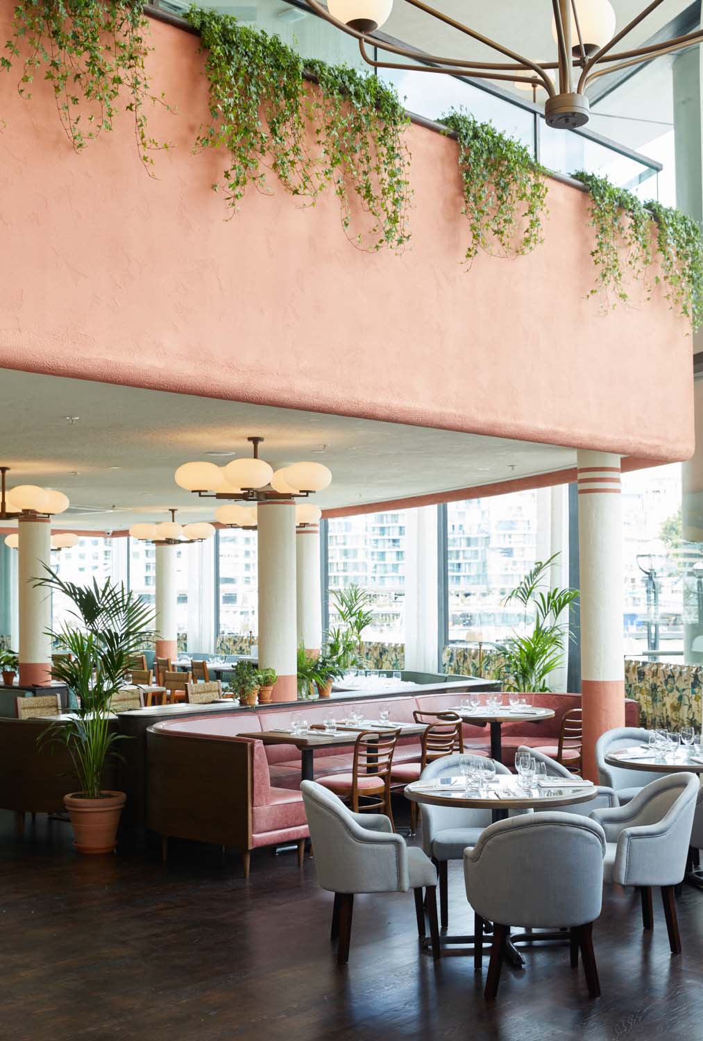 The Italian Art Deco homage continues into the more minor details, such as the signage and branding. It is epitomised in a specially commissioned mural that runs up the staircase, the illuminated neon sign hanging over the bar, and the futurist-inspired branding used within the logo and the menu.