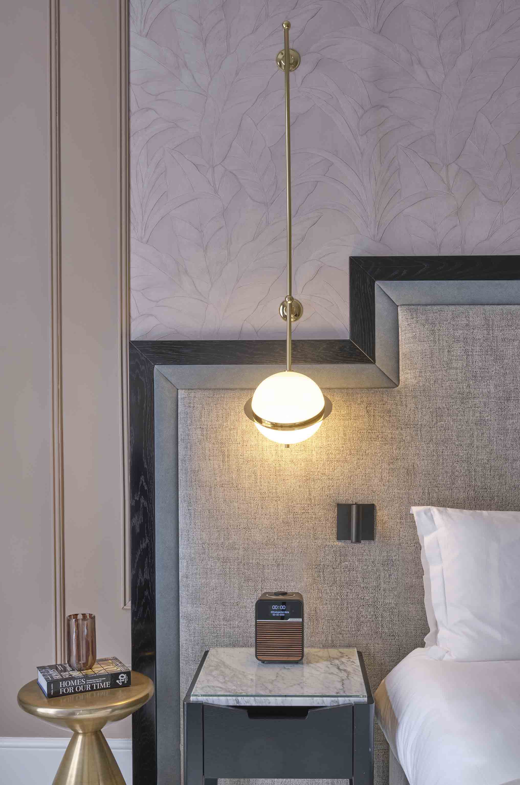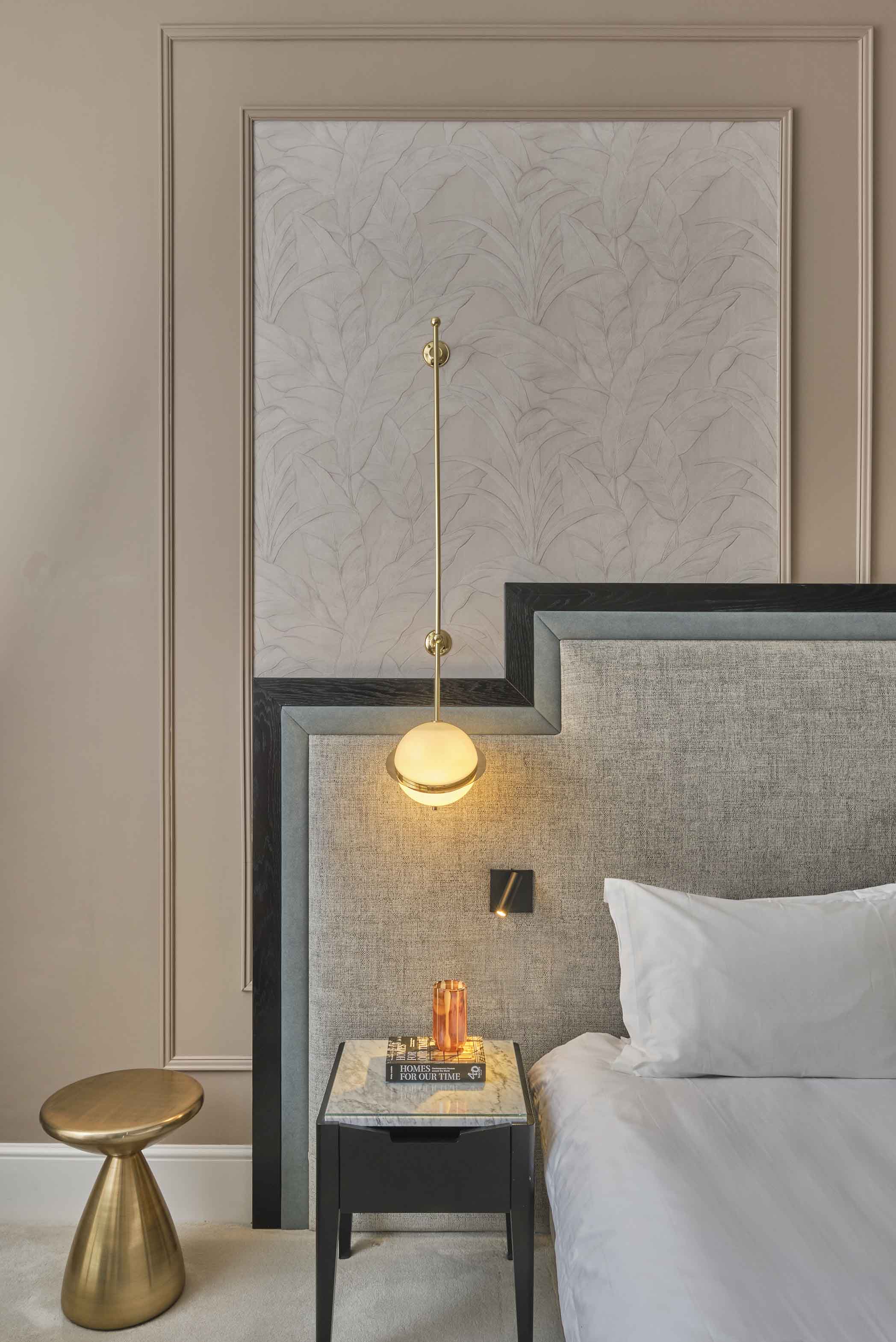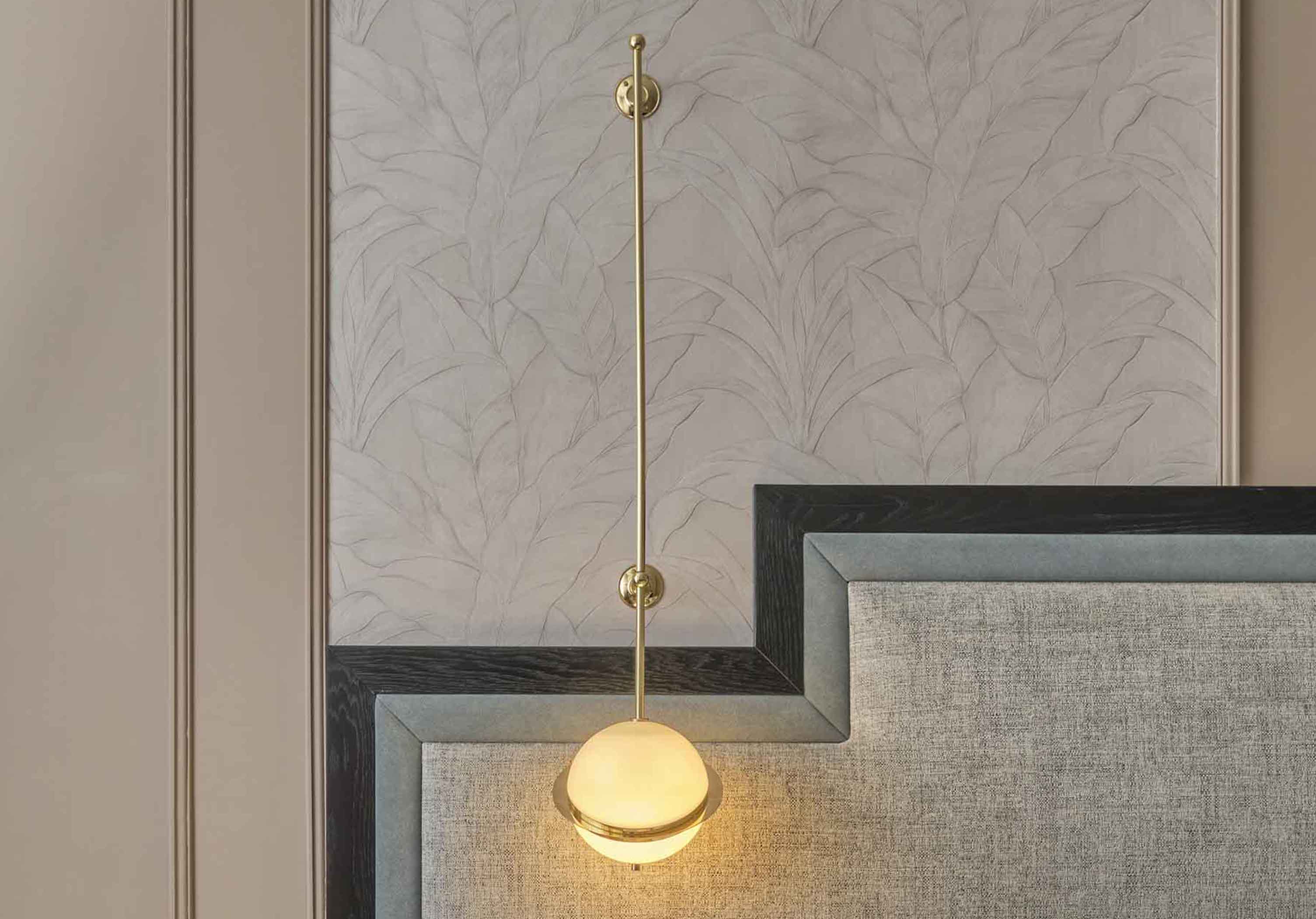 In the bedroom, the neutral tones carried by the bed's headboard and the walls are contrasted sharply by our extravagant brushed brass wall sconces. The fixtures are celestial by nature, comprising an acrylic shade haloed by a laser-cut band akin to Saturn's rings. The fixture benefits from a handcrafted rod that obtains height and attaches to a pair of brass plates. When illuminated, the pair of bespoke lamps bring a relaxing aura to the bedroom that encourages personal respite.