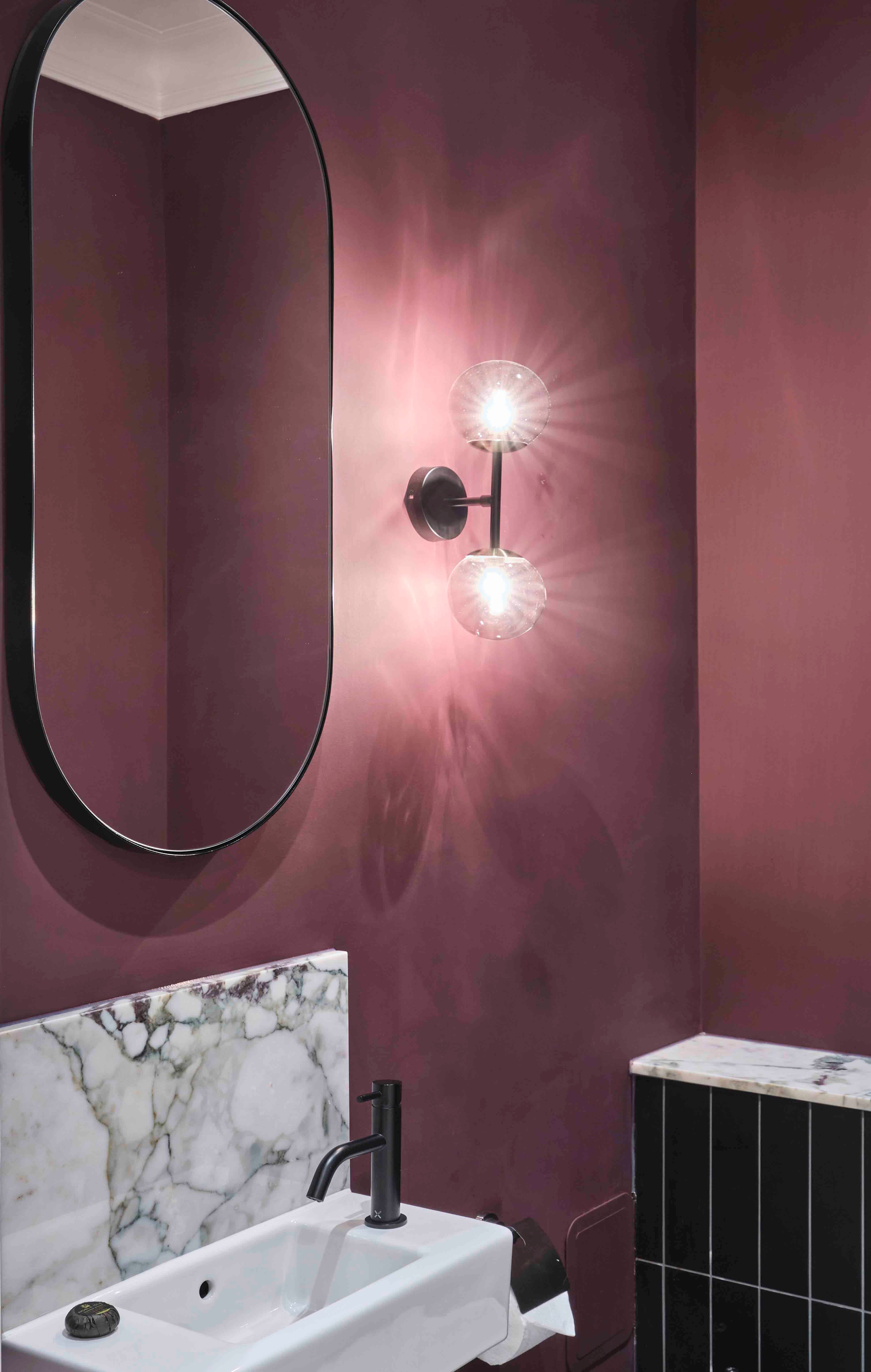 Elsewhere in the bathroom, the ravishing plum tones carried by the walls are accentuated by our bidirectional wall light. The industrial-inspired fixture comprises a handcrafted blackened steel rod that houses two smoked glass globes, each one cradled by delicately applied brass lamp holders. The bespoke lamp contrasts with some of the more intricate features in the room, such as the exquisite marble tiling that ornaments the sink.