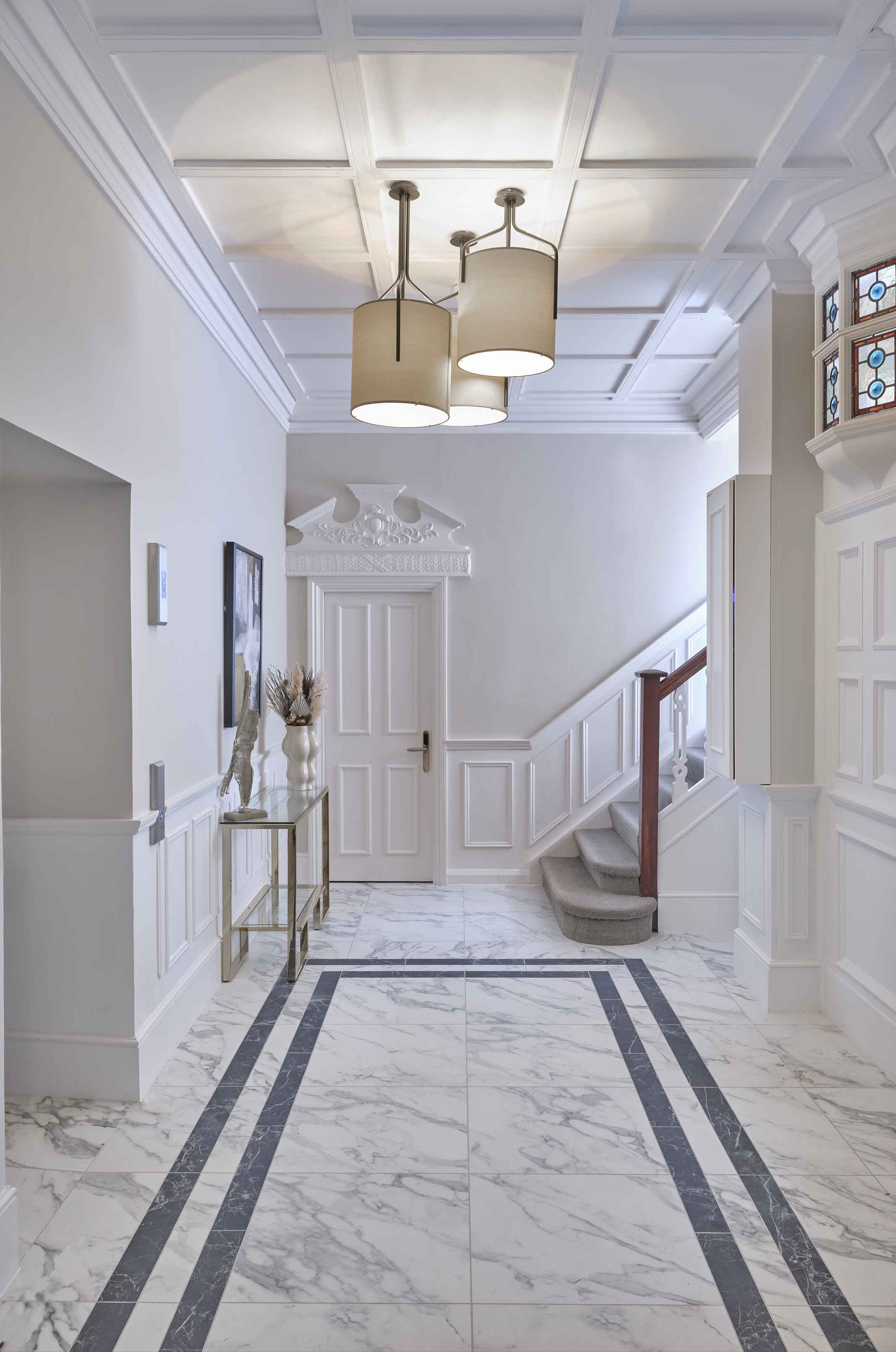 Our triple-shade pendant brings a beautiful aura to the bevelled ceiling in the hallway, highlighting the wood's incredible hand-carved details that form the area. The three shades comprise hand-formed Saxon jute fabric, cradled by a trio of polished stainless steel arms and formed into a cluster to create an attractive feature in this already eclectic space. The light from the pendants also brings clarity to the stunning marble tiles that form the hallway's flooring, each one carrying unique veining patterns that complement the elegance of the area's features.
