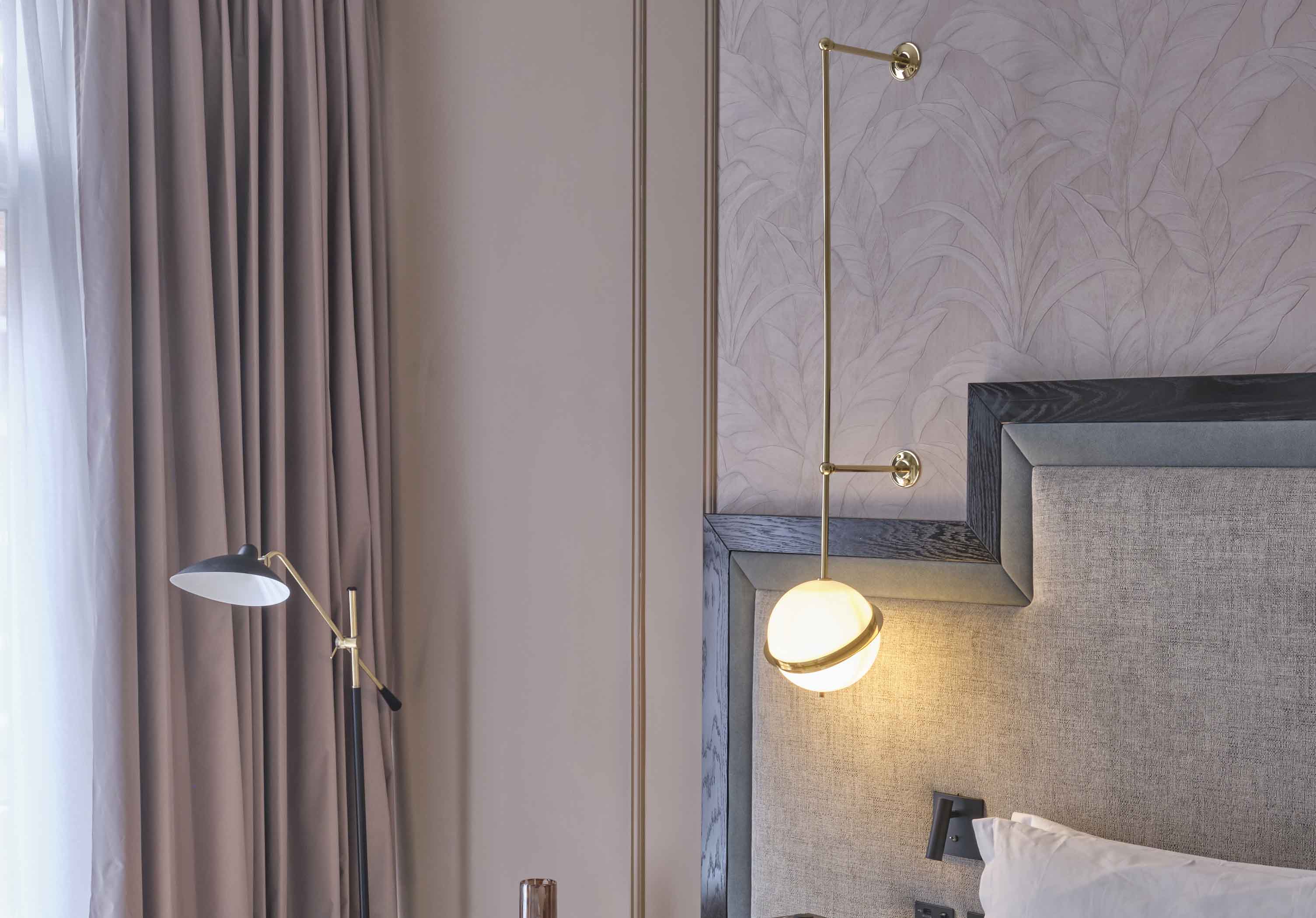 The design team at Northern Lights was thrilled to realise Atellior's vision for this historic venue by providing a range of beautifully detailed luxury bespoke light fixtures to the scheme. The colour palette is intentionally calm, comprising pale greens, warm greys and white; the bathrooms are clad in grey & white tiles, and kitchen worktops are made of composite stone. With this in mind, our task was to introduce soft linen fabrics to the bright hallways, lavish brushed brass elements to the bedroom and contemporarily industrial elements to the bathroom, which carries a moodier overtone in its design.