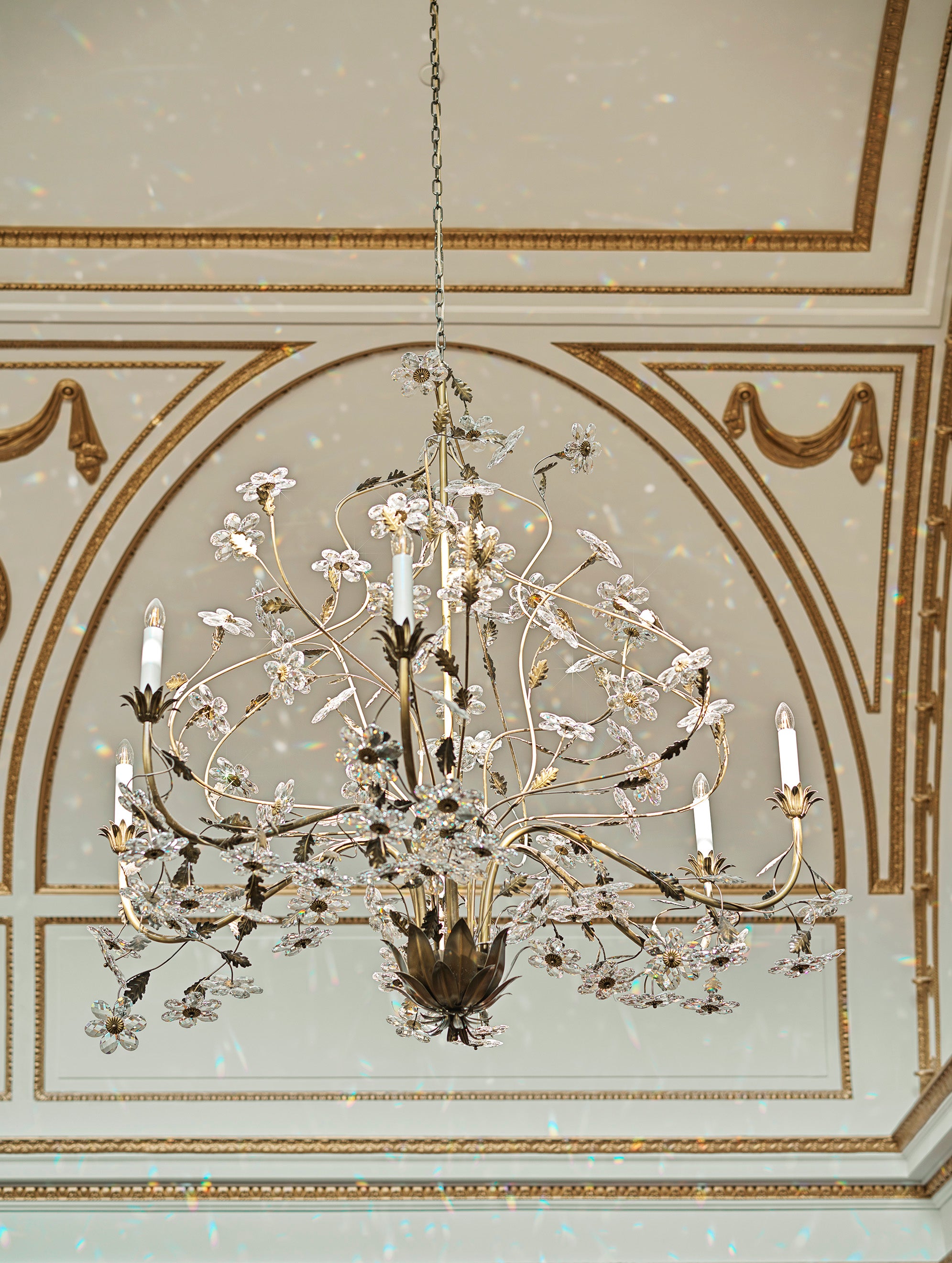 In the reception room, two of our handcrafted 'daisy' chandeliers suspend from the high ceilings above the dining table and reception area. The 1.5-metre-wide romantic-style fixtures comprise an antique oxidised brass stem with accompanying s-shaped tubed arms, electric candles and leaf-decorated bobeches. The soldered silver leaves and daises have been made with full-cut crystal almonds.