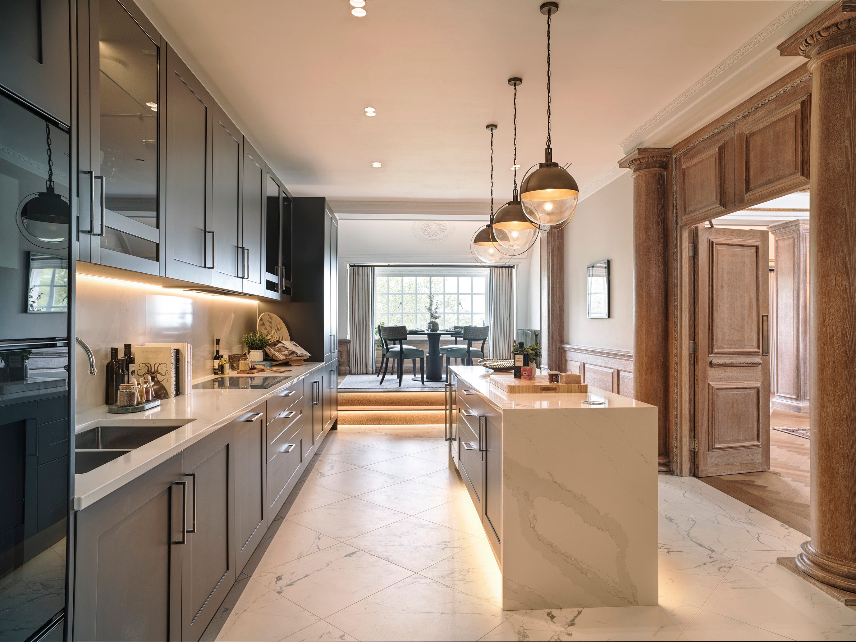 The hallway and kitchen feature simple pendants, designed to elevate the space without dominating. Glass and hand finished metal detailing work in harmony to gently illuminate the spaces.