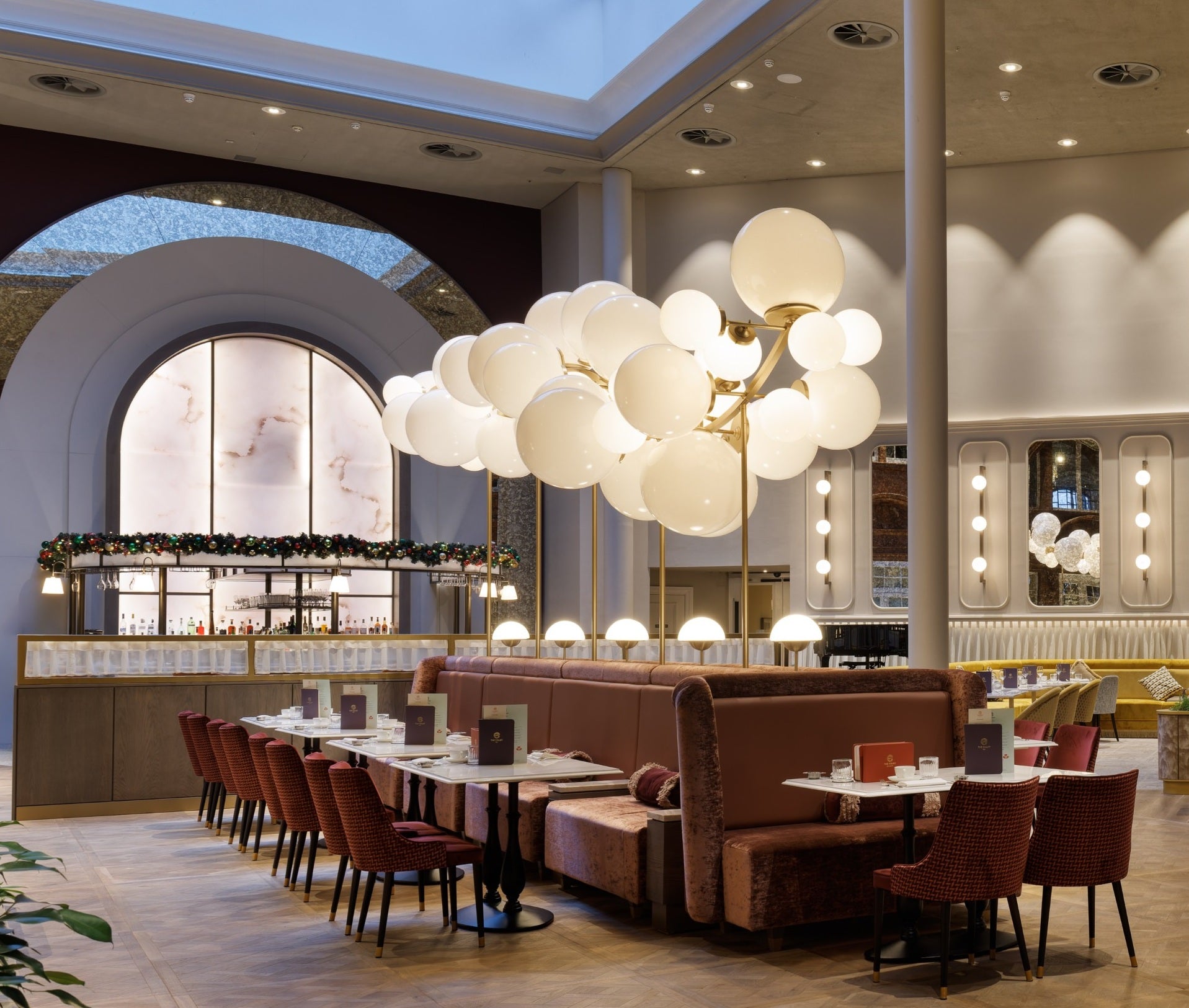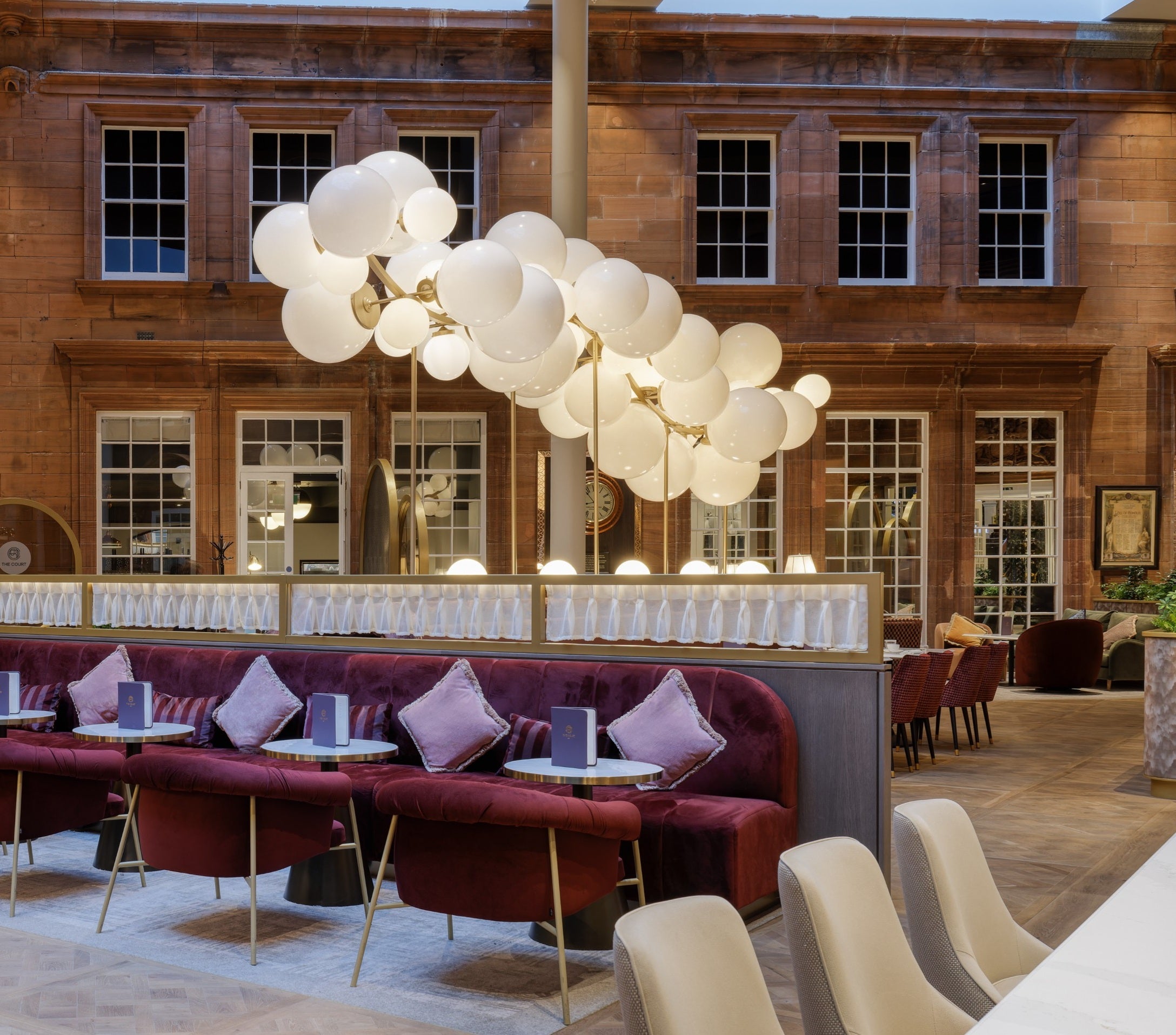 Blending mid-century influences with historic grandeur, our bespoke spine and globe light forms the centrepiece of The Court—a striking installation designed to enhance the guest dining experience while paying homage to the past.