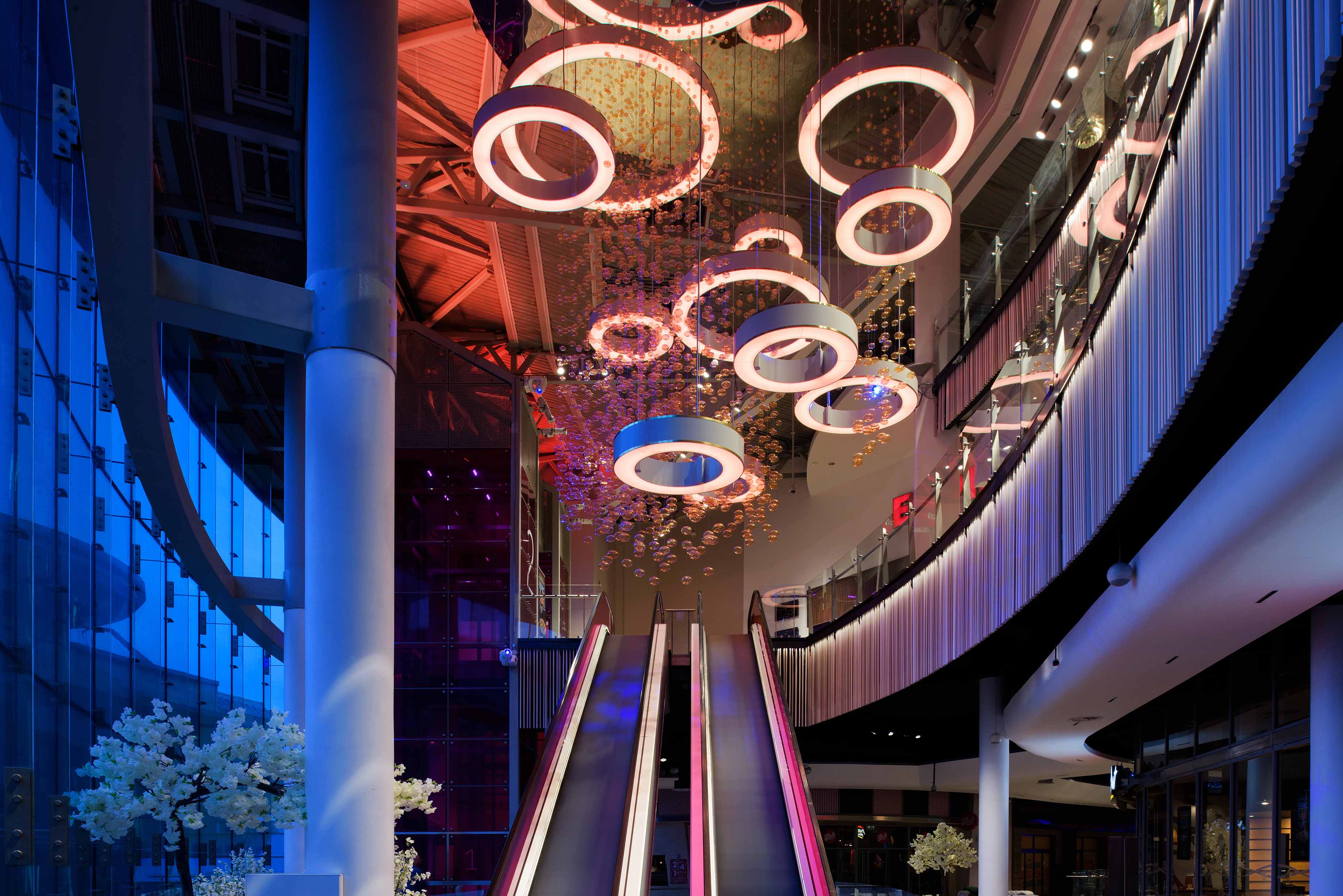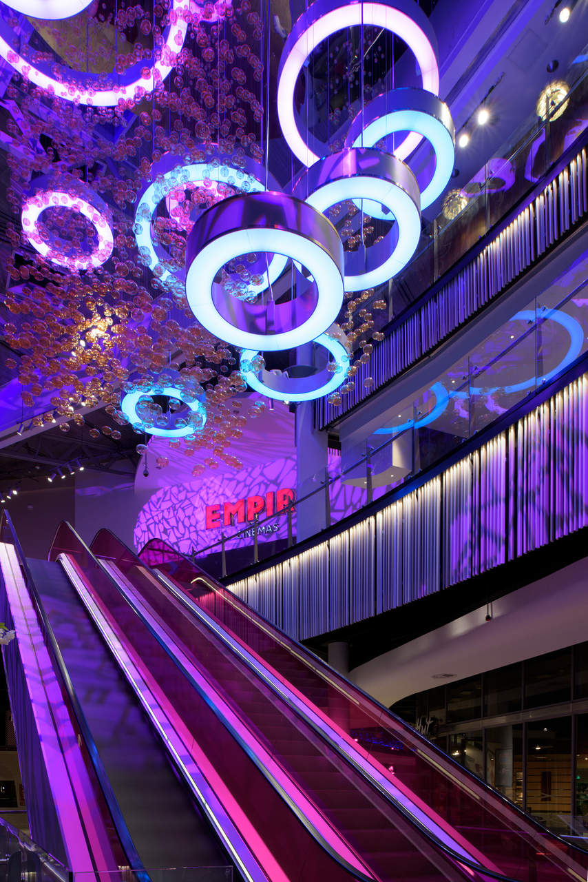The Gate, Newcastle's premier leisure and entertainment centre, completed a multi-million-pound refurbishment. At the heart of this transformation, designed by Faulkner Browns, is the main entrance lobby and the triple-height circulation area. The bespoke rings and glass installation create a spectacular focal point for the building's multitude of enticing entertainment operations and a strong sense of destination to the eight million people who visit annually.