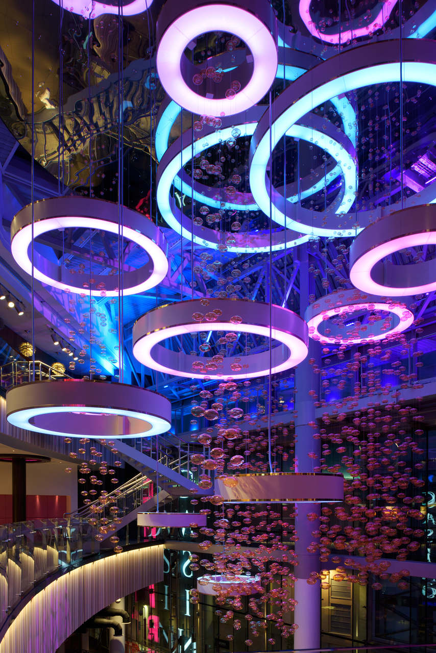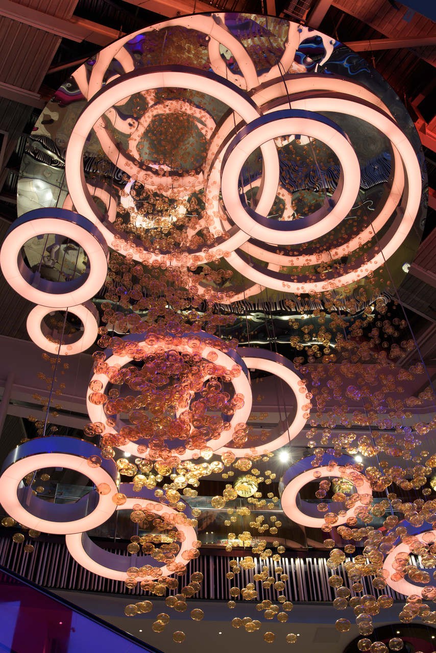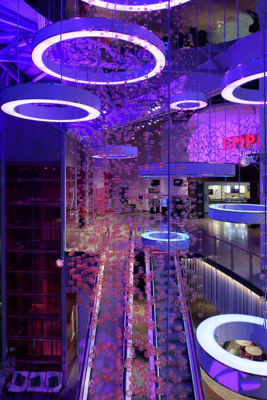 Each of the bespoke rings can be illuminated by the internal LEDs and controlled using it's DALI dimming system, either individually or collectively. This amount of control meant that each bespoke ring could be colour changed and crossfaded from one element to another. Completing the overall presentation are over 4,000 champagne tinted elliptical 'bubble' glass decorations which produce a beautiful illusion of light and reinforce the luxury lighting feel. They can create everything from a subtle sense of opulence to a more vibrant atmosphere of celebration dependent on the mood required.