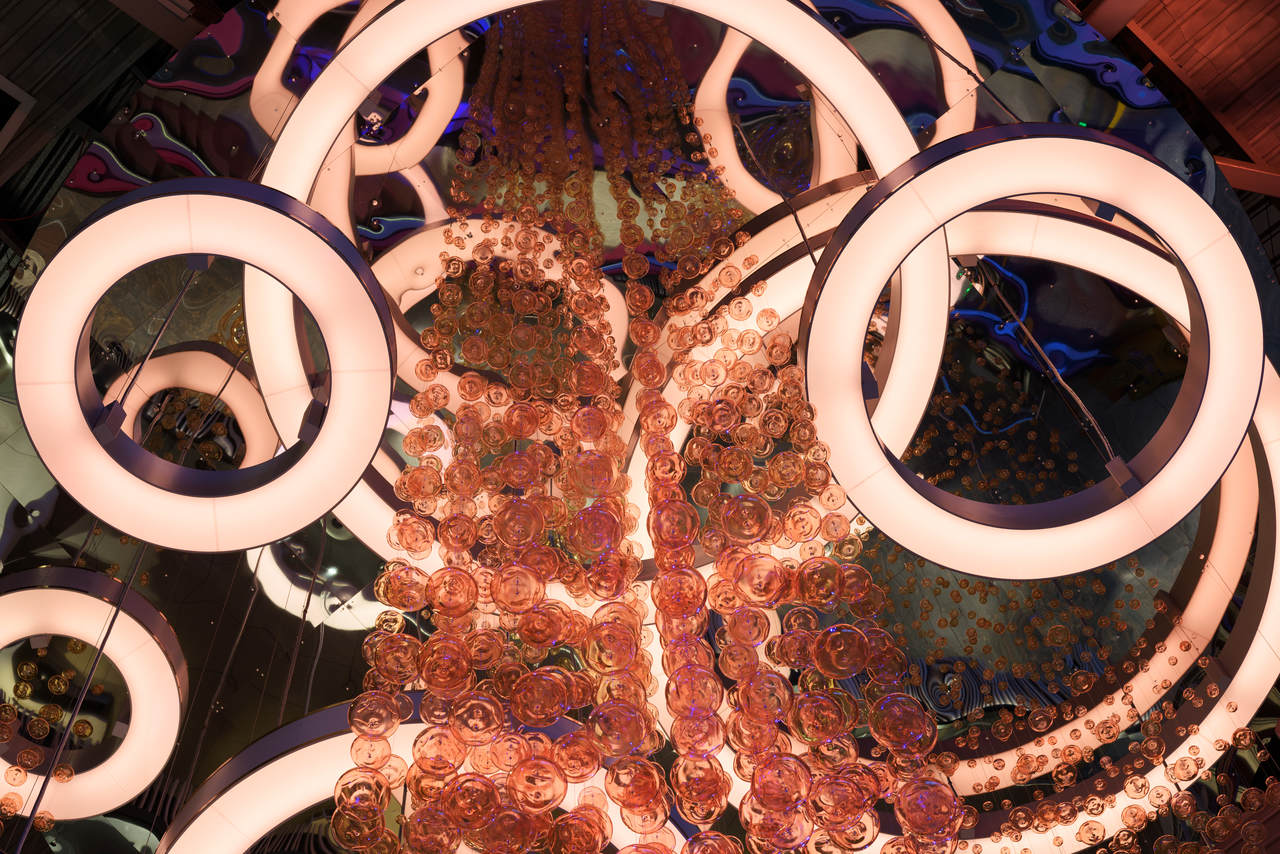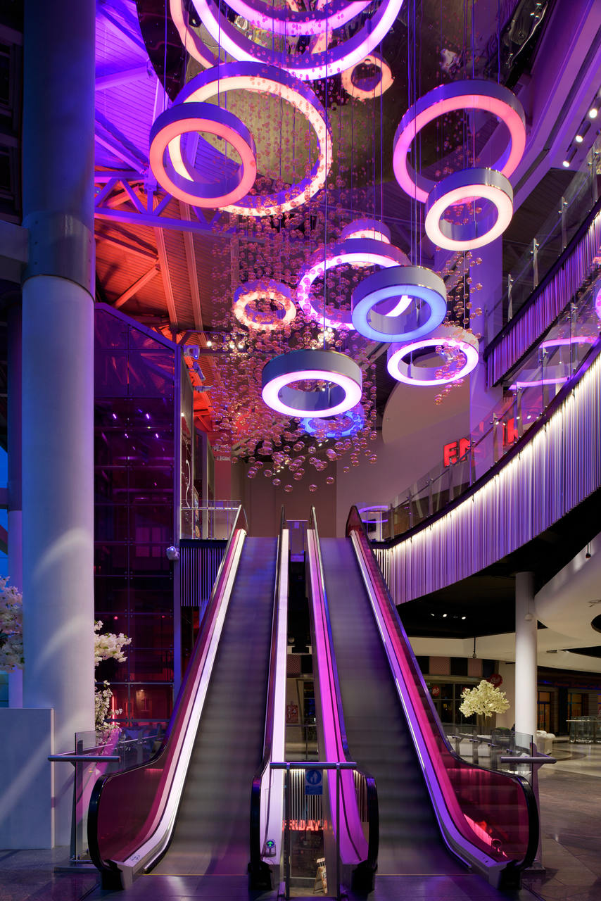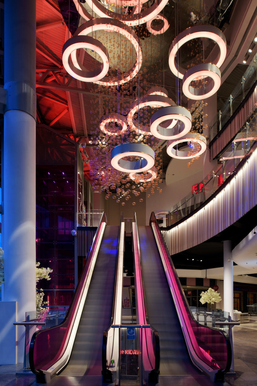 Each of the bespoke rings can be illuminated by the internal LEDs and controlled using it's DALI dimming system, either individually or collectively. This amount of control meant that each bespoke ring could be colour changed and crossfaded from one element to another. Completing the overall presentation are over 4,000 champagne tinted elliptical 'bubble' glass decorations which produce a beautiful illusion of light and reinforce the luxury lighting feel. They can create everything from a subtle sense of opulence to a more vibrant atmosphere of celebration dependent on the mood required.