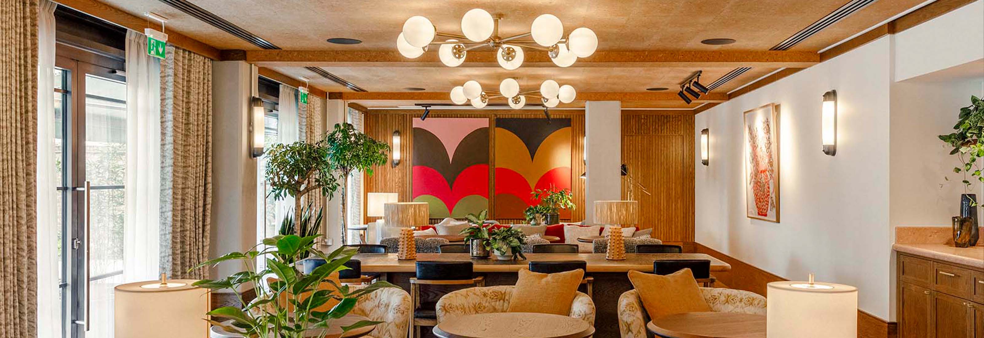The Gessner's communal lounge doubles up as a workspace for residential professionals to work, study and relax. The intimate space has been adorned with gorgeous wood panelling inspired by modern Scandinavian trends, abstract artwork, and beautiful brass accents. The area is haloed by two of our 8-arm brushed antique brass chandeliers, each complete with a set of matt opal glass globes that softly diffuse the light they produce. Other communal areas benefit from a 5-arm variation of the same chandelier.