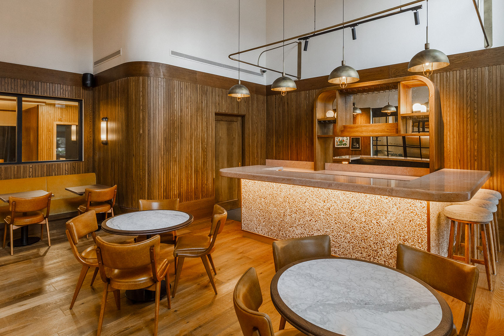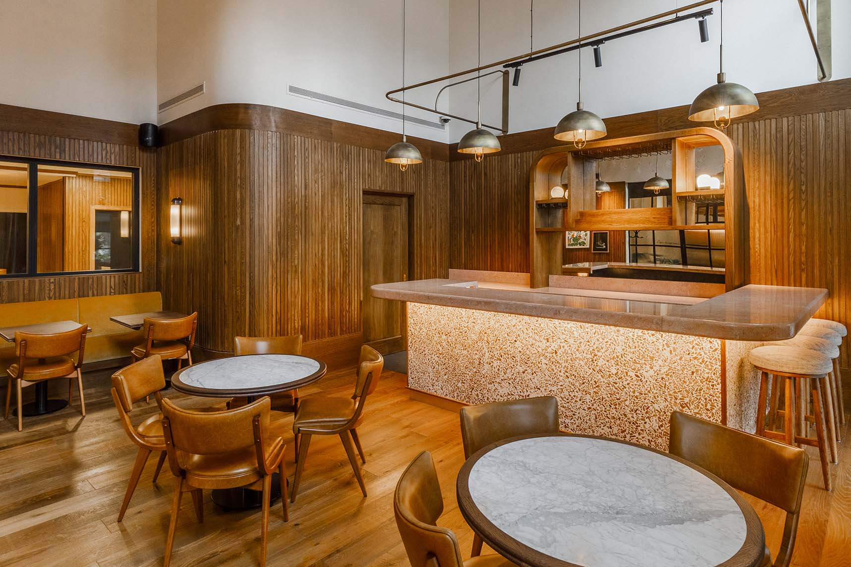 A handcrafted wall-mounted frame above the communal cafe counter houses four antique brass domes that provide an intimate aura to those sitting beneath. Our skilled artisans have carefully curved the edges of the frame using our in-house CNC router, which provides a smooth finish to the frame.