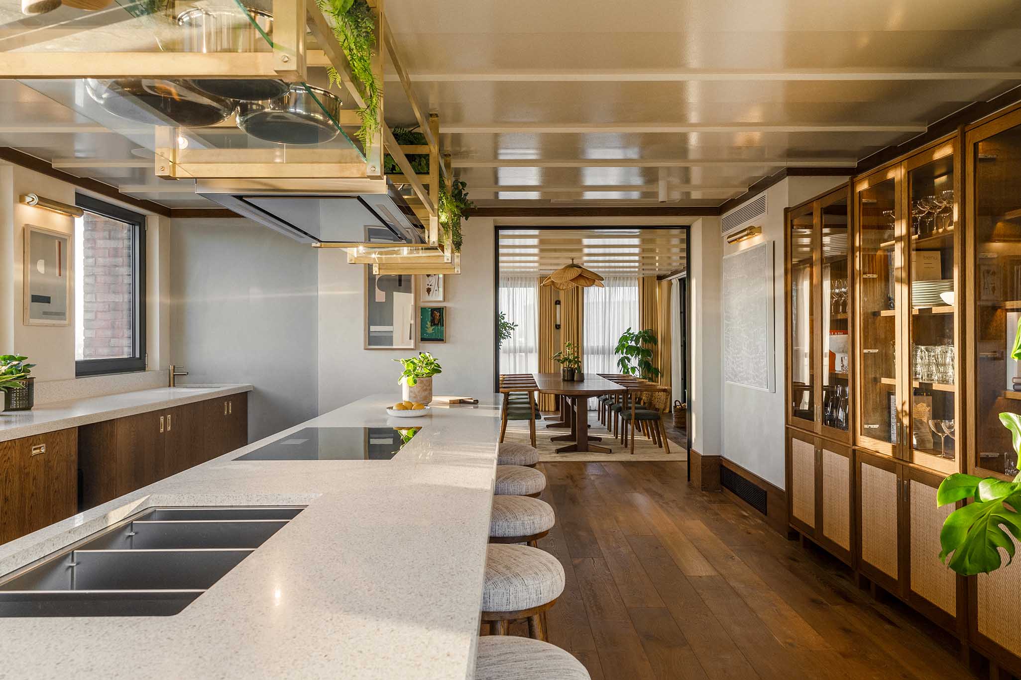 The private dining room adjoined by a kitchen sets a very comfortable scene with a long dining table that sits ten people, surrounded by a log burner and lush greenery to complete a natural aesthetic that marries with the wooden flooring and panelling. Fixed flush to the ceiling above the table is our brushed antique brass pendant, complete with fabricated leaves that have been crafted using wood. The leaves take on the form of real leaves, showing intricate detailing that follows the veining patterns typically found on natural leaves.