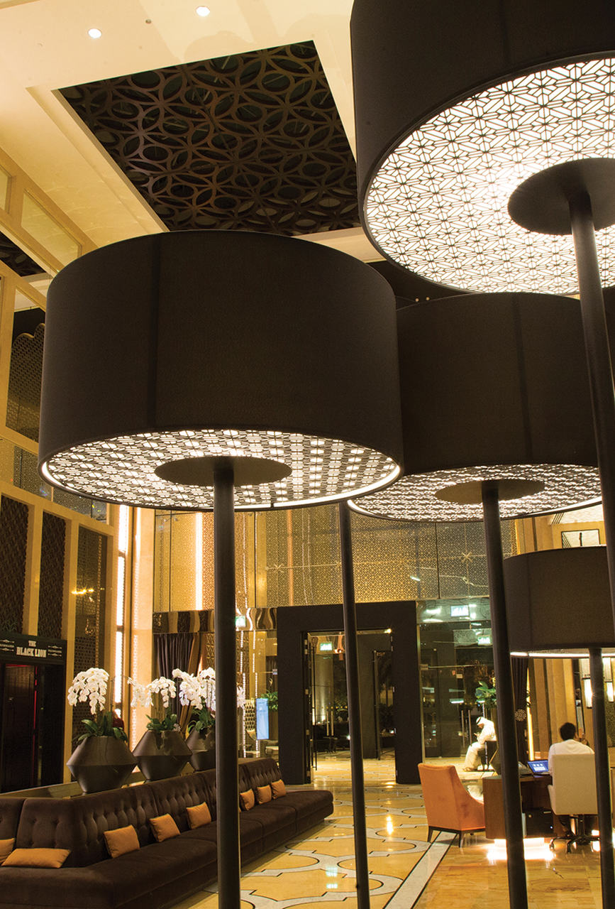 Continuing the dramatic theme, a group of giant floor lights decorate the lobby seating area. With such high ceilings, LDW Interiors wanted bespoke floor lights that weren't dwarfed by the space. Therefore each bespoke floor light is more than 3.5m tall and completed with luxury black cotton circular shades and fretwork diffuser. They form an enticing display that sets a contemporary tone.