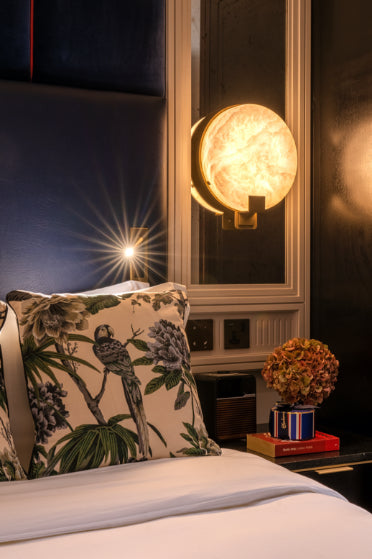 Presented on the suite's bedside walls are a duo of our delicately handcrafted Ophelia wall lights. With an antique brass finish and an ivory alabaster diffuser, they give the Deco-inspired fixtures an elegant form that perfectly complements their surroundings. Designed with versatility and comfort in mind, the handcrafted wall sconces blend a classic shape with a modern touch and natural materials to create a genuinely versatile bespoke design.