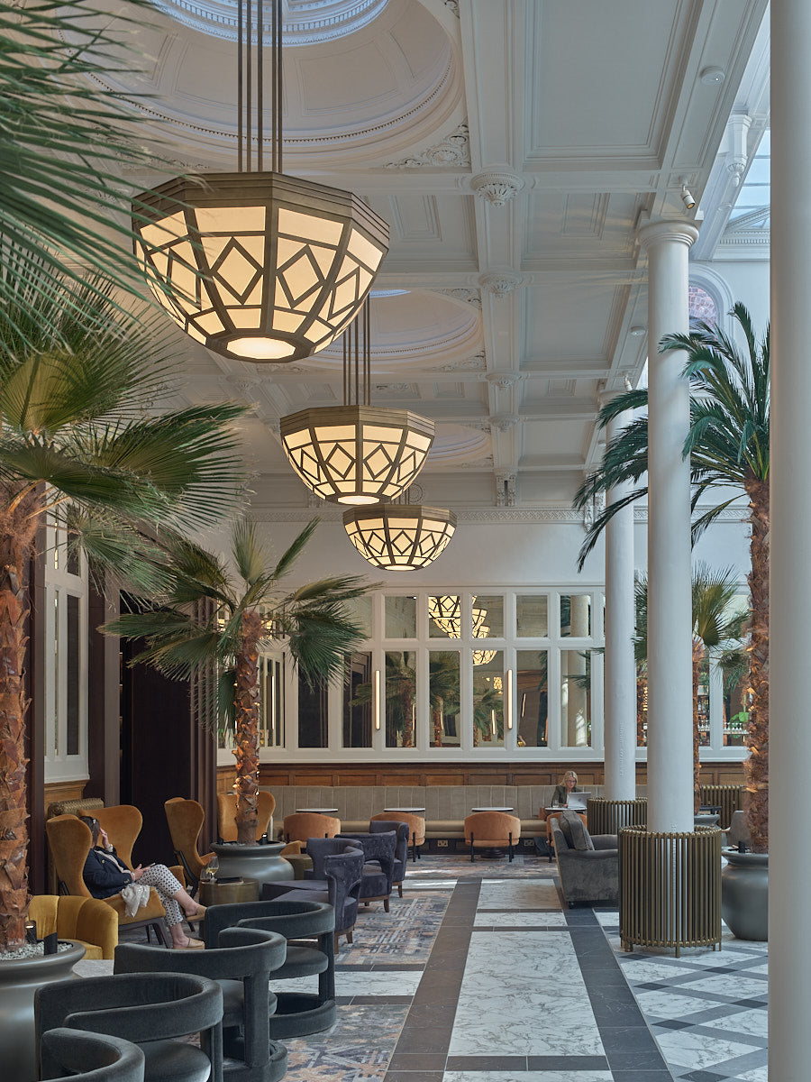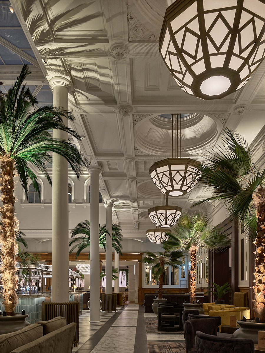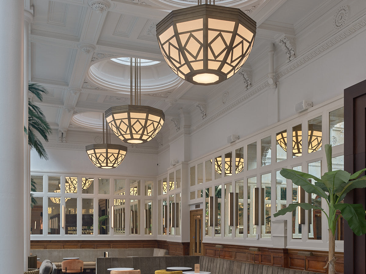Ten exceptional decagonal chandeliers are a big feature of the Palm Court area. Each fitting comprises stunning laser-cut medium antique fretwork that houses matt opal windows to create an atmospheric ambience that perfectly complements the purpose-built skylight above. Elsewhere, a remarkable Deco-inspired brass and glass chandelier brings real extravagance to its surroundings. The metre-tall fixture was created by housing a hand-finished medium antique frame with 73 bespoke formed glass pieces, culminating in a floral likeness when viewed from beneath to create an immersive experience.