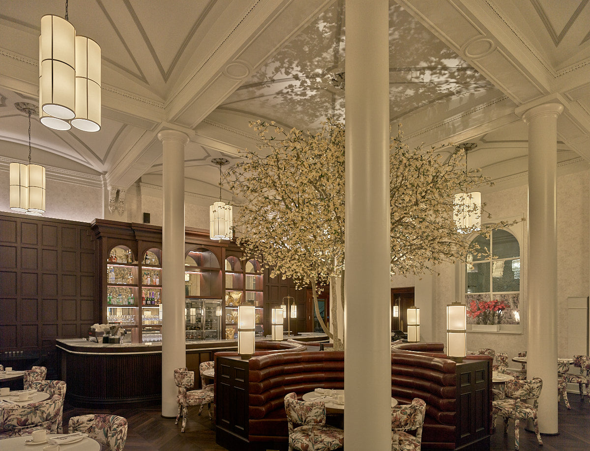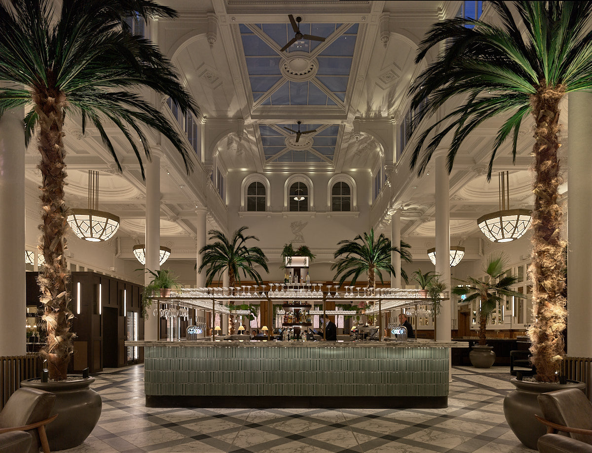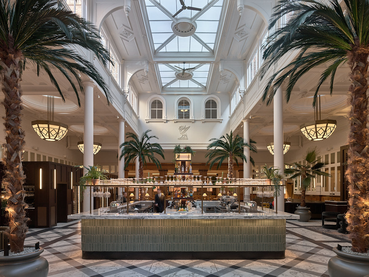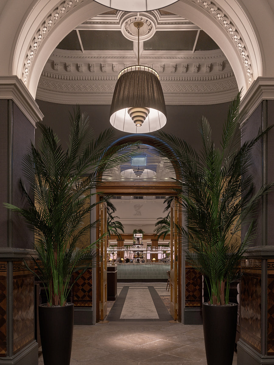 Ten exceptional decagonal chandeliers are a big feature of the Palm Court area. Each fitting comprises stunning laser-cut medium antique fretwork that houses matt opal windows to create an atmospheric ambience that perfectly complements the purpose-built skylight above. Elsewhere, a remarkable Deco-inspired brass and glass chandelier brings real extravagance to its surroundings. The metre-tall fixture was created by housing a hand-finished medium antique frame with 73 bespoke formed glass pieces, culminating in a floral likeness when viewed from beneath to create an immersive experience.