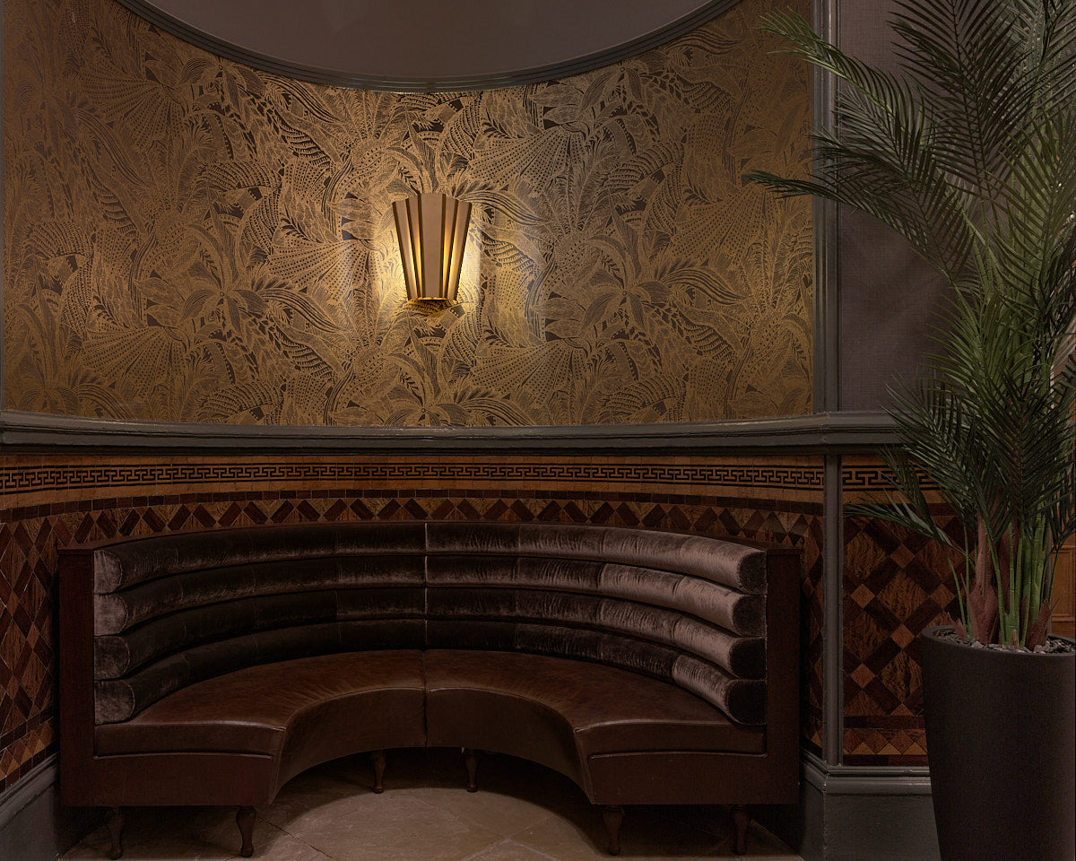 Medium antique brass has been used to create most of the fittings that Northern Lights supplied to the hotel, including several pendants, chandeliers, table and wall lamps throughout the venue. Wall lamps from our Signature Collection also feature in the hotel. Our Linton wall lamp combines delicately crafted Old English brass and faux alabaster to create a dramatic veining pattern unique to each fixture. Deco-inspired Scala wall lamps offer soft illumination in the restaurant, and the hand-applied tarnished brass finish pairs beautifully with the fixture's warming bidirectional aura.