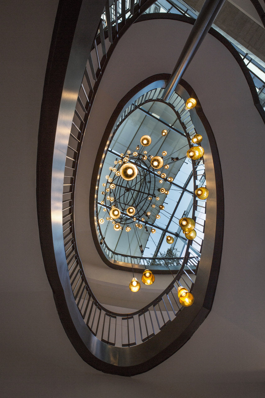 The chandelier over the main stairwell was another piece of bespoke lighting that needed to have a presence without being overpowering. HBA wanted the design to focus on the fine details such as gold-leaf caps on the glass shades and the extra loops of flex to fill open space. We attended site to help oversee the installation of this fitting due to the complicated location and fixing points.