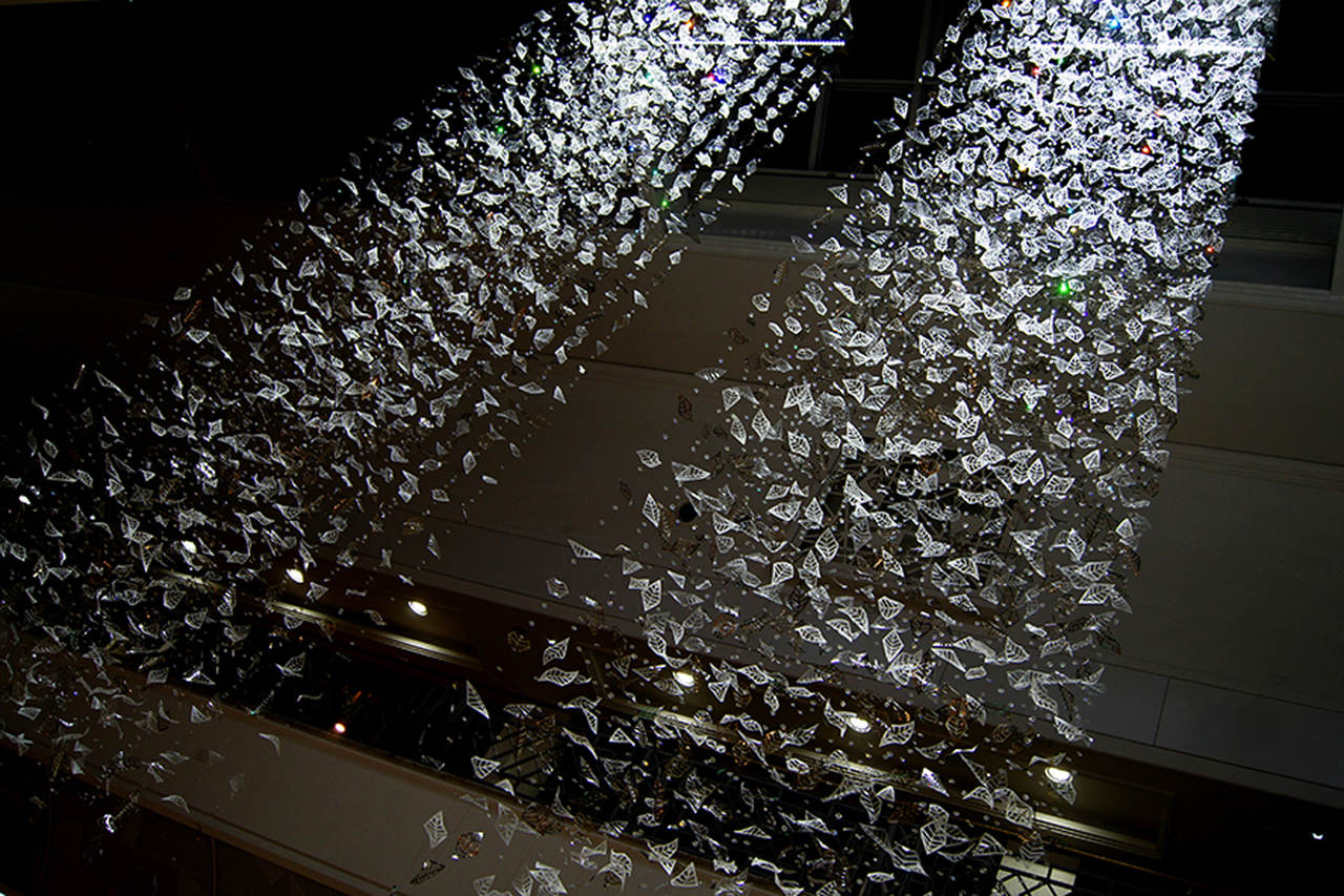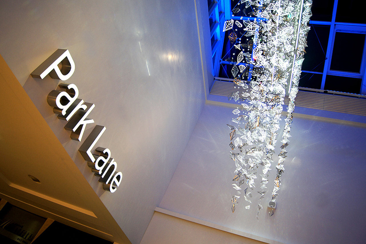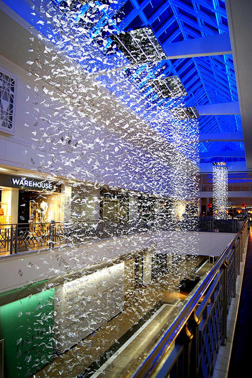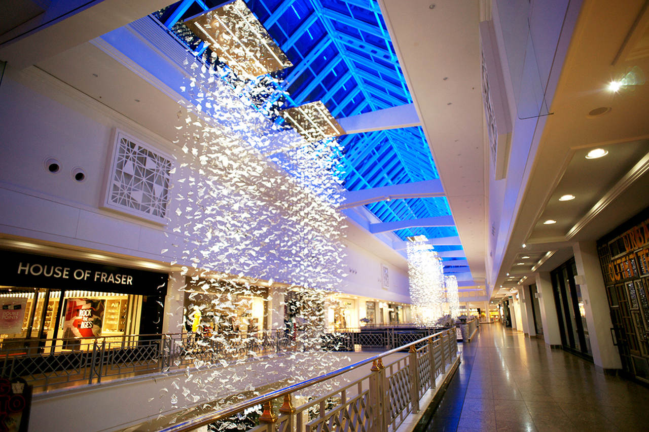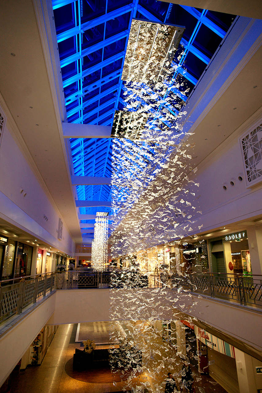 Eight bespoke chandeliers were installed in the main hall with another one at the mall entrance. Each bespoke chandelier rains down from the glass roof, which from a distance makes them look like blocks of light with shimmering details and from closer up the leaves appear to be ethereal, almost floating in the air.