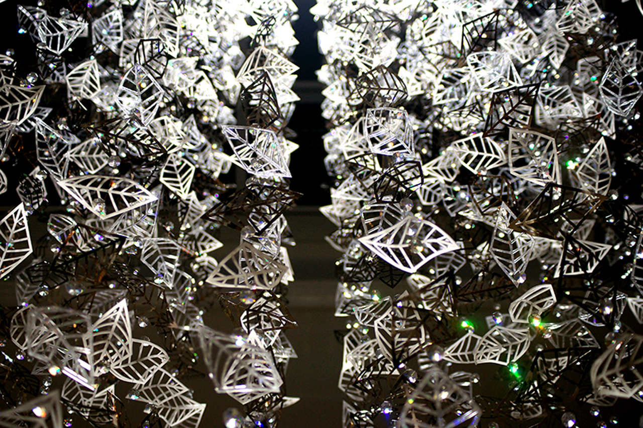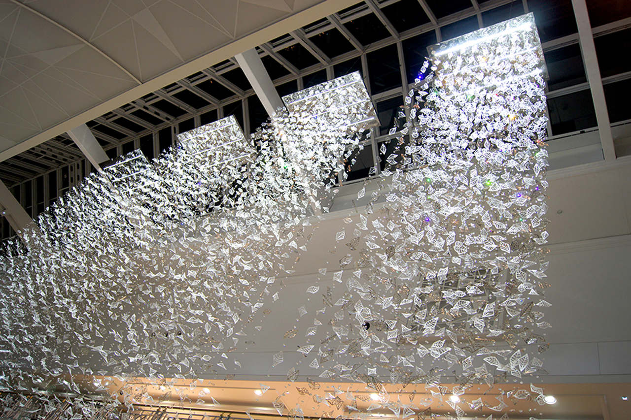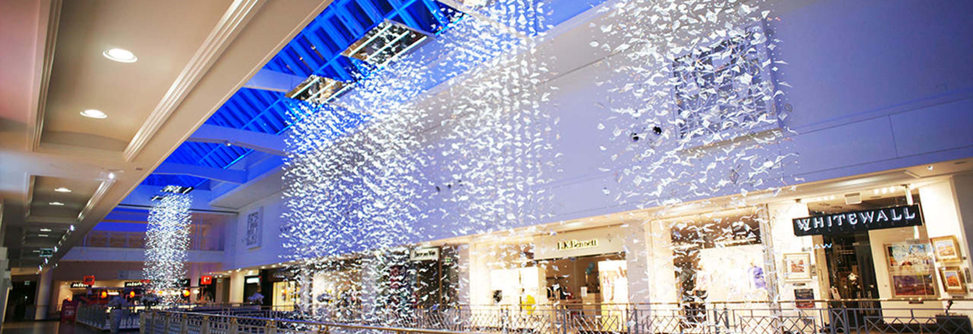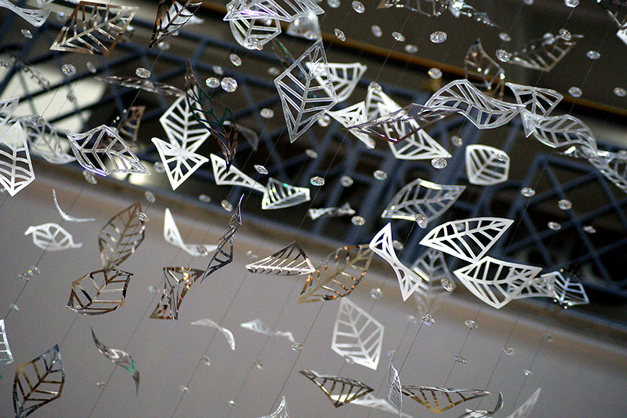 Eight bespoke chandeliers were installed in the main hall with another one at the mall entrance. Each bespoke chandelier rains down from the glass roof, which from a distance makes them look like blocks of light with shimmering details and from closer up the leaves appear to be ethereal, almost floating in the air.